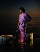 One side off shoulder flowy dress in tri colour ombre. Side thigh-high slit for ease in movement.