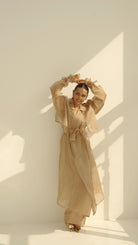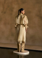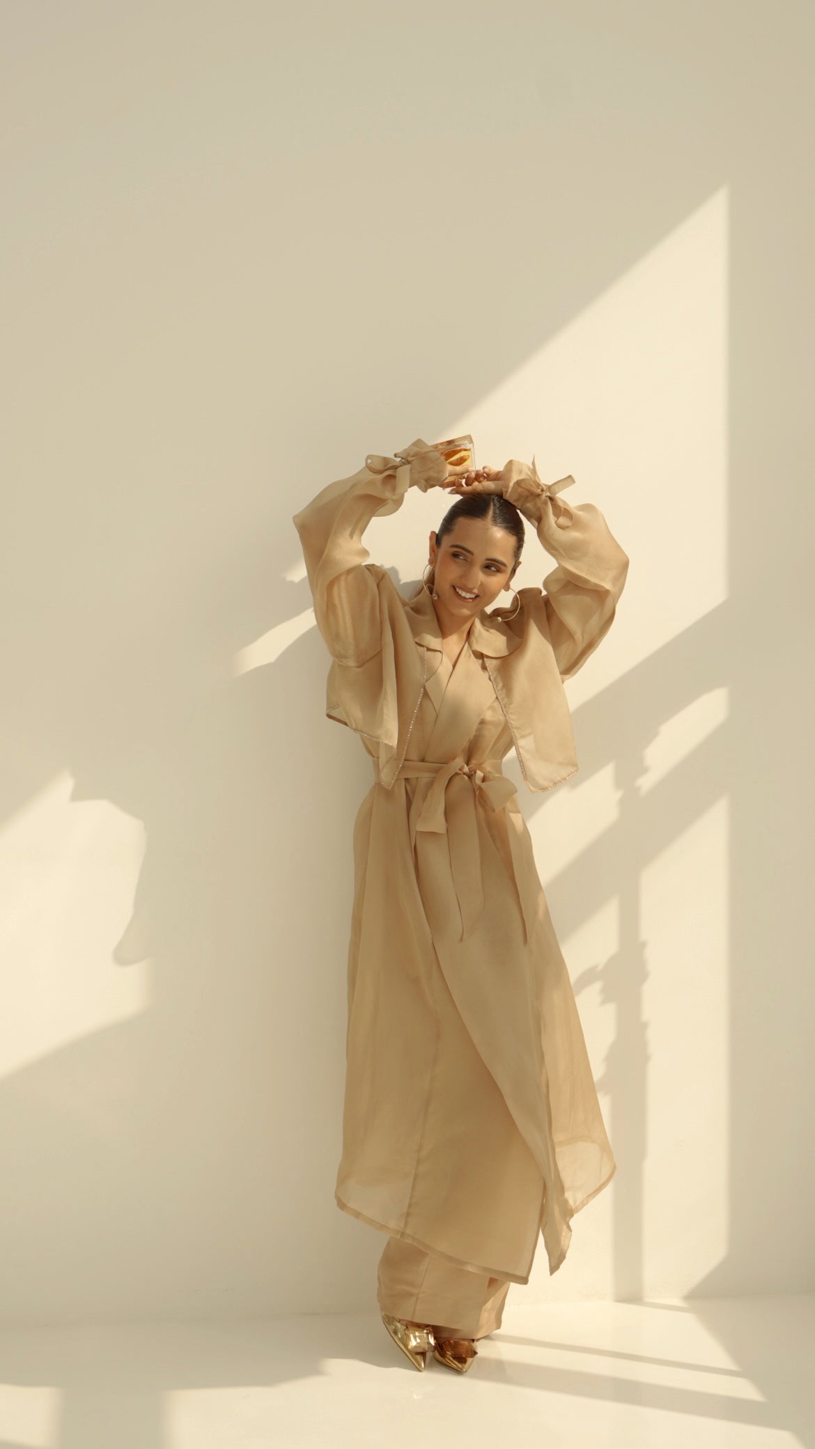 Structured organza trench with crystal definition along the lapel and tie-up detailing along the wrist with belt. Full set includes bustier and boot cut style pants.