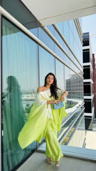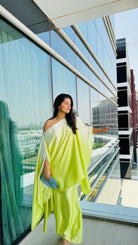 Flowing off shoulder top which can be styled in multiple ways with ombre shaded pants.