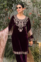 Renaira Phulwani in Bhara Gala Aubergine Zeya Velvet Suit Set