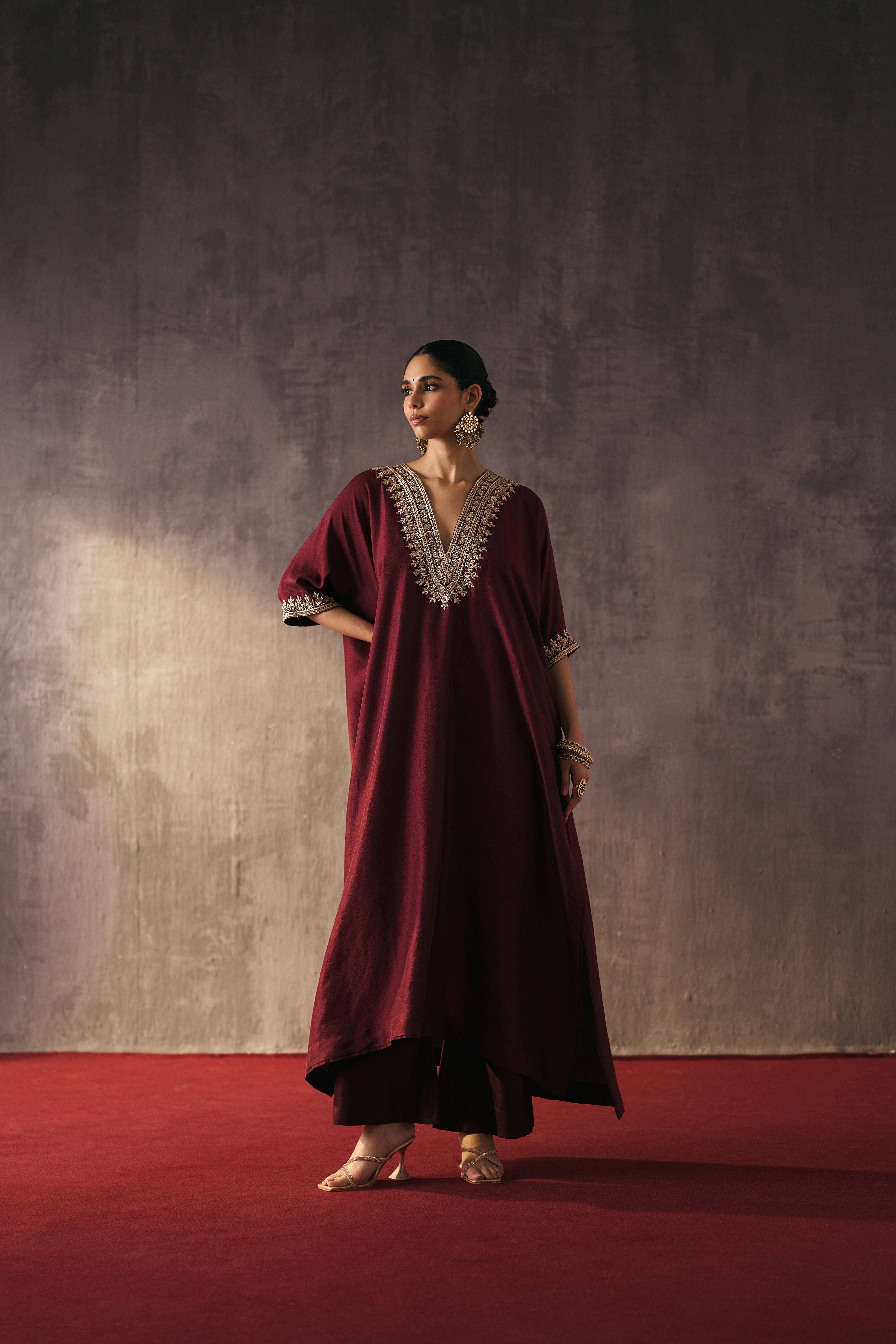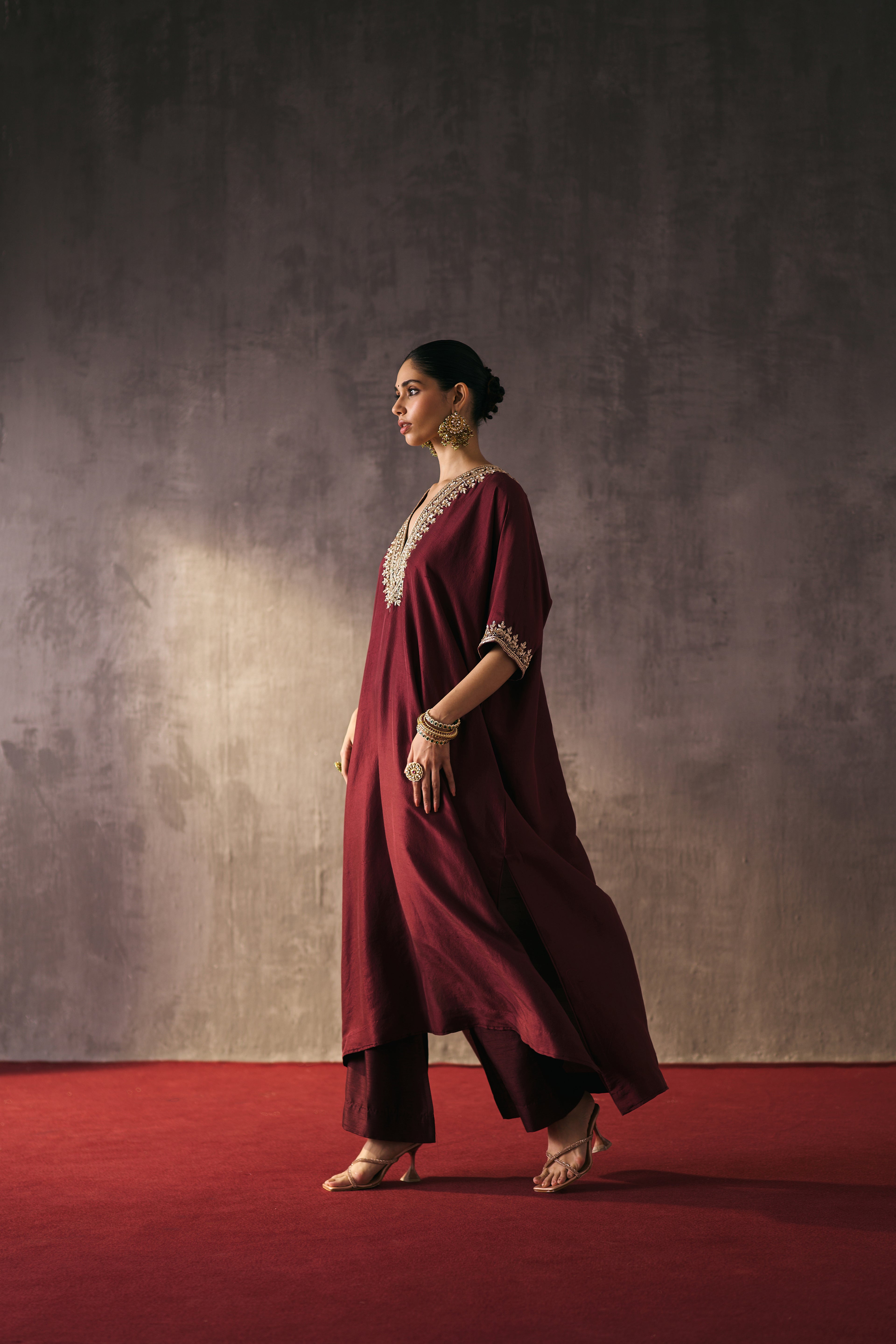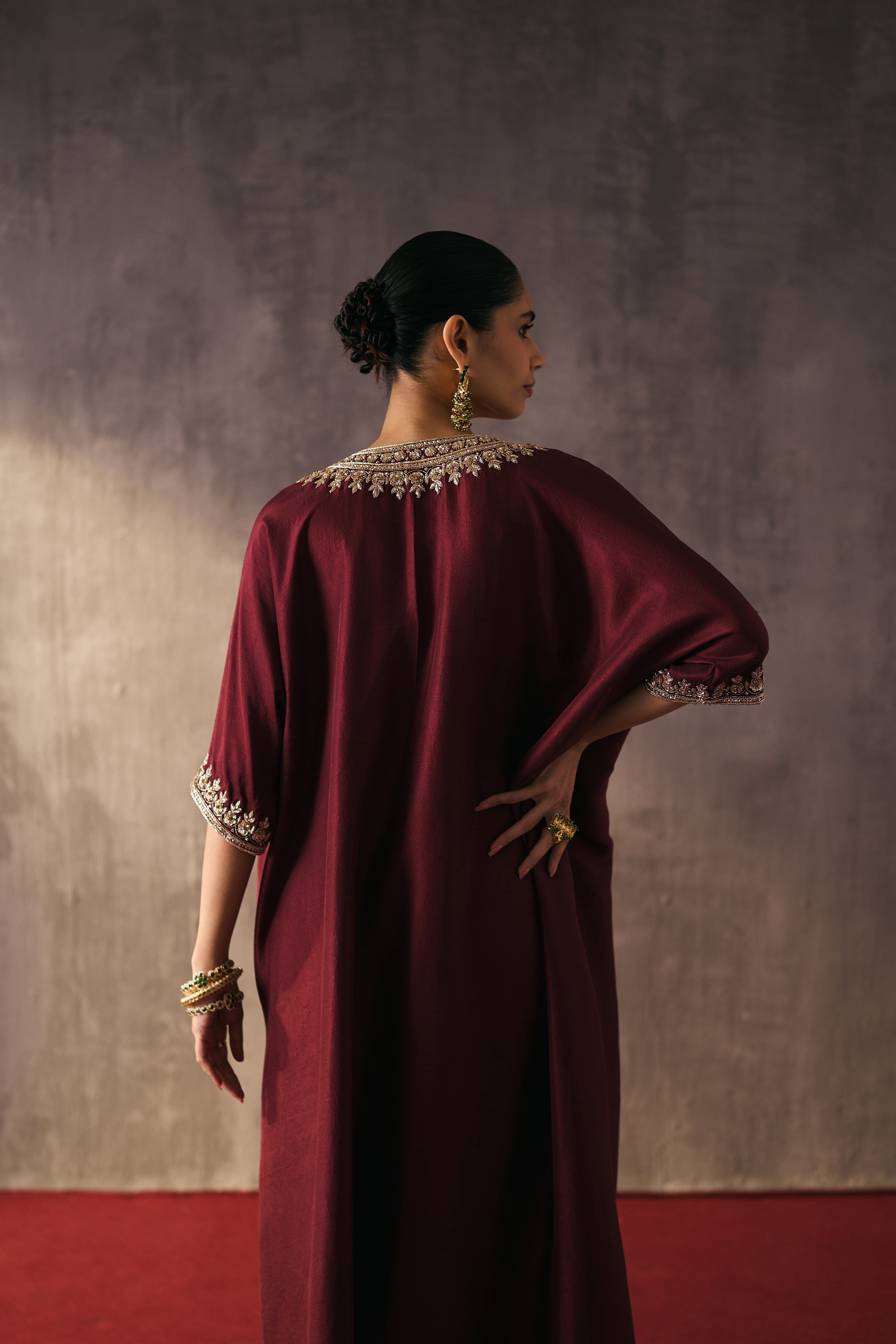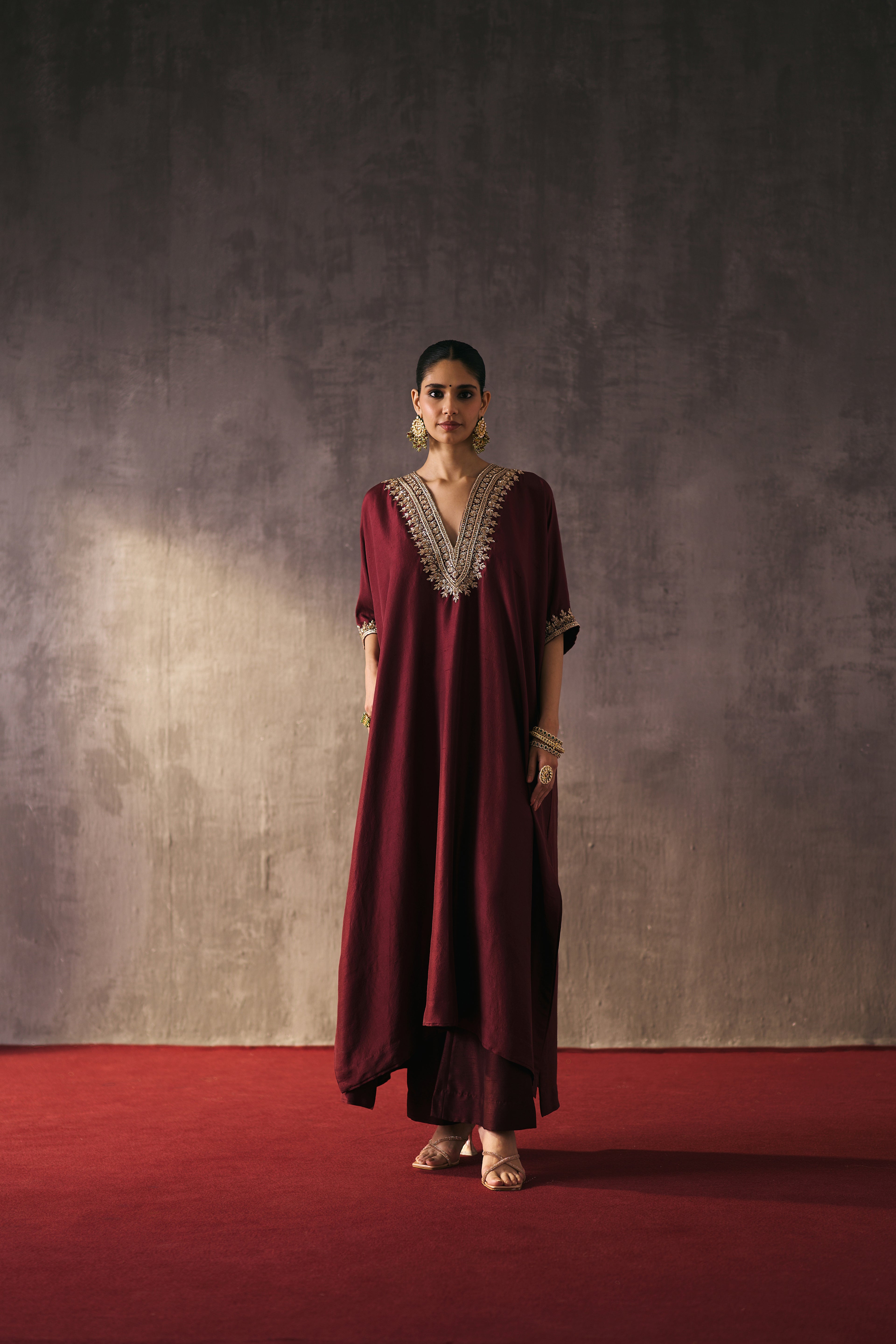 Crafted in pure silk, these flowy, loose-fit kaftans come paired with straight pants — a silhouette of modern ease. Hand-embellished with zari, dapka, and delicate glass accents, each piece is a work of art designed for festive evenings and timeless celebrations.