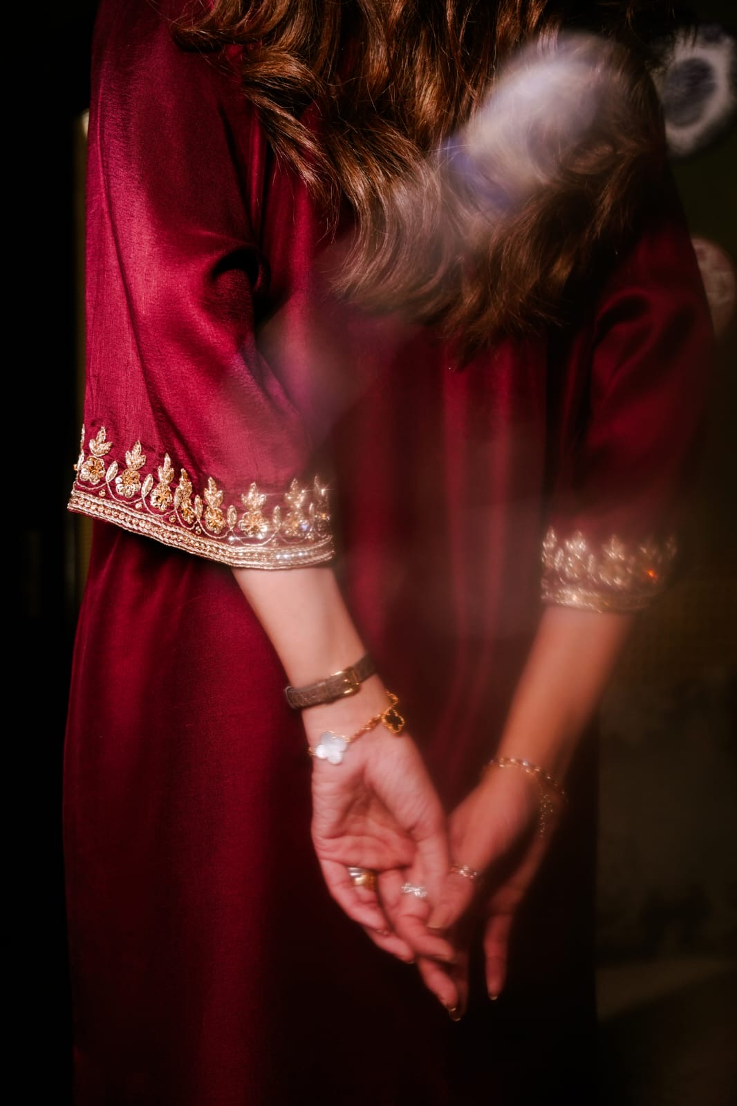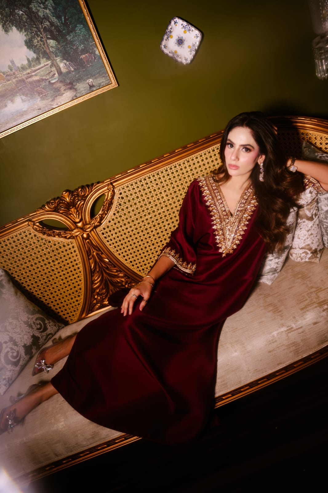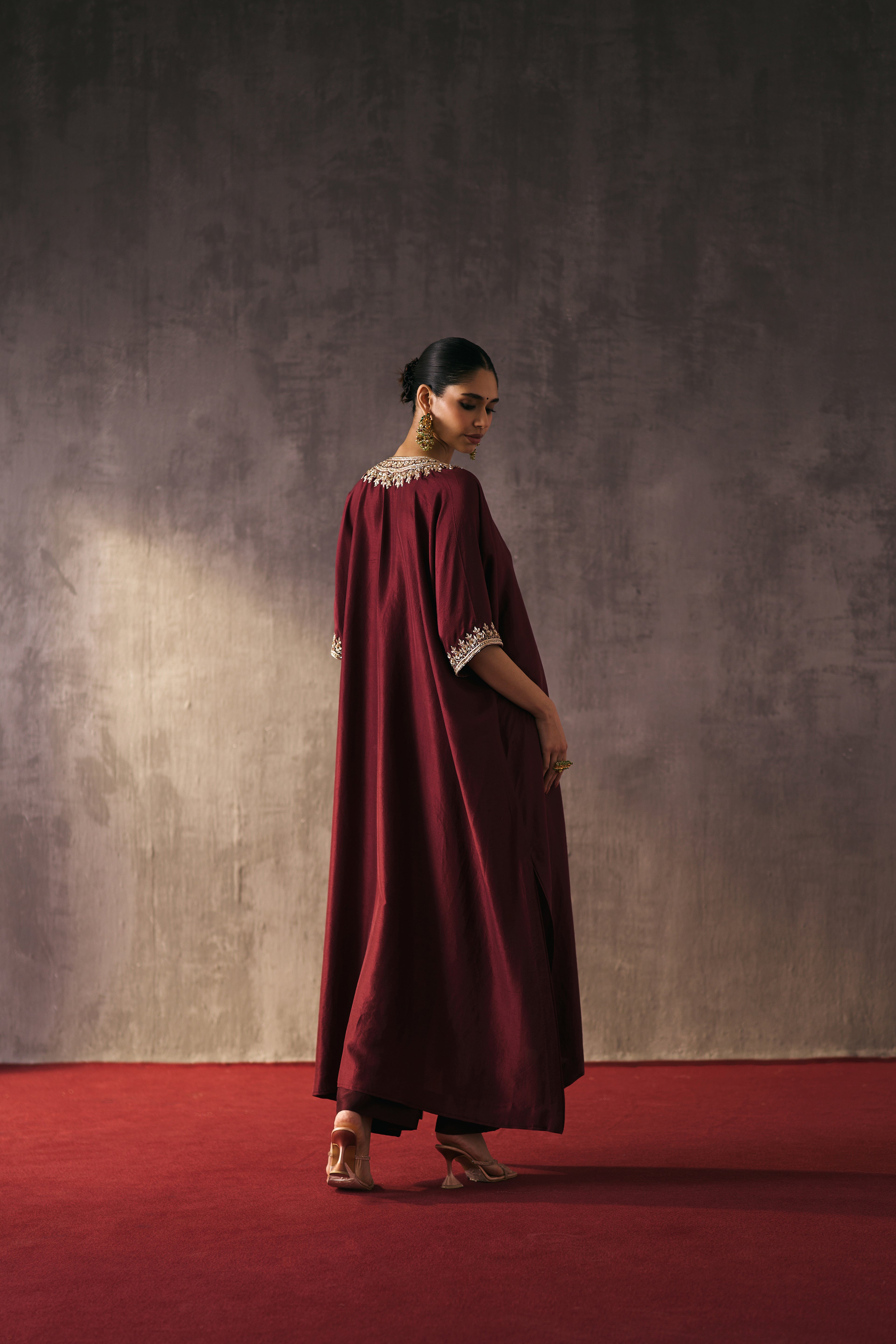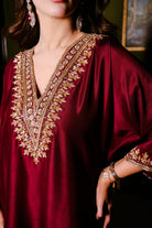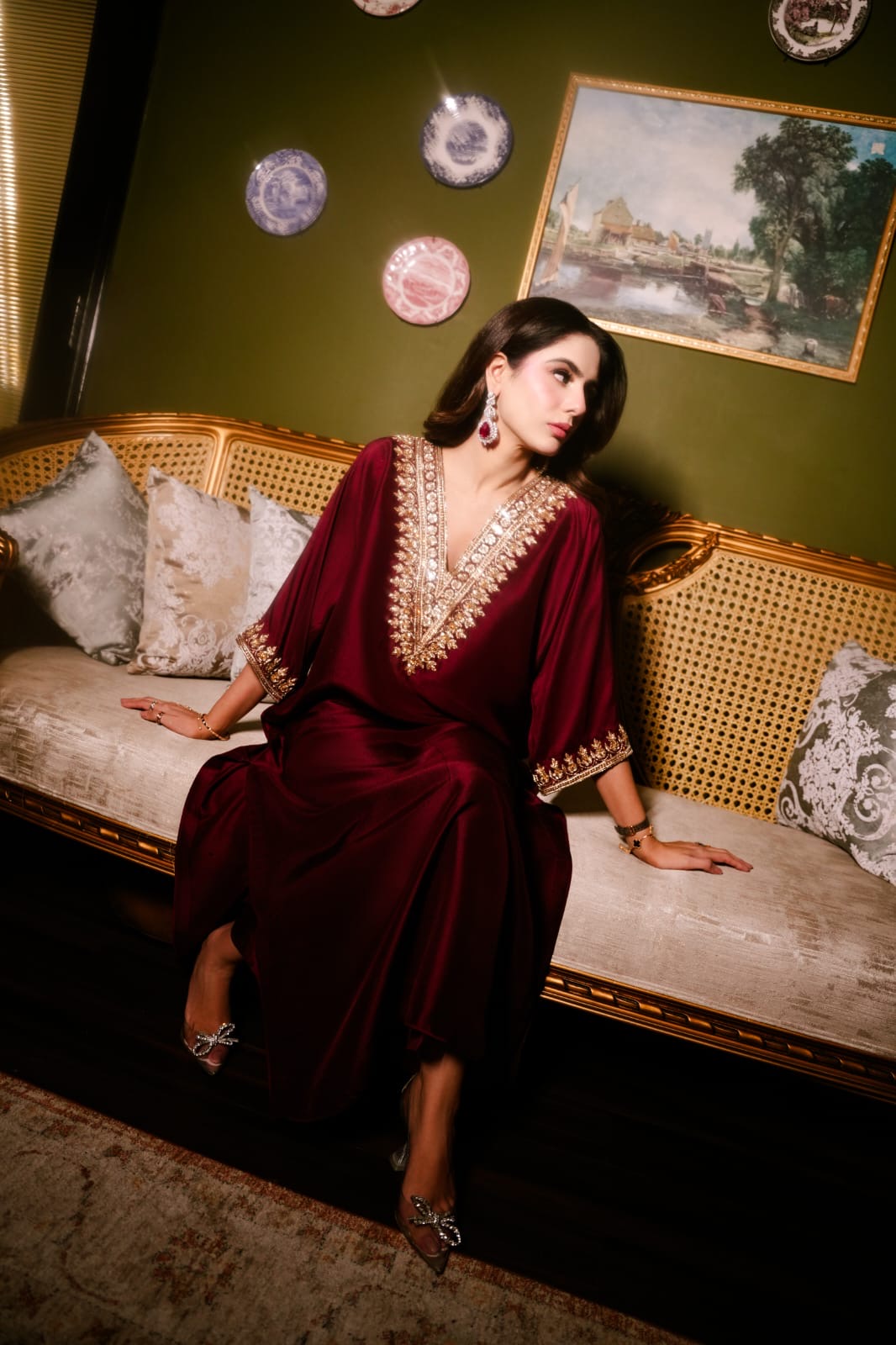 Crafted in pure silk, these flowy, loose-fit kaftans come paired with straight pants — a silhouette of modern ease. Hand-embellished with zari, dapka, and delicate glass accents, each piece is a work of art designed for festive evenings and timeless celebrations.