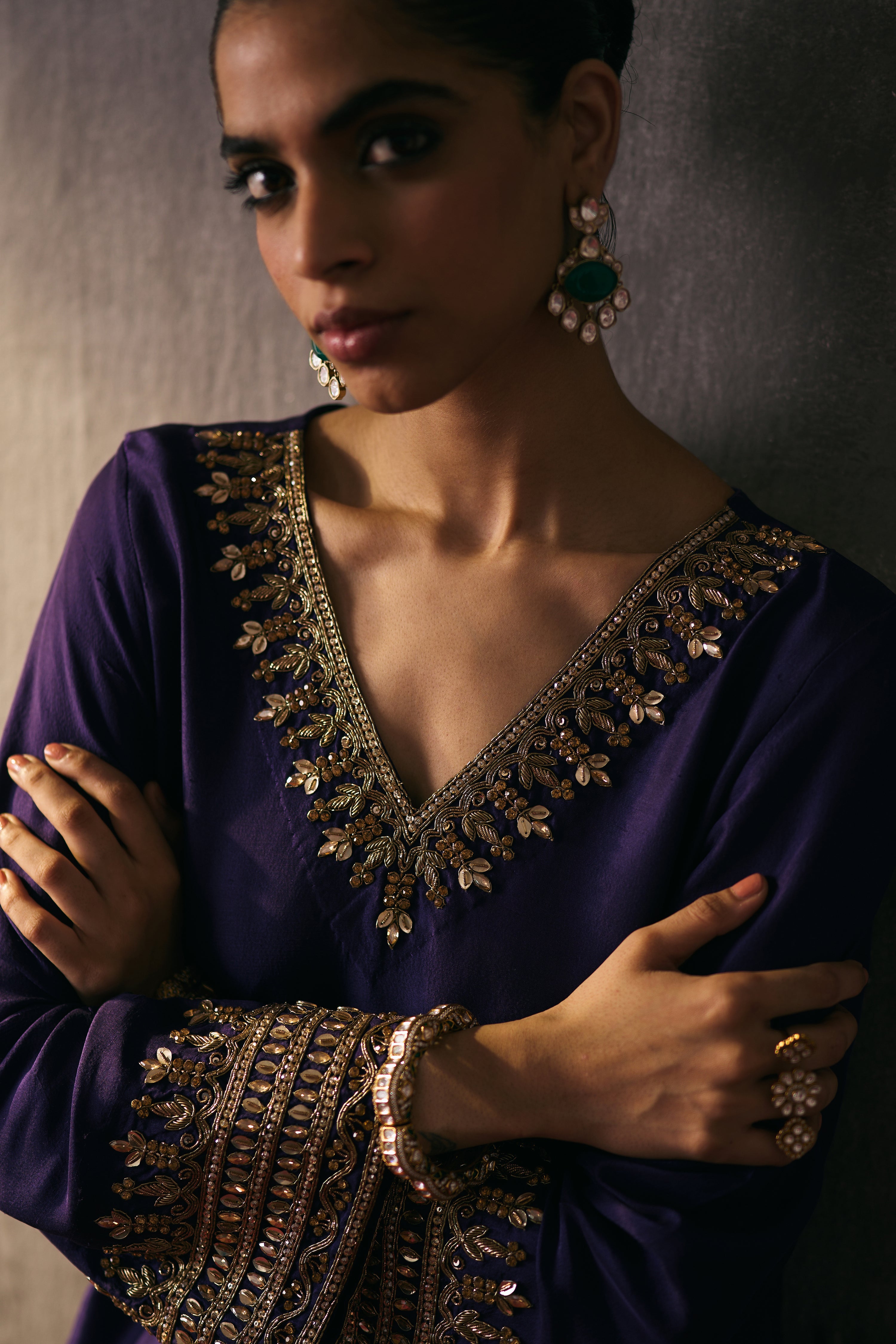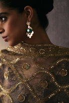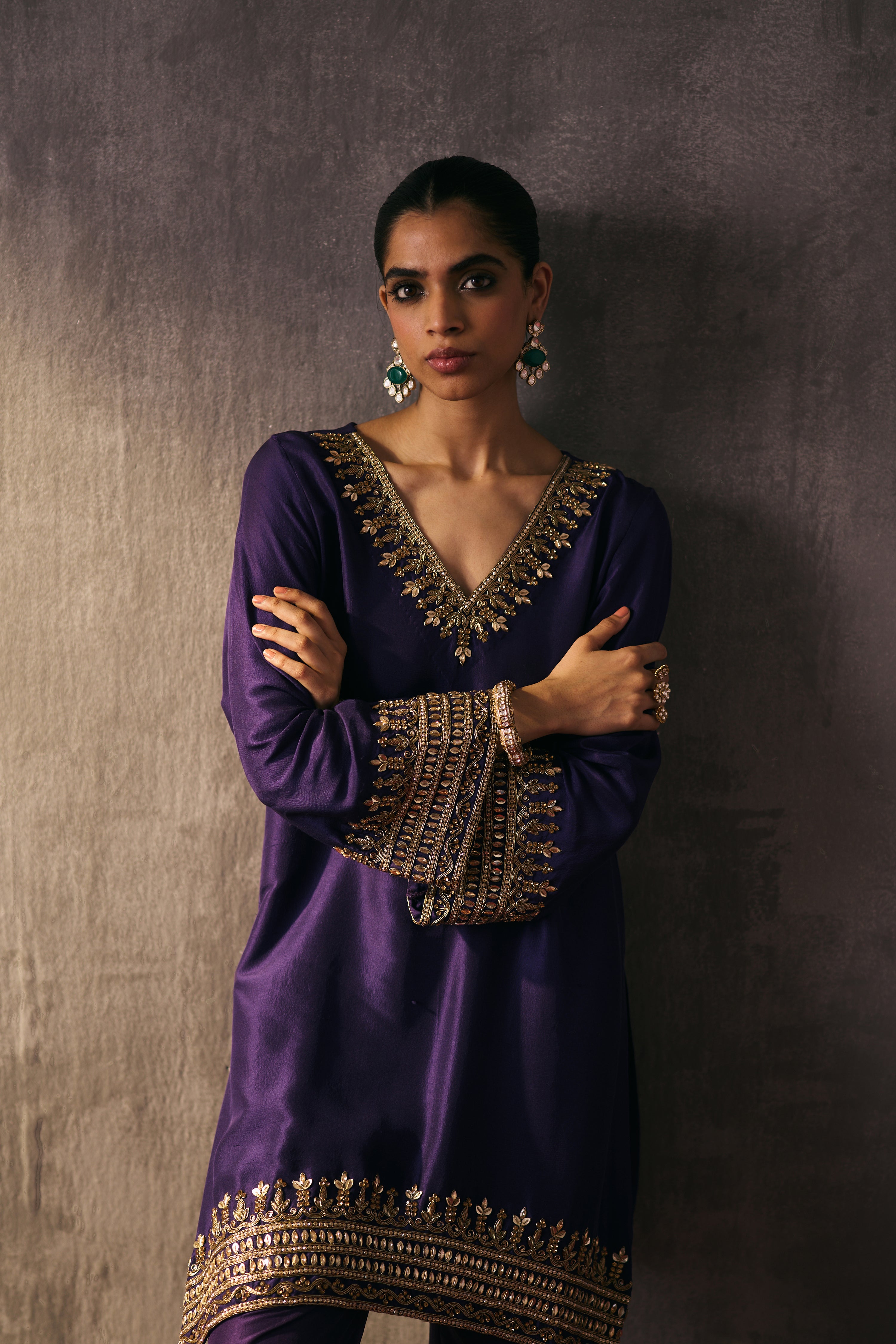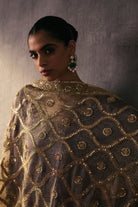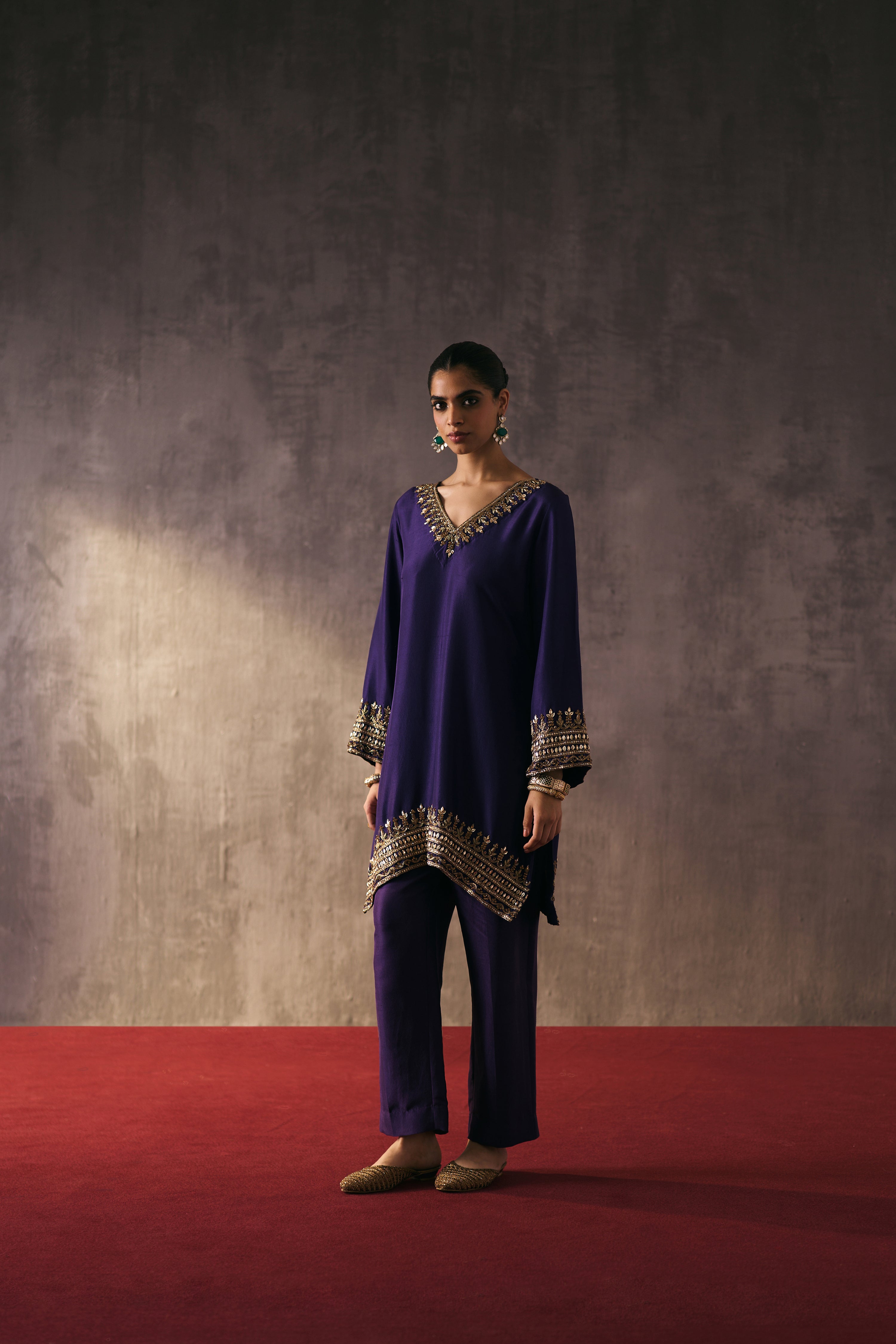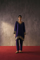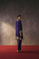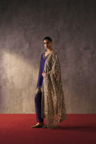 The silk shirt and pants are exquisitely hand-embellished with zari, dabka, and crystal detailing. Meticulously handcrafted, this ensemble blends fluid elegance with a luminous, luxe finish—perfect for elevated celebrations.