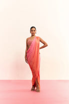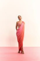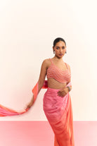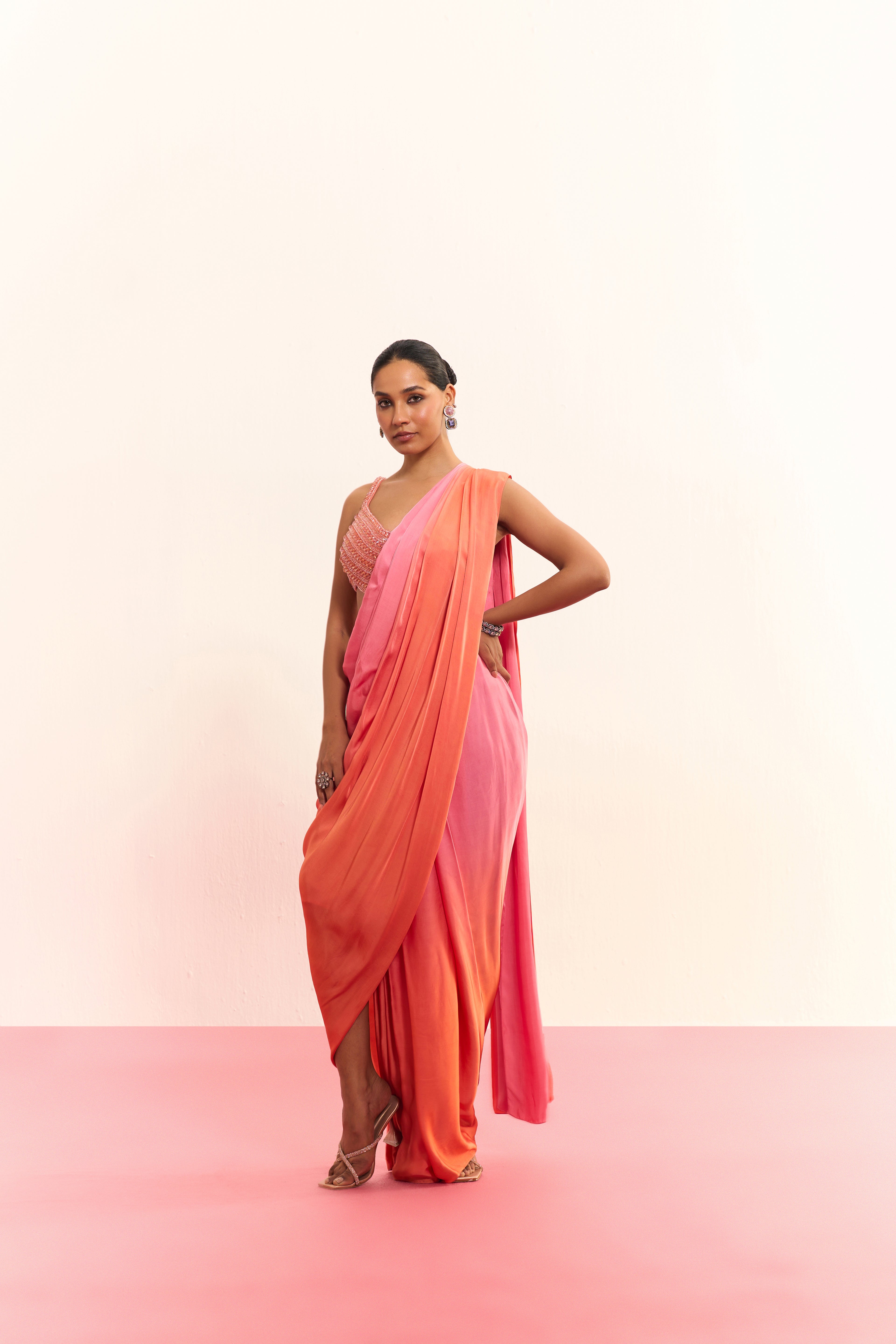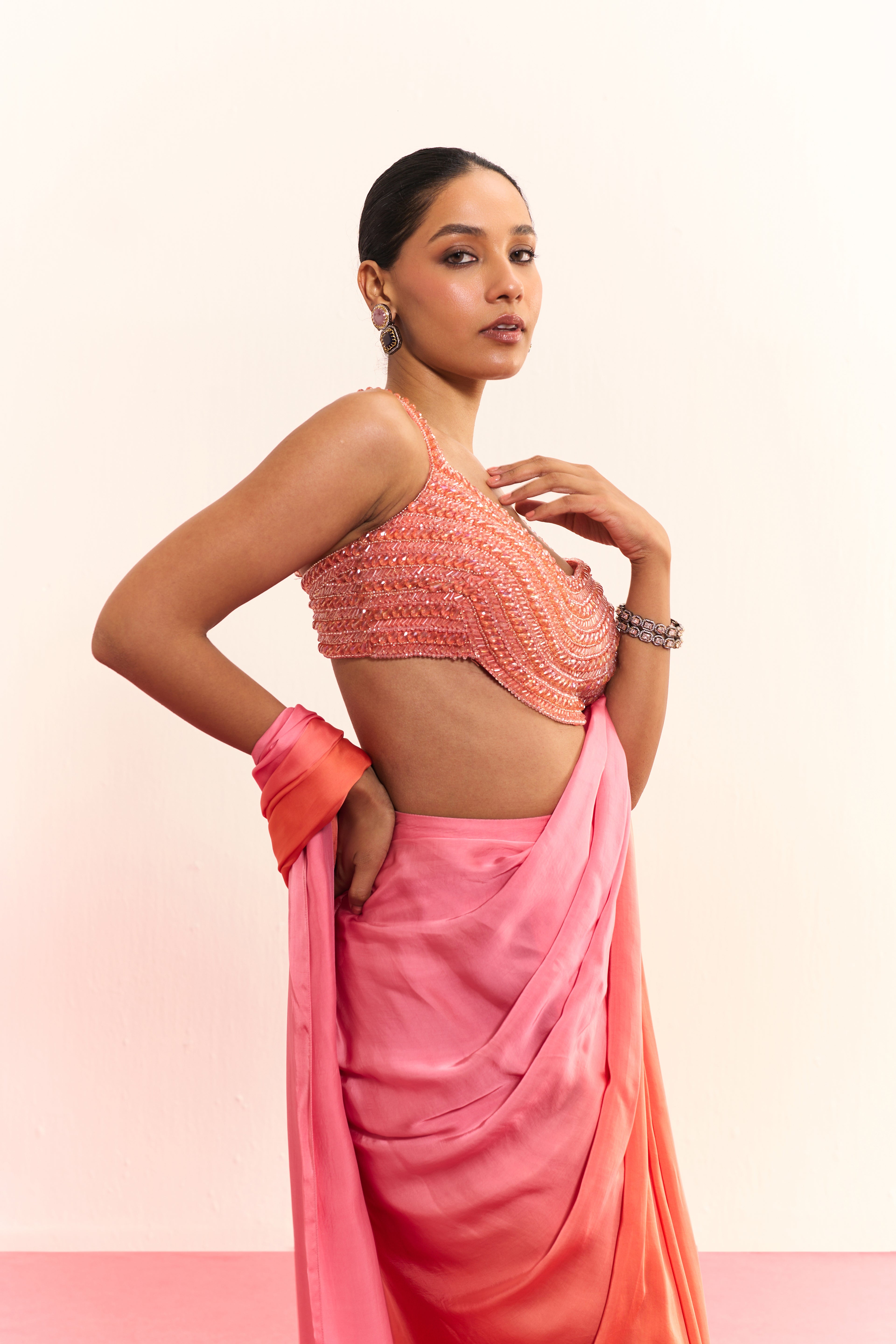 A soft fusion of coral and pink haze shaded lustrous satin pre-draped skirt with front slit, teamed with a crystal embellished blouse.