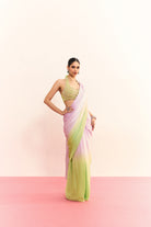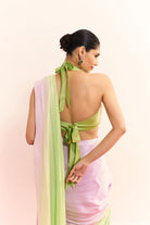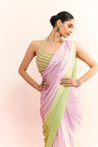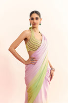 Soft lavender touched with green freshness- shaded lustrous satin pre-draped skirt, teamed with multi coloured crystal embellished halter blouse.
