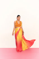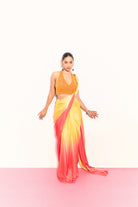 Inspired by festive florals- marigold yellow and orange shaded lustrous satin pre-draped skirt with, teamed with a crystal embellished halter blouse.