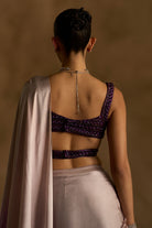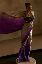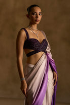 Greyish lavender and purple ombre shaded lustrous satin pre-draped skirt, teamed with cut sleeves blouse, encrusted with glass crystals.