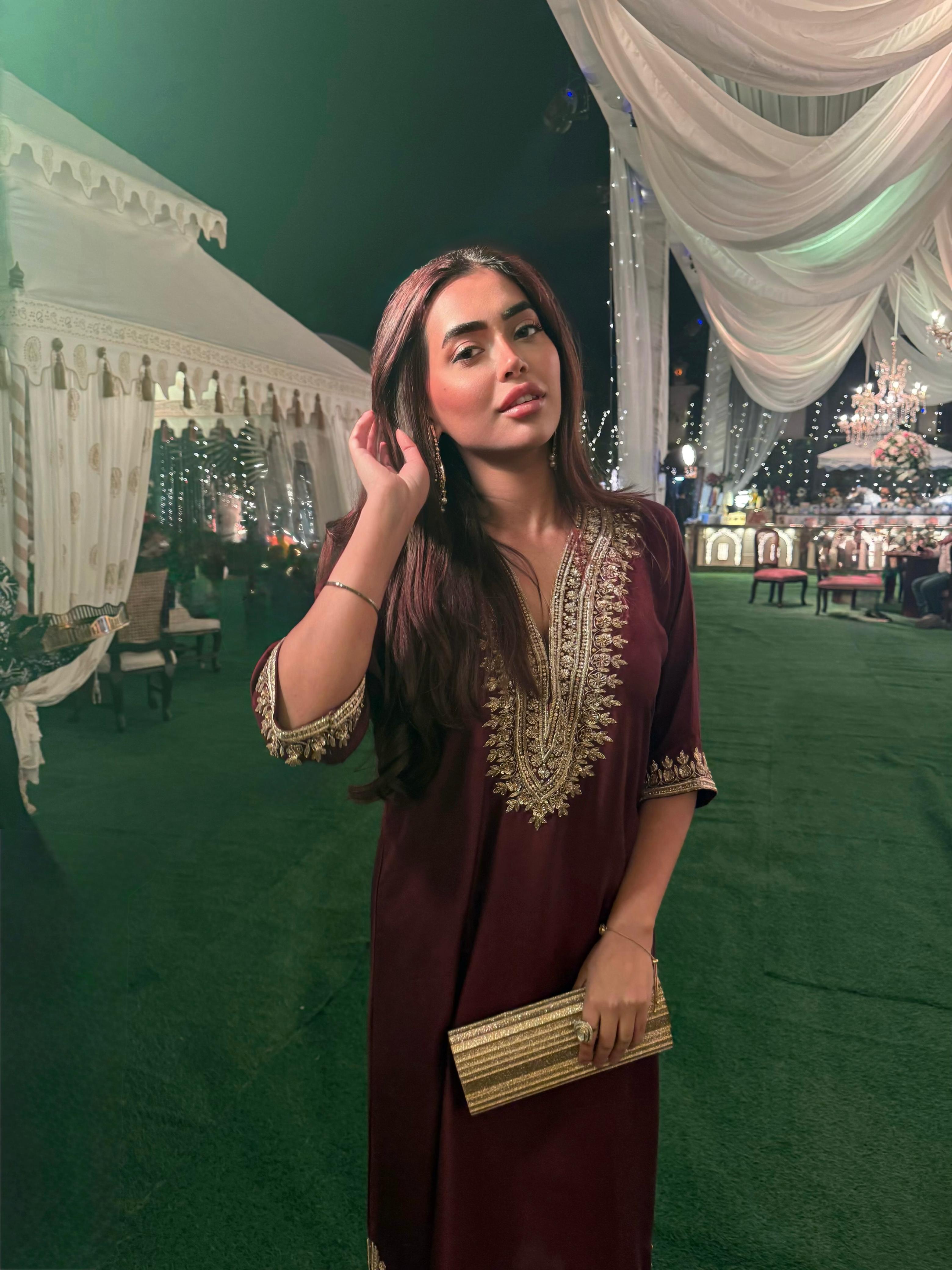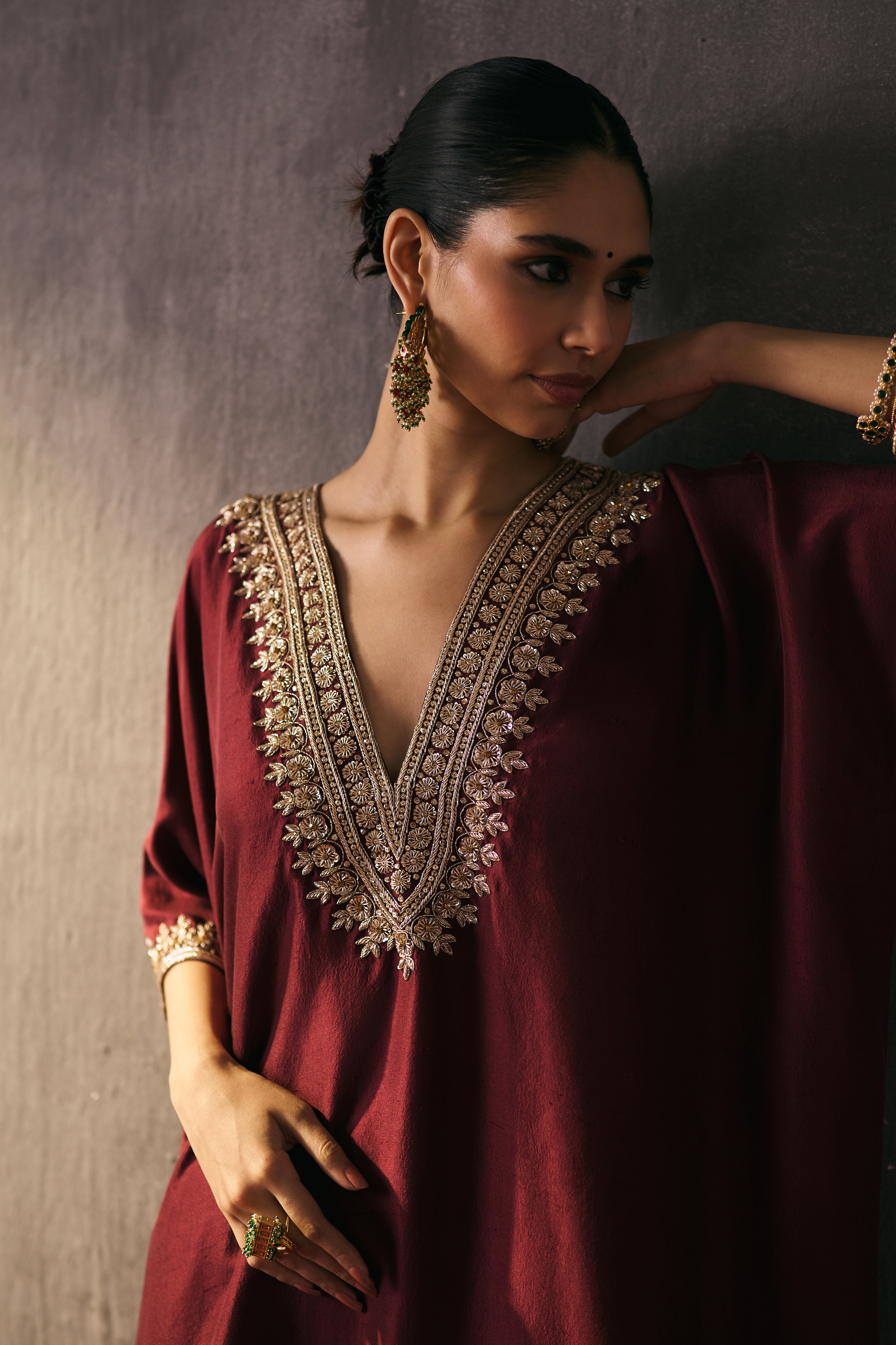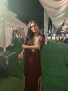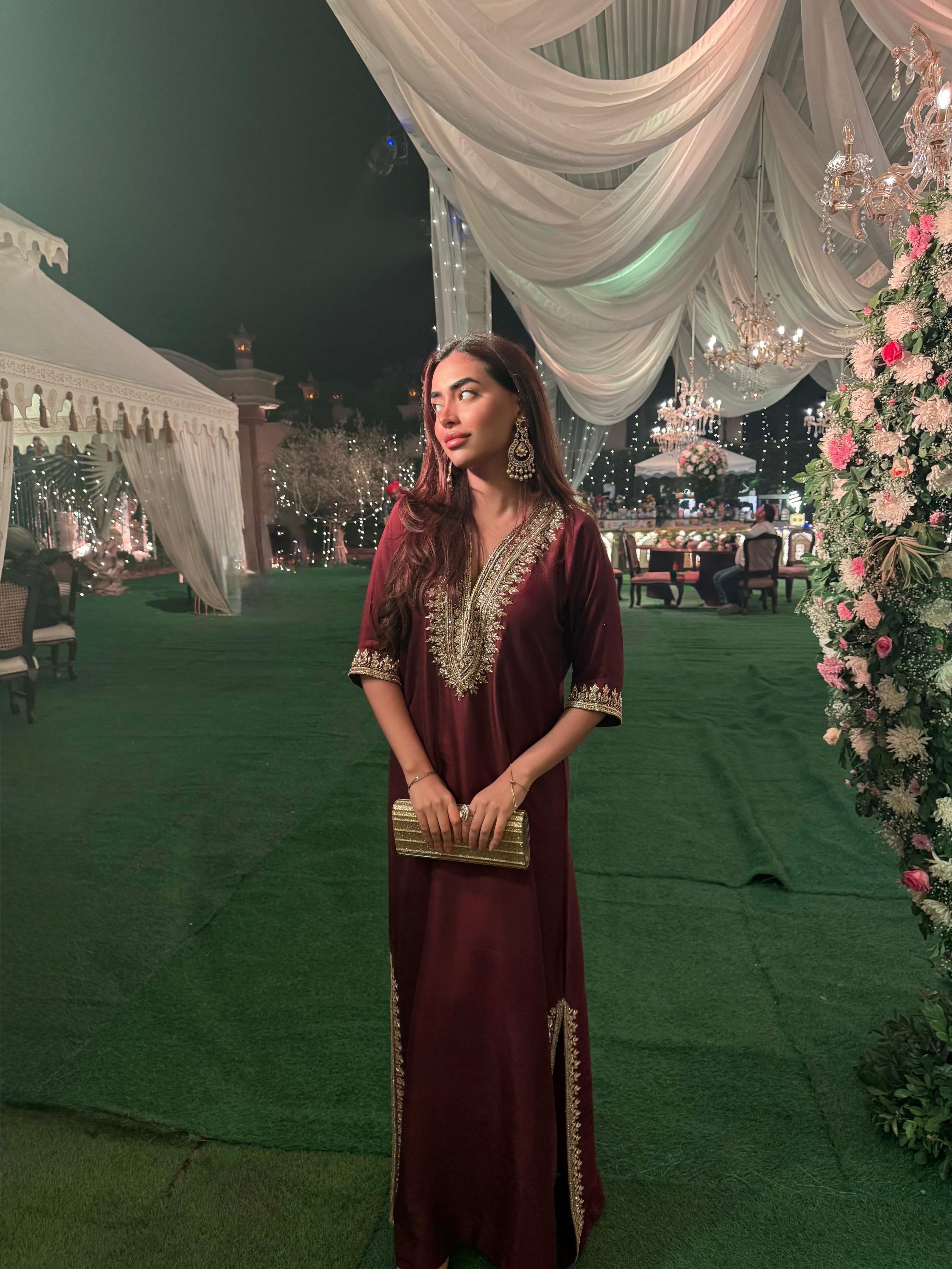 Crafted in pure silk, these flowy, loose-fit kaftan dresses come with slits upto the knee — a silhouette of modern ease and elegance. Hand-embellished with zari, dapka, and delicate glass accents, each piece is a work of art designed for festive evenings and timeless celebrations.