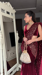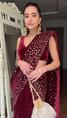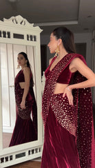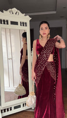 Beautiful gold embellished silk velvet draped saree. Skirt is fish cut.