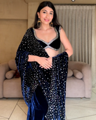 Fish cut velvet saree skirt with crystal embellished palla to sparkle paired with embroidered velvet blouse.