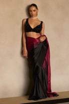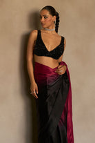 Deep red and black ombre shaded lustrous satin pre-draped skirt, teamed with tie-up blouse, encrusted with glass crystals.