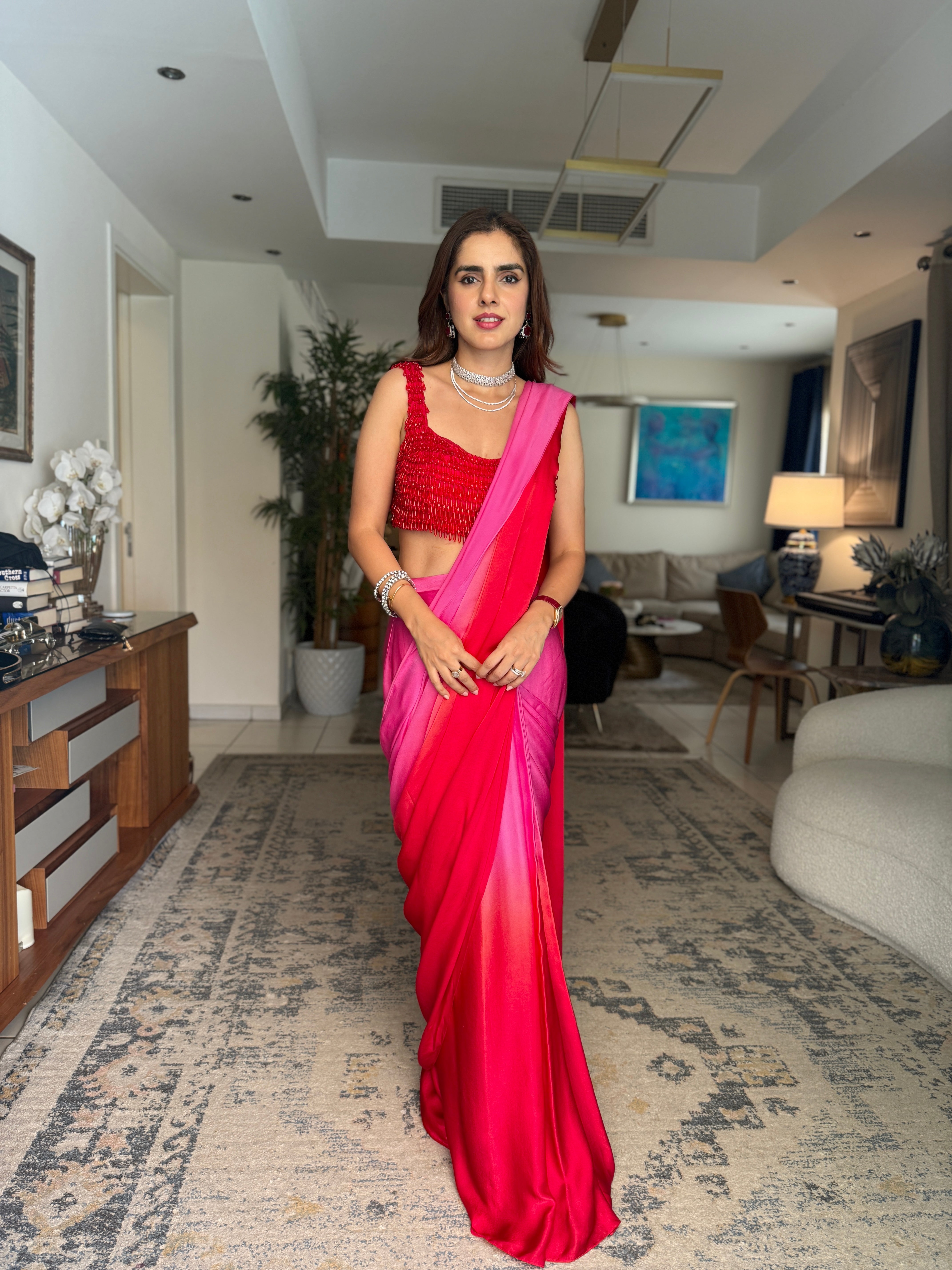 Rosey pink and red ombre shaded lustrous satin pre-draped skirt, teamed with cut sleeves blouse, encrusted with glass crystals. Dispatch within 10 to 14 working days. For urgent orders please contact via the WhatsApp link provided.