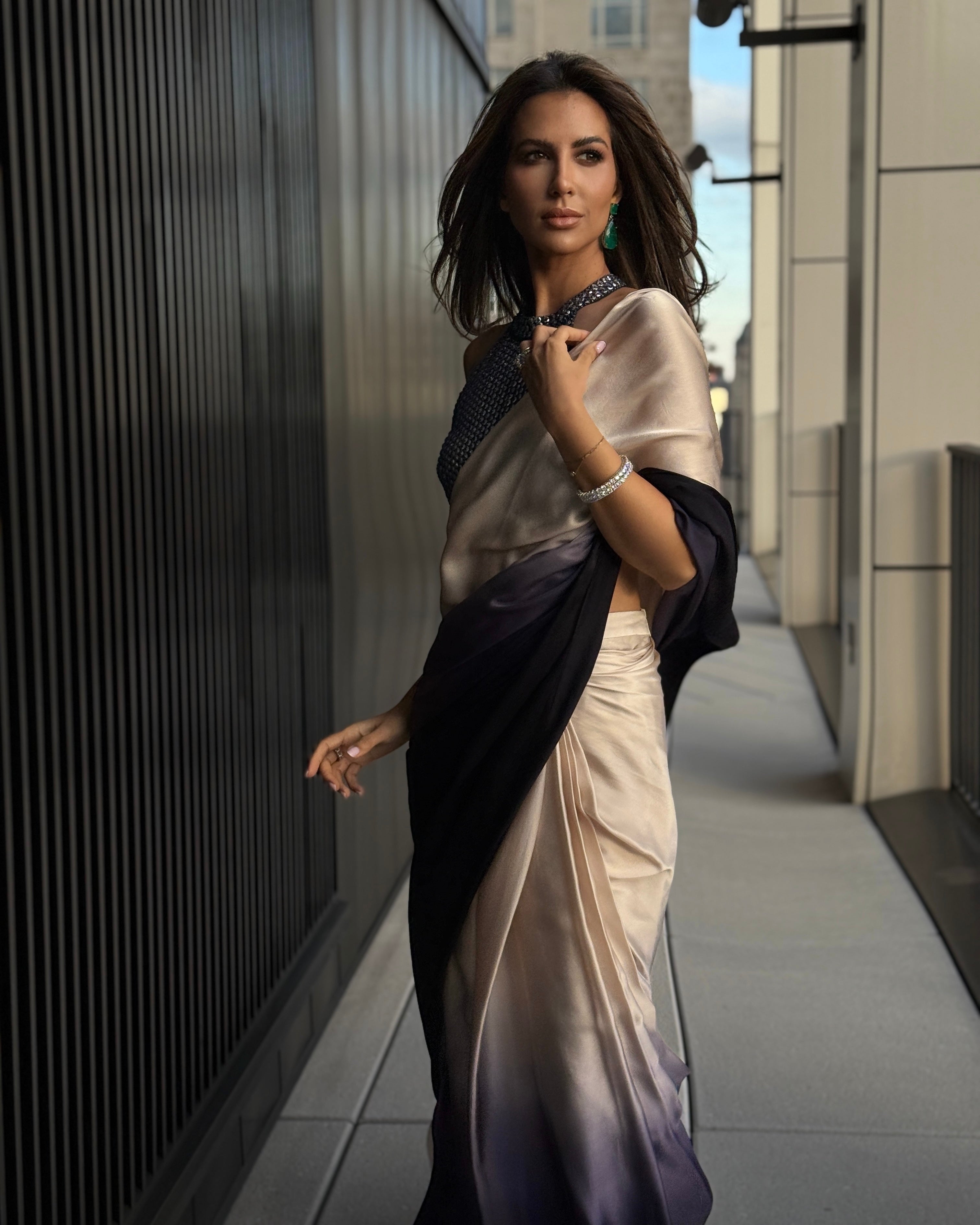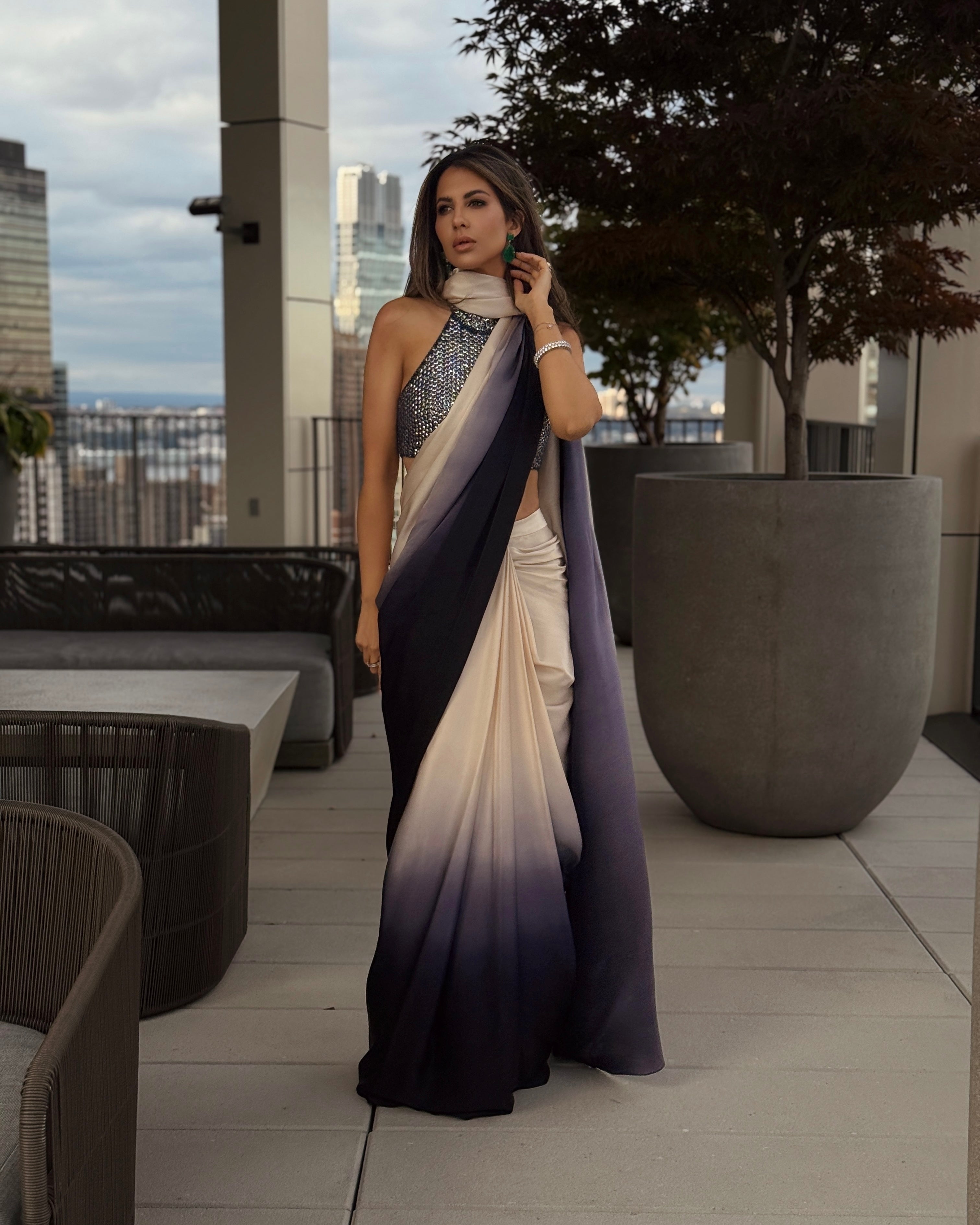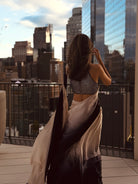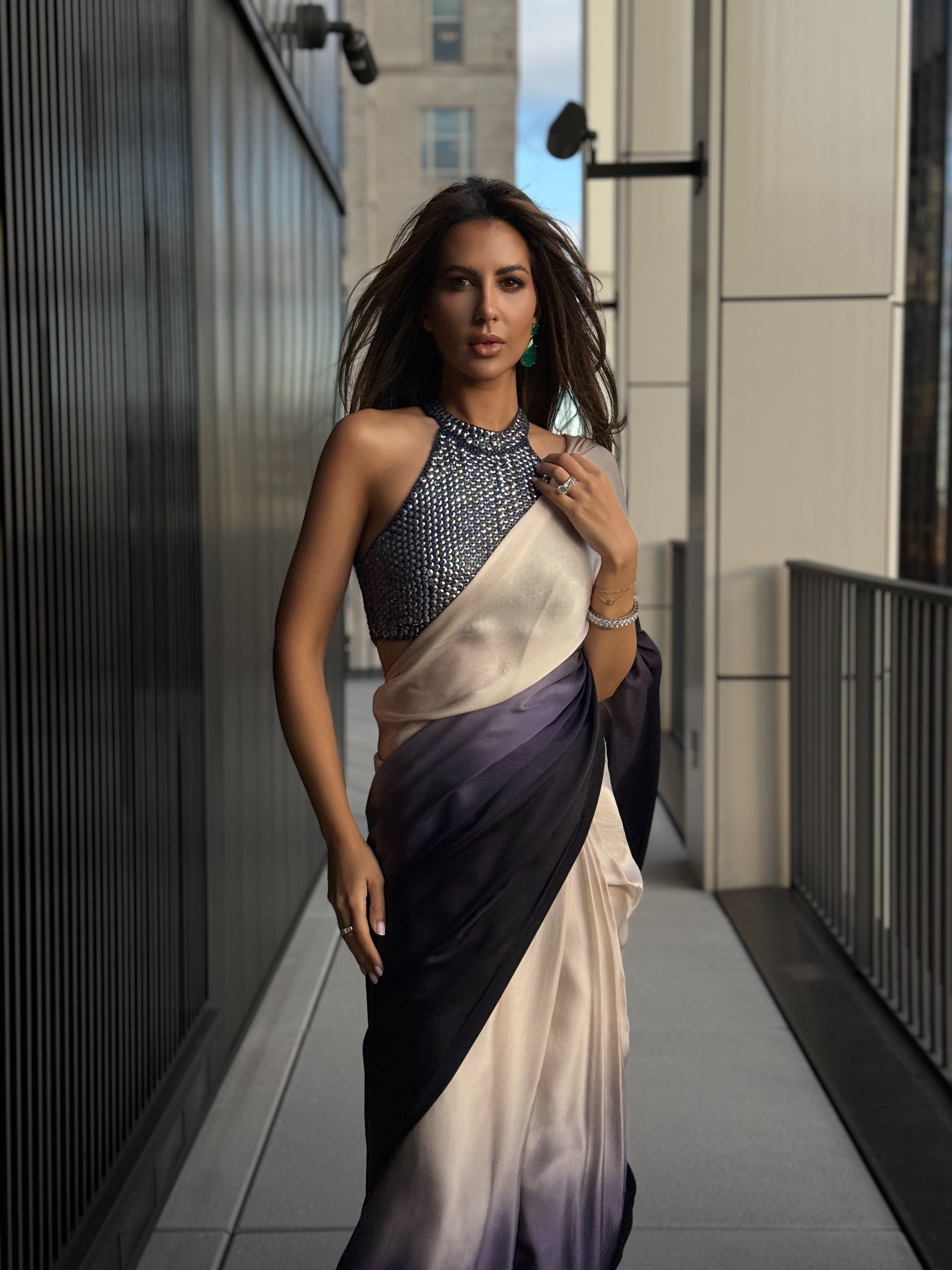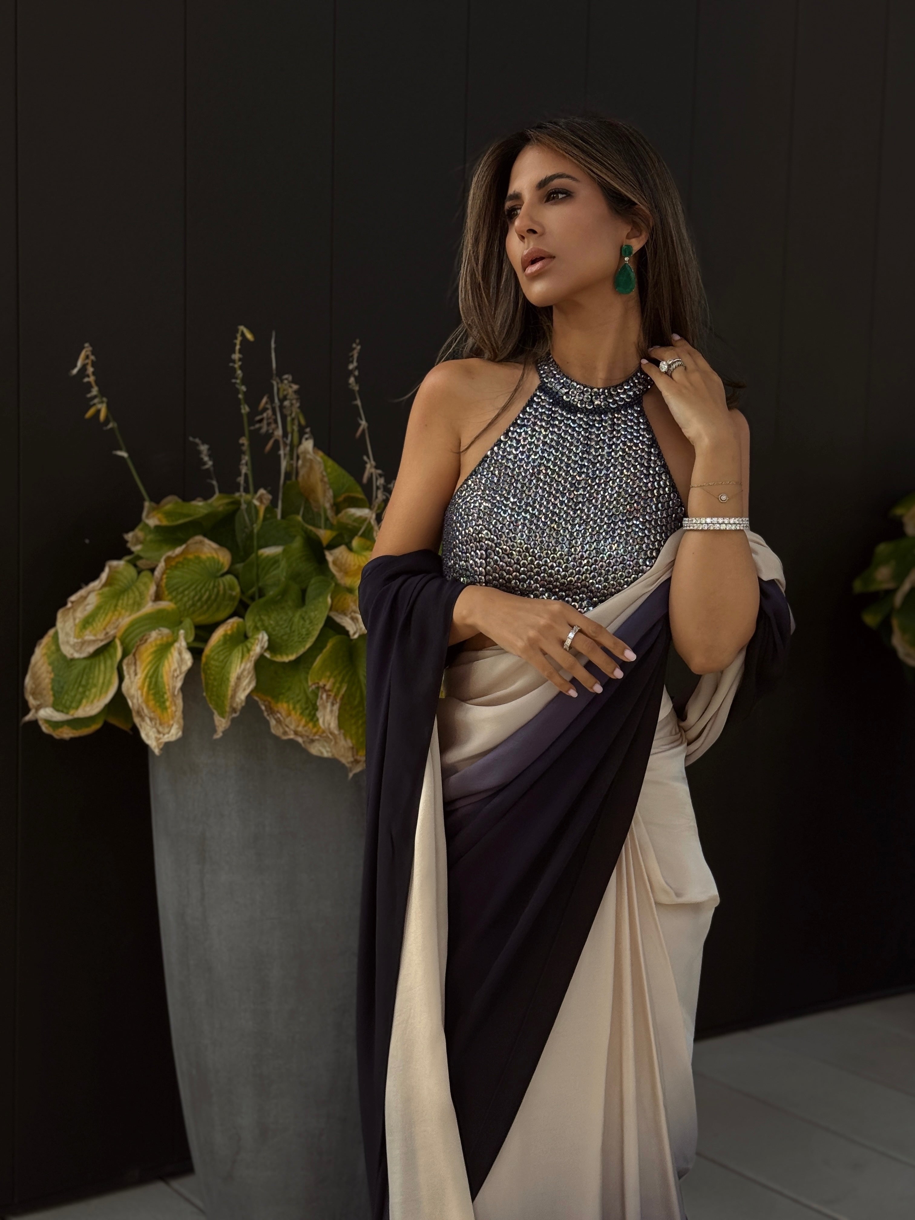 Creamy grey and black ombre shaded lustrous satin pre-draped skirt, teamed with halter neck style blouse, encrusted with france cut sequin and crystals.