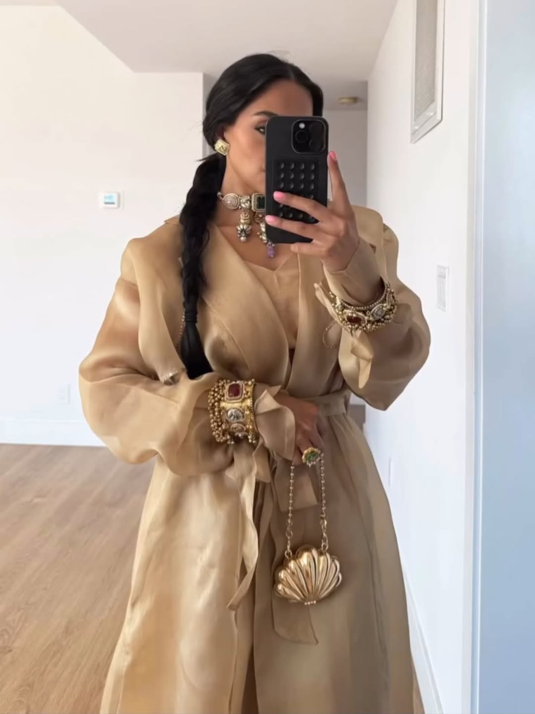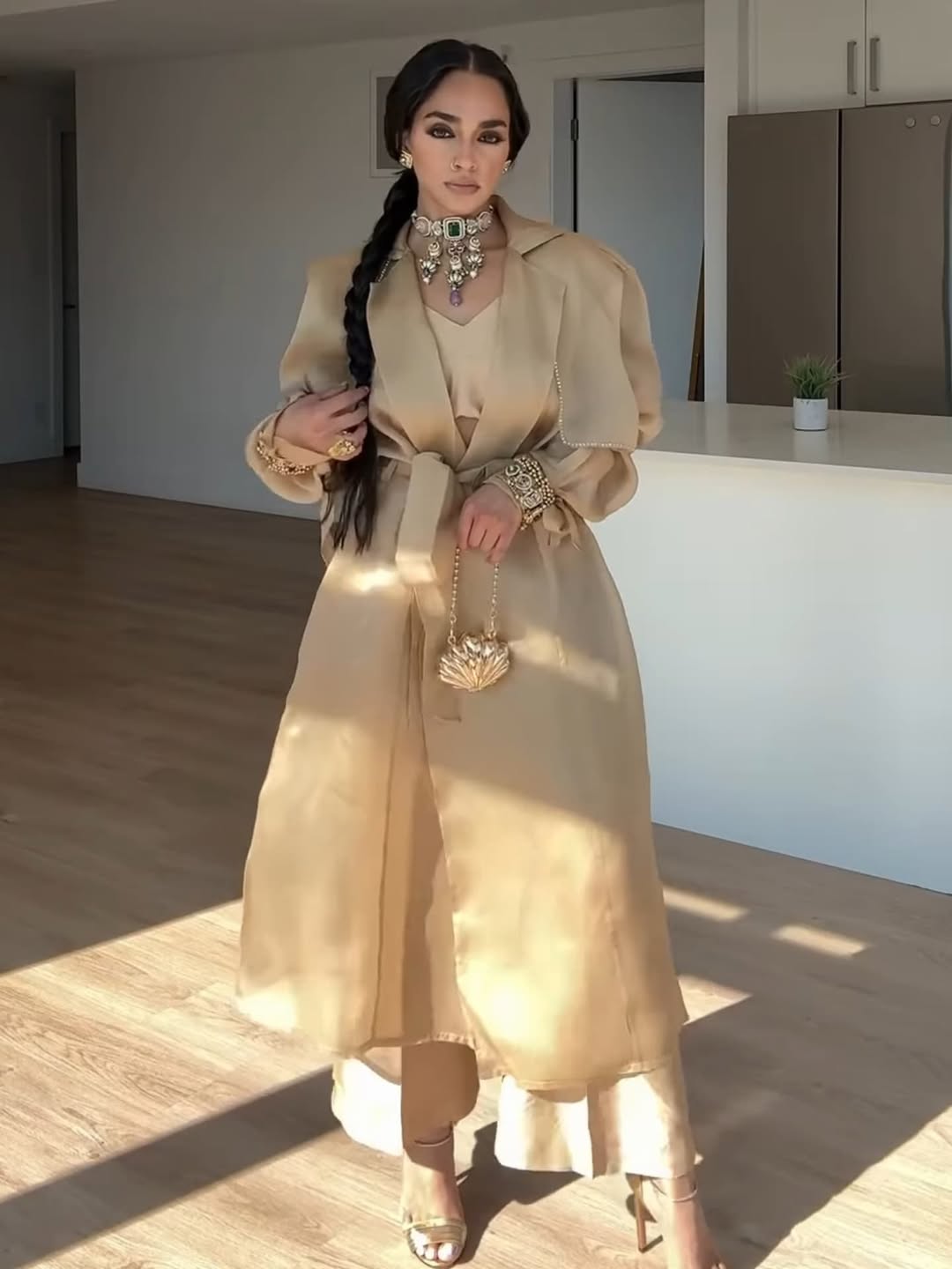 Structured organza trench with crystal definition along the lapel and tie-up detailing along the wrist with belt. Full set includes bustier and boot cut style pants.