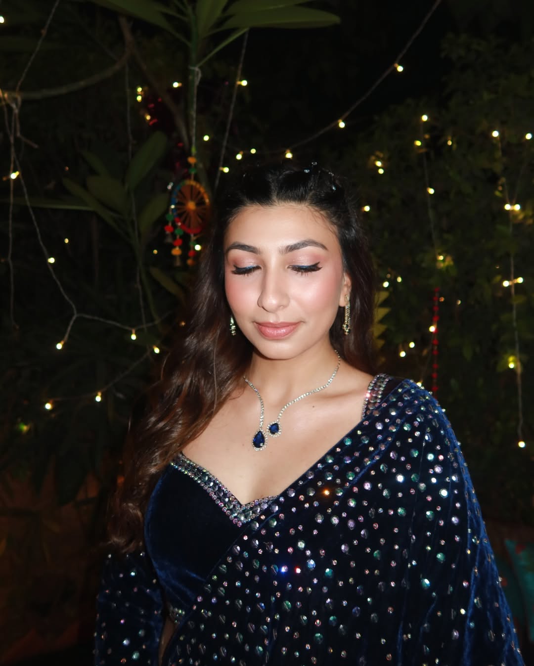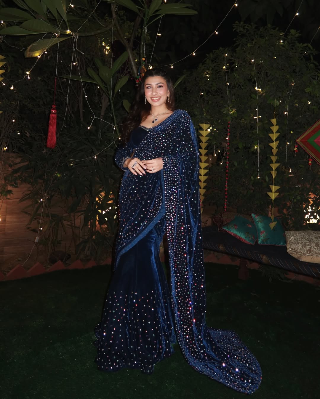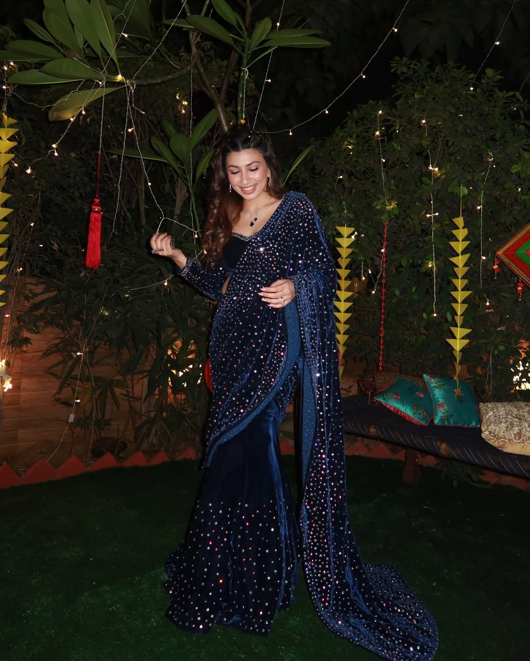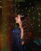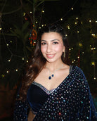 Fish cut embellished velvet saree skirt with crystal embellished palla to sparkle paired with embroidered full sleeves velvet blouse.