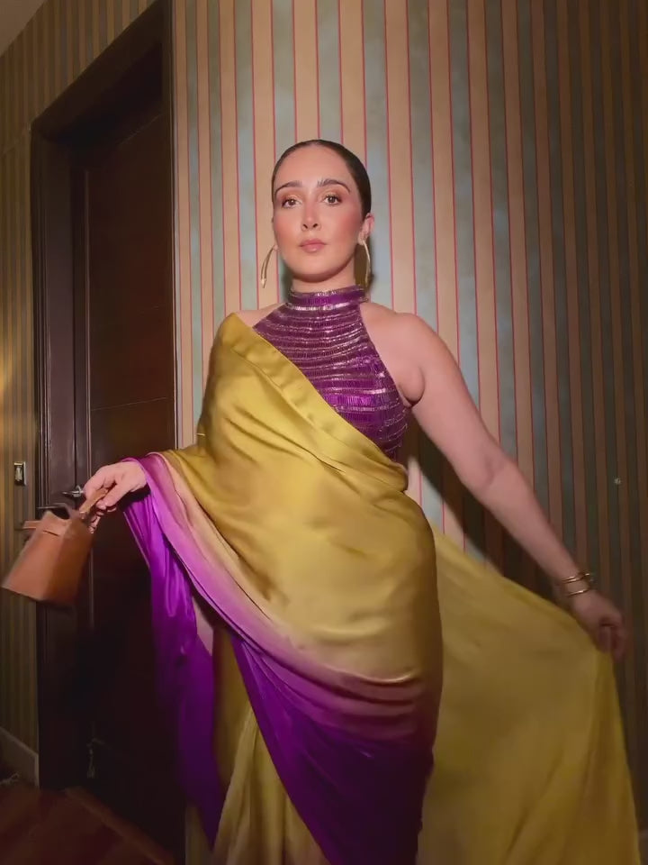Rich mustard and puple ombre shaded lustrous satin pre-draped skirt, teamed with halter neck blouse, encrusted with rectangle sequin and crystals.