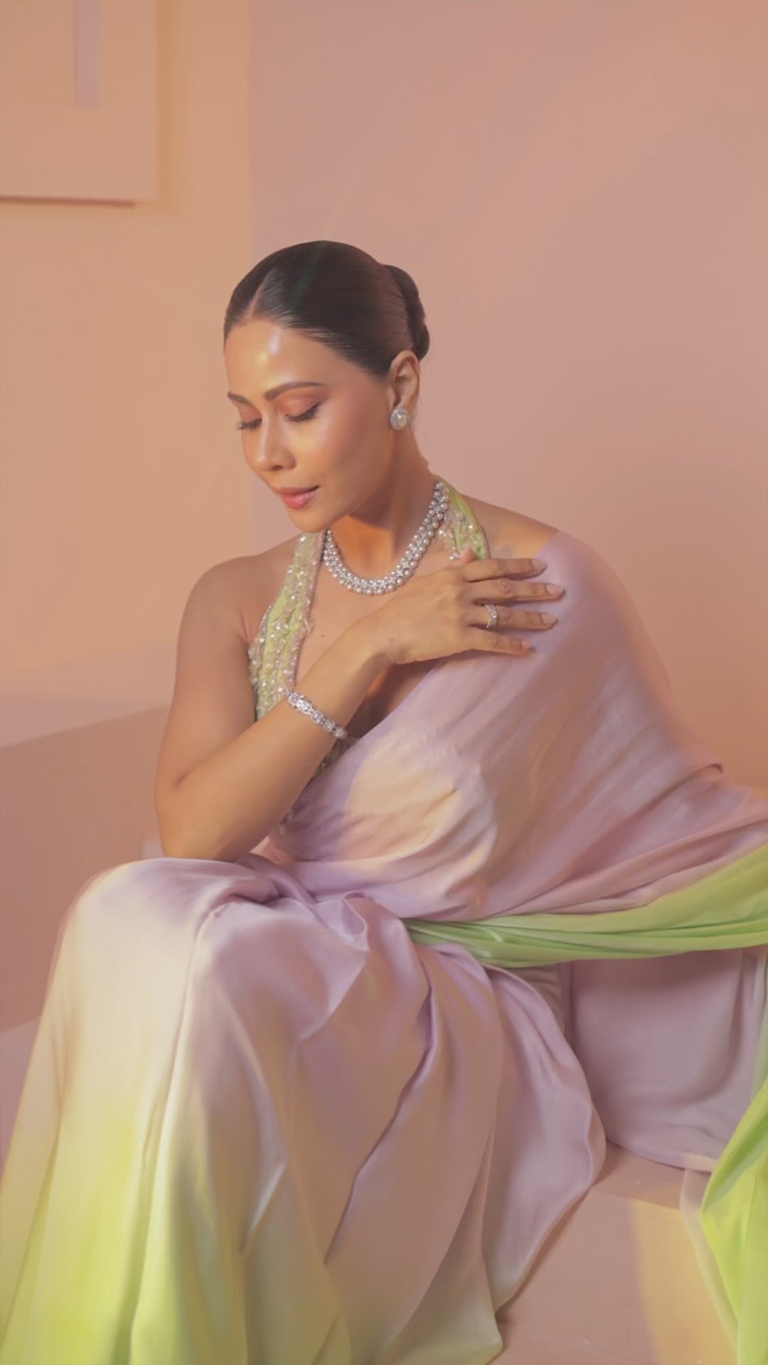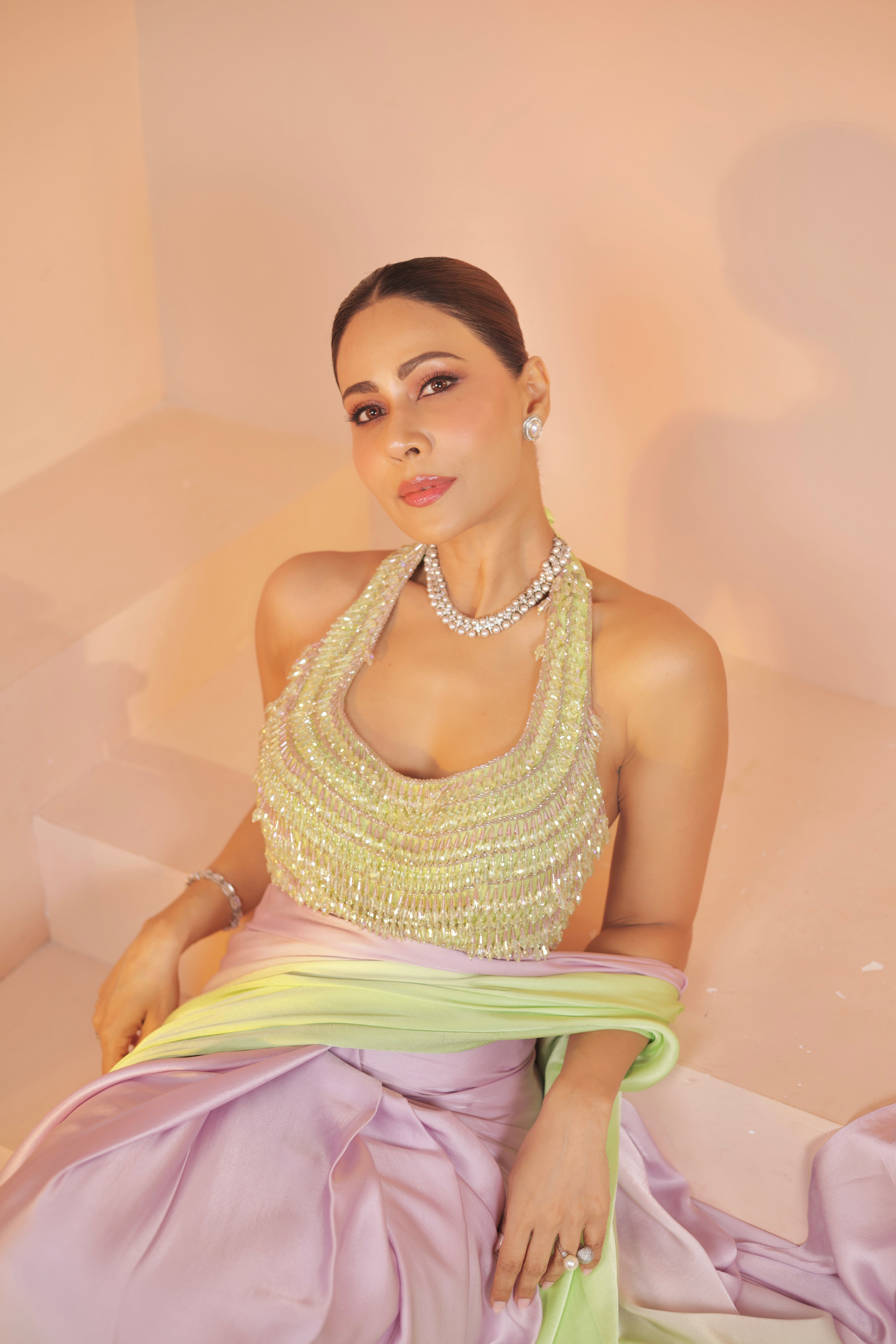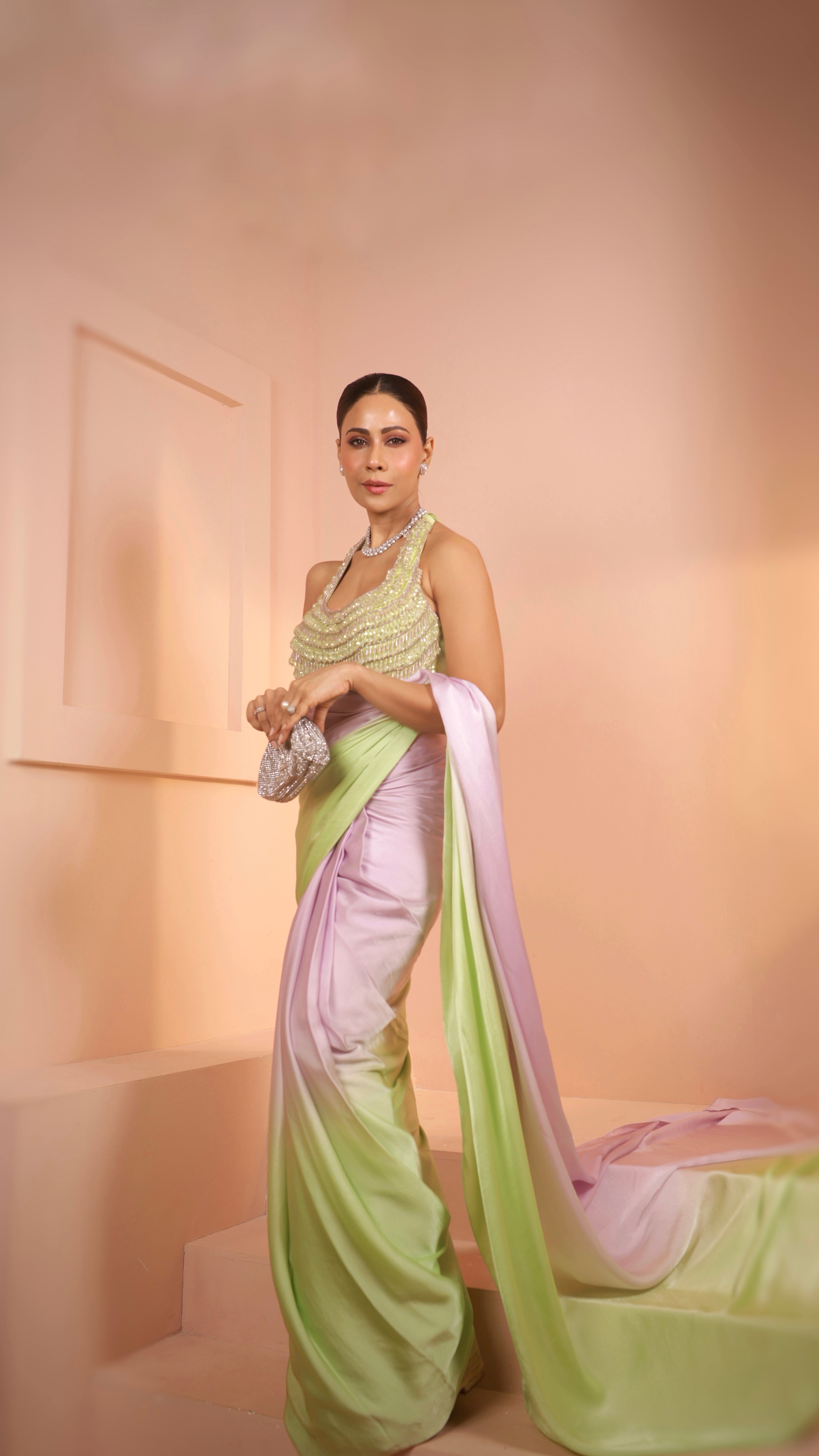 Soft lavender touched with green freshness- shaded lustrous satin pre-draped skirt, teamed with multi coloured crystal embellished halter blouse.