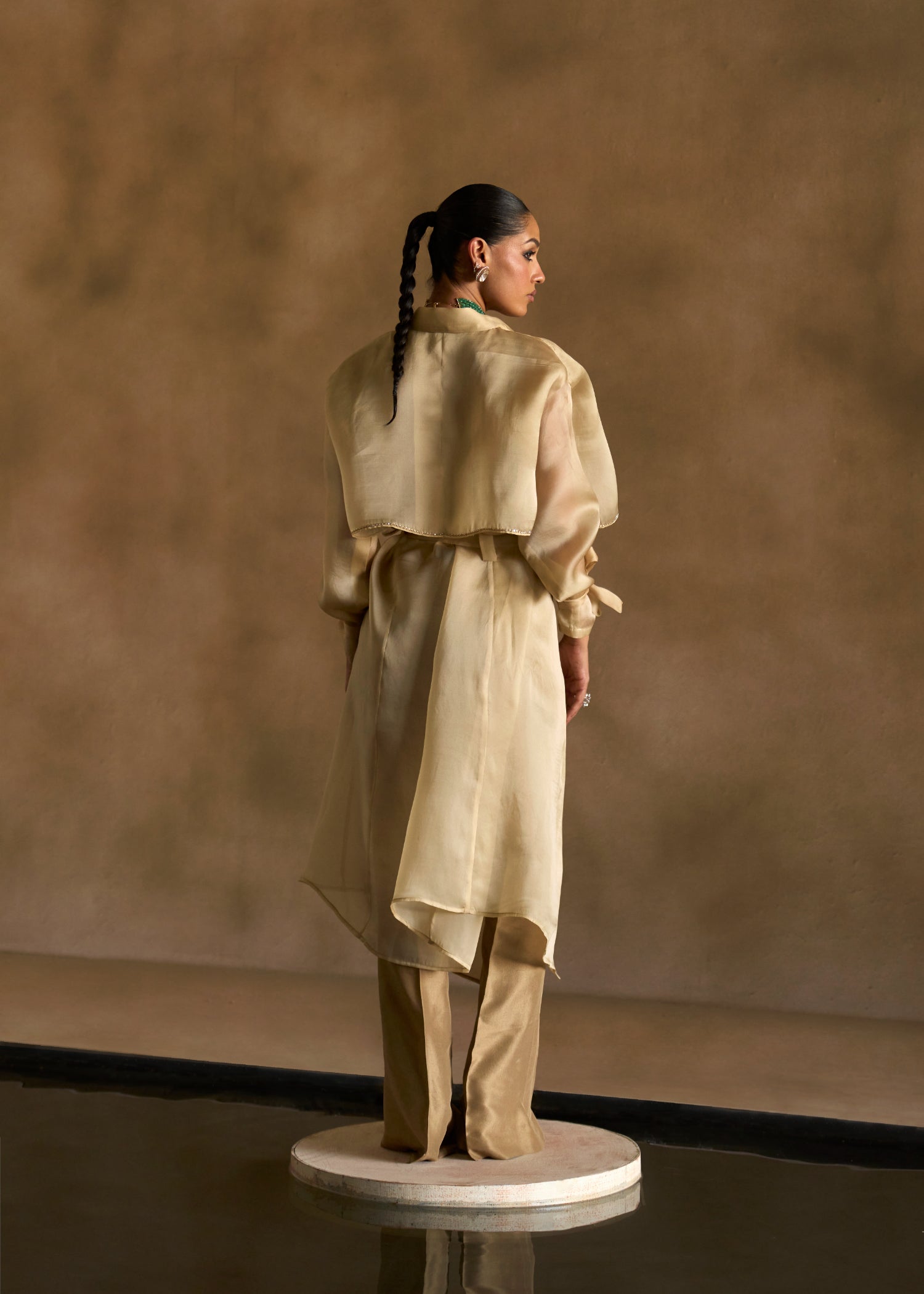 Structured organza trench with crystal definition along the lapel and tie-up detailing along the wrist with belt.