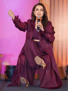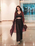 Structured organza trench with crystal definition along the lapel and tie-up detailing along the wrist with belt. Full set includes bustier and boot cut style pants.