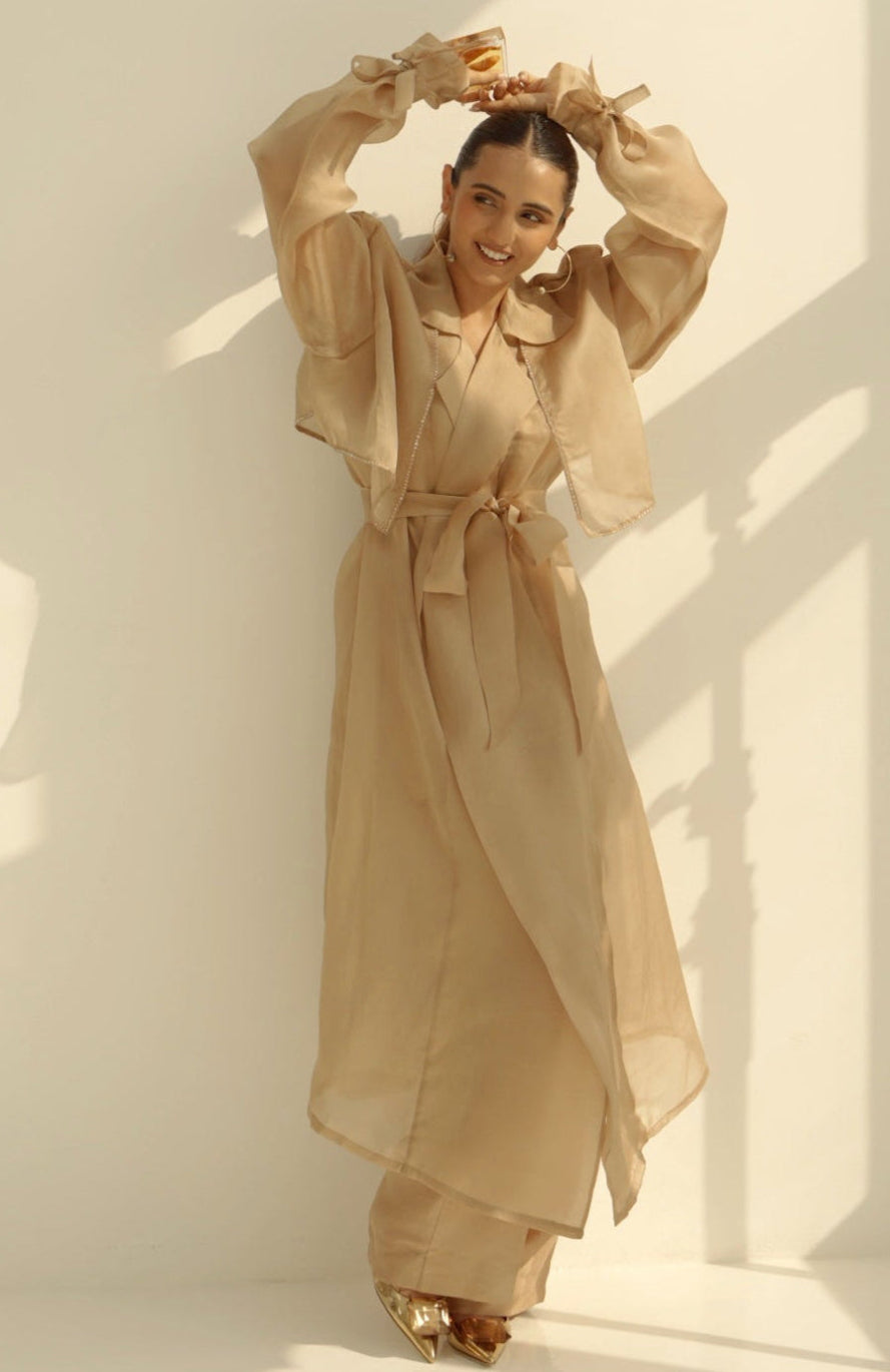 Structured organza trench with crystal definition along the lapel and tie-up detailing along the wrist with belt. Full set includes bustier and boot cut style pants.