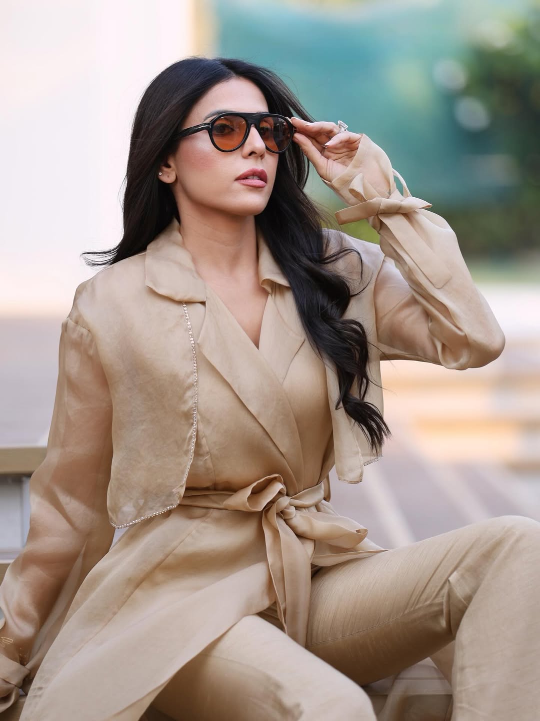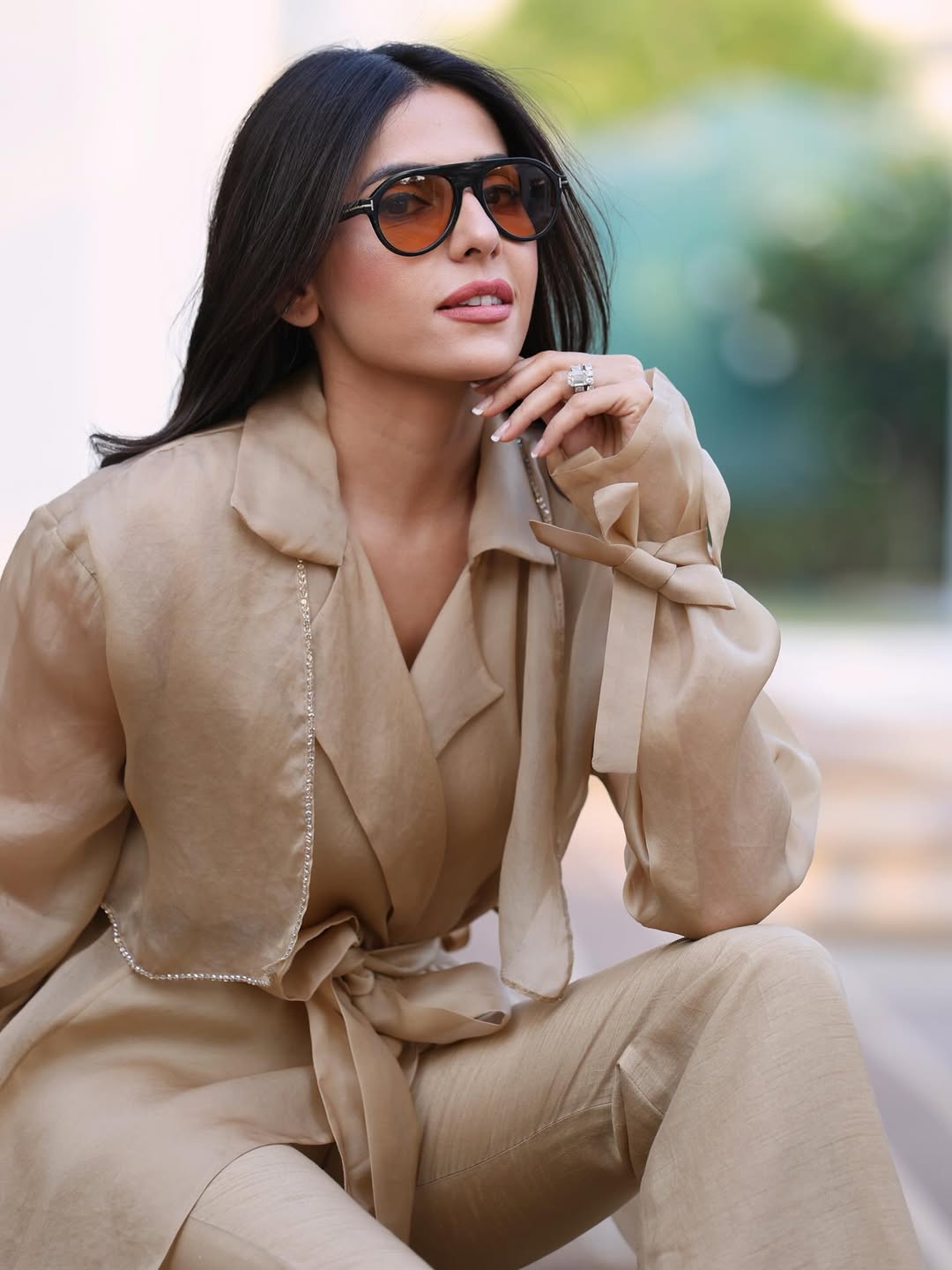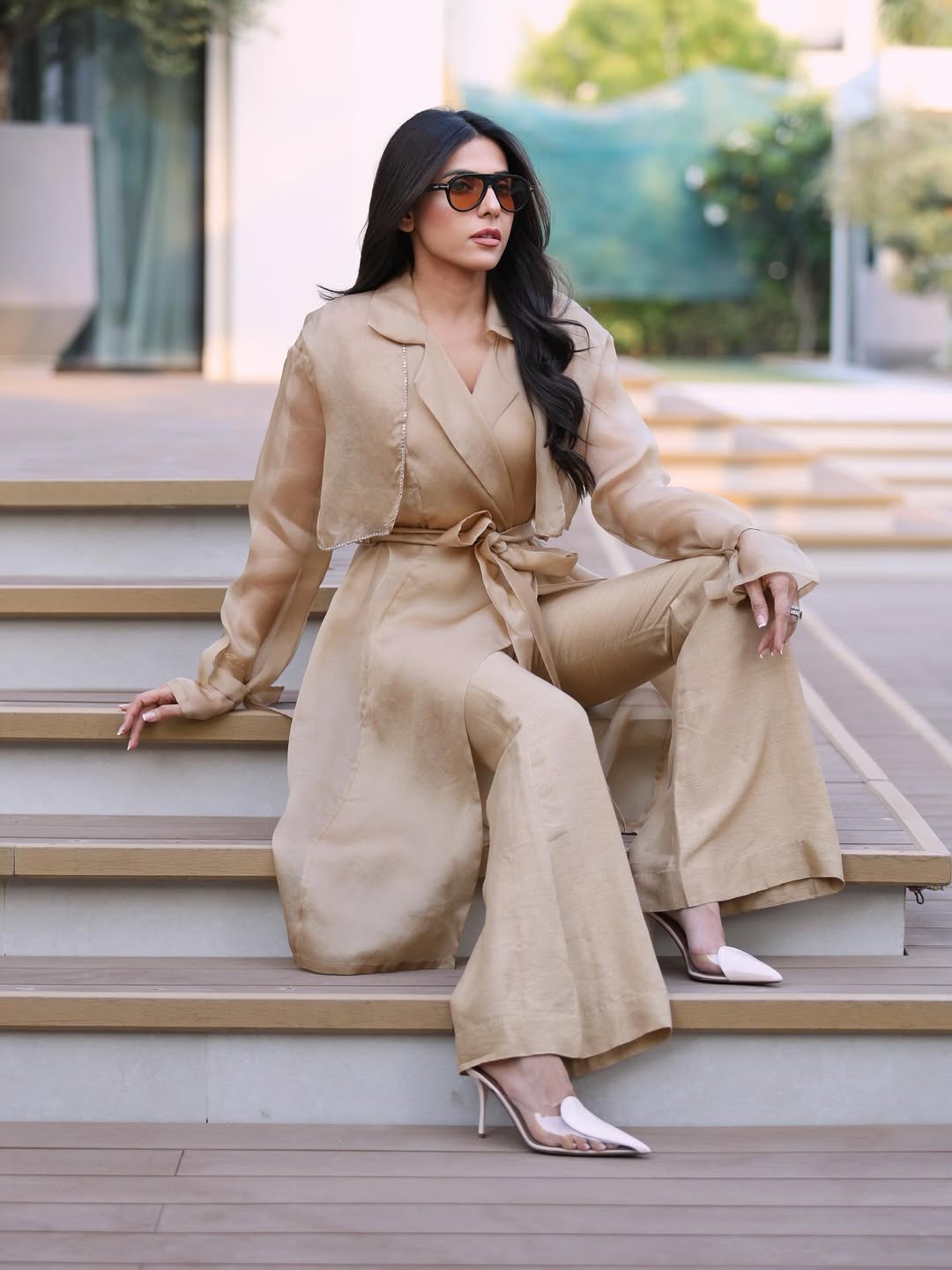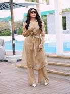Structured organza trench with crystal definition along the lapel and tie-up detailing along the wrist with belt. Full set includes bustier and boot cut style pants.