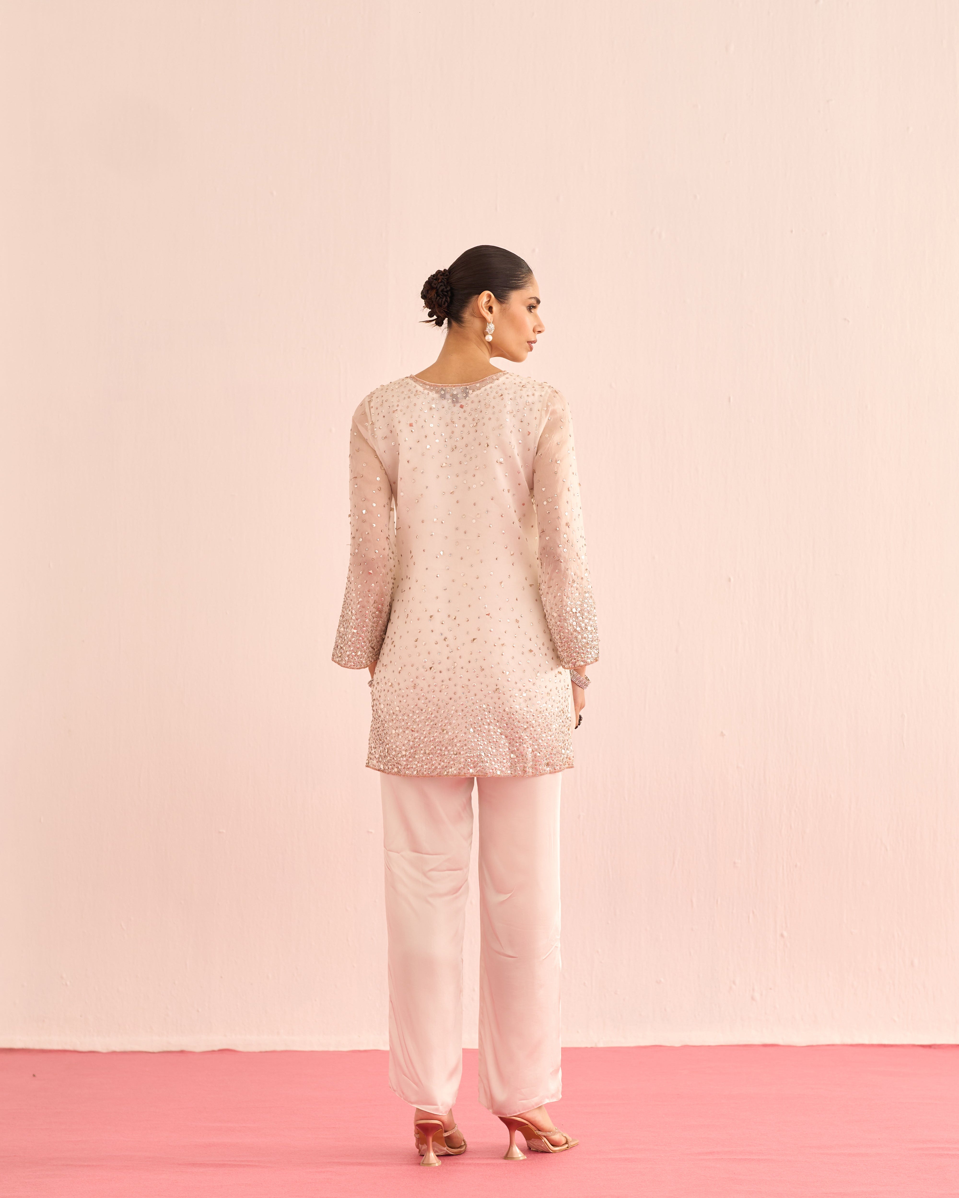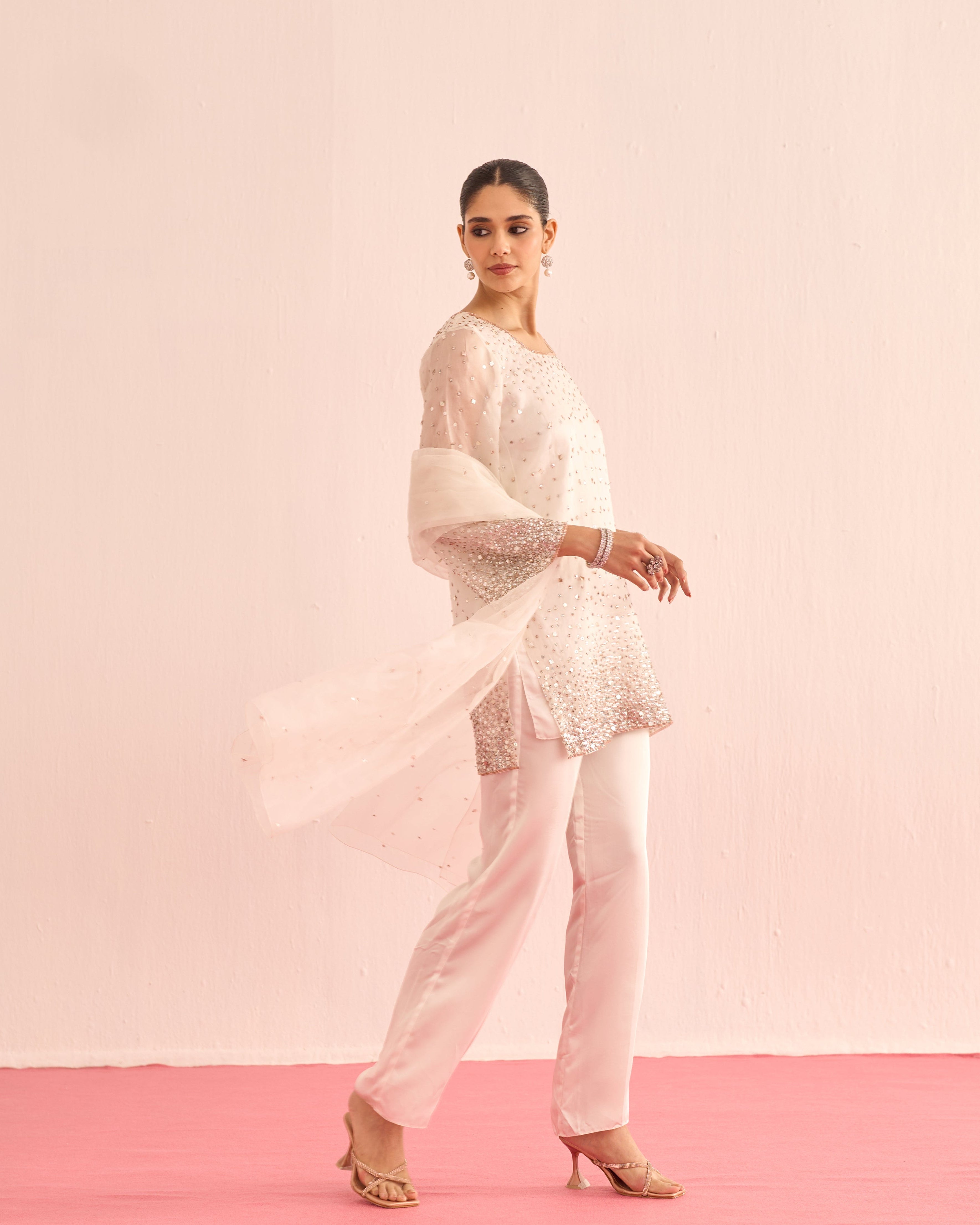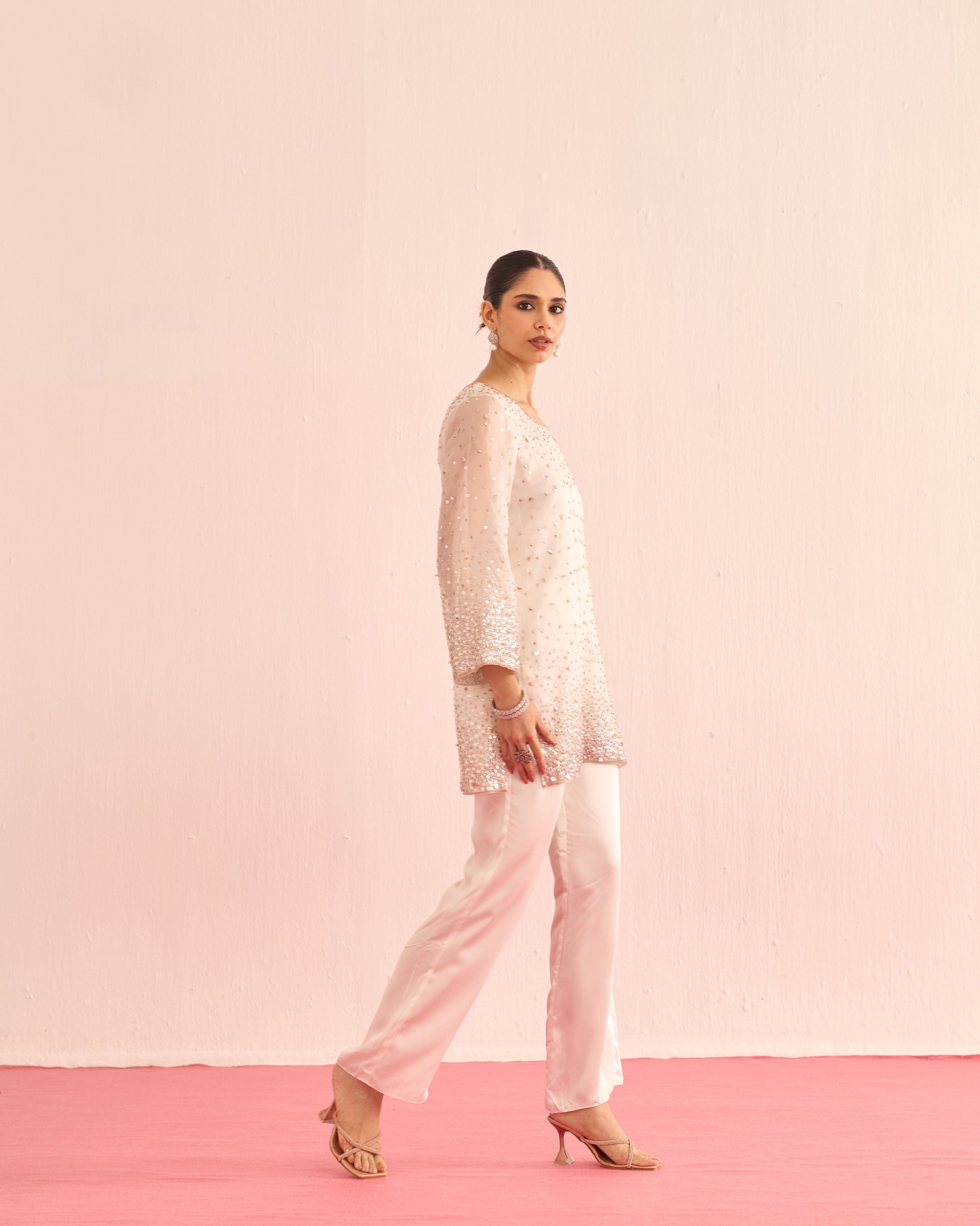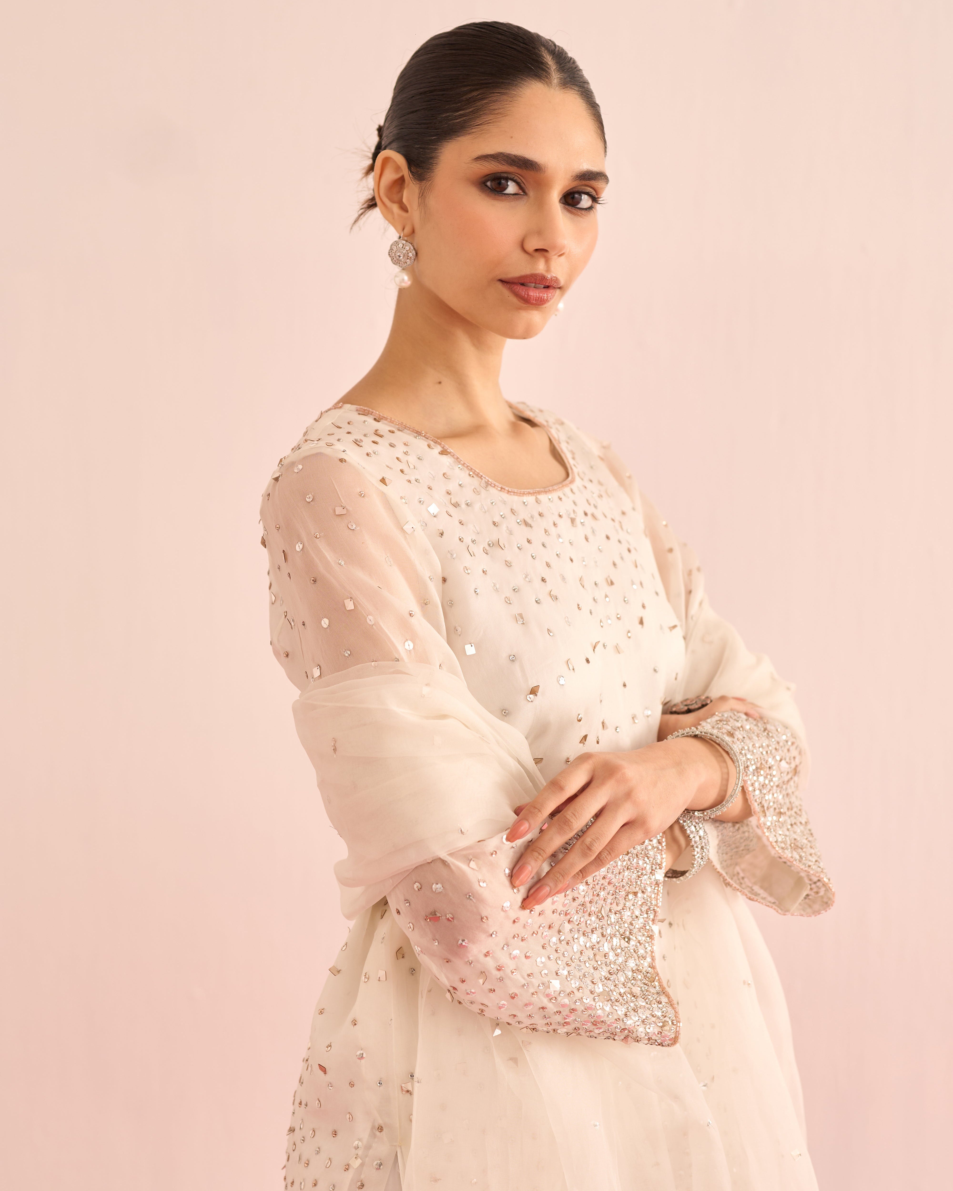 A luminous ensemble hand-embellished with crystals and sequins, designed to catch the light with every movement. The shirt and dupatta shimmer with delicate sparkle, while satin lining and tailored satin pants add a smooth, luxurious finish. Elegant, radiant, and effortlessly refined.