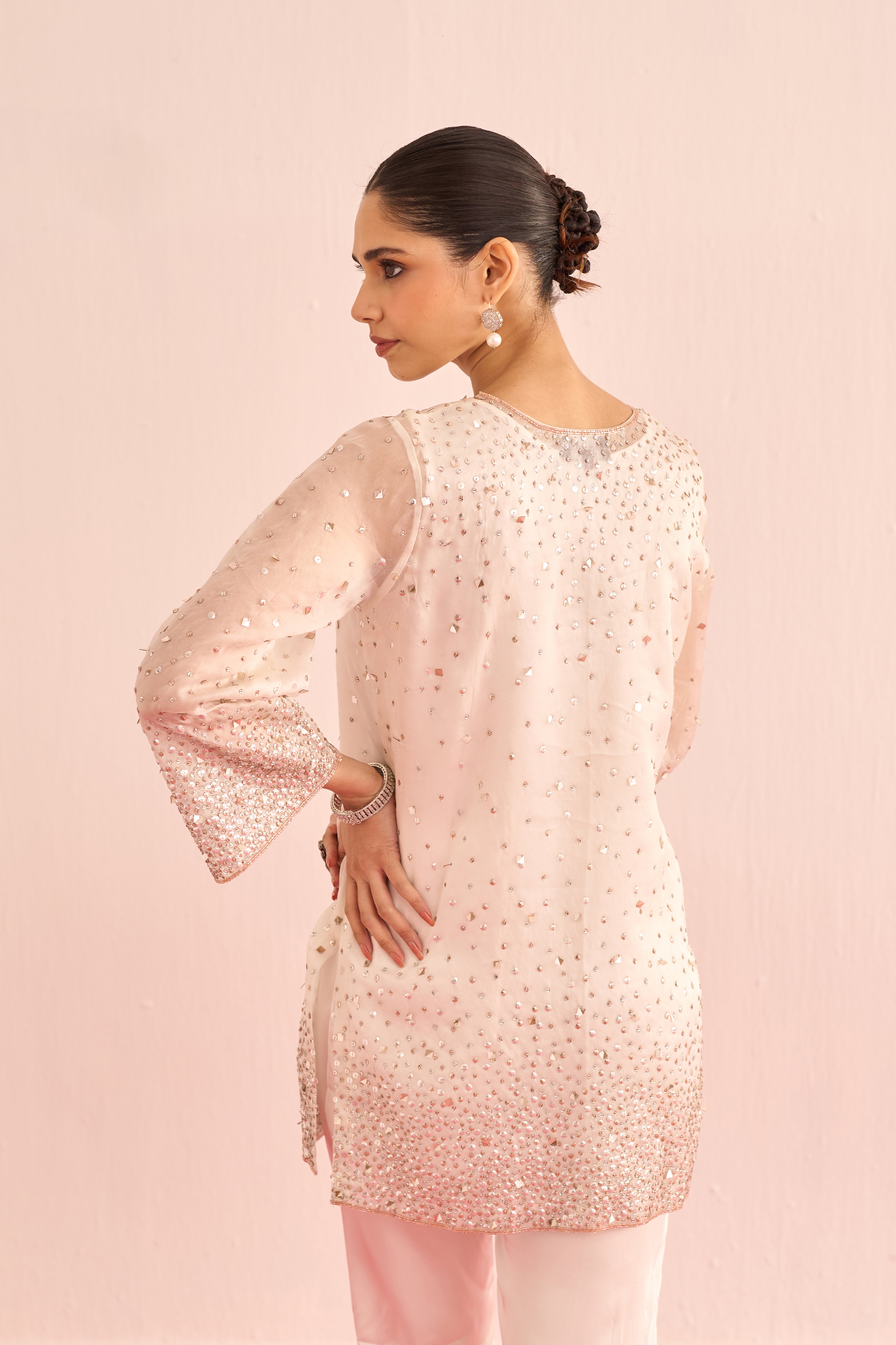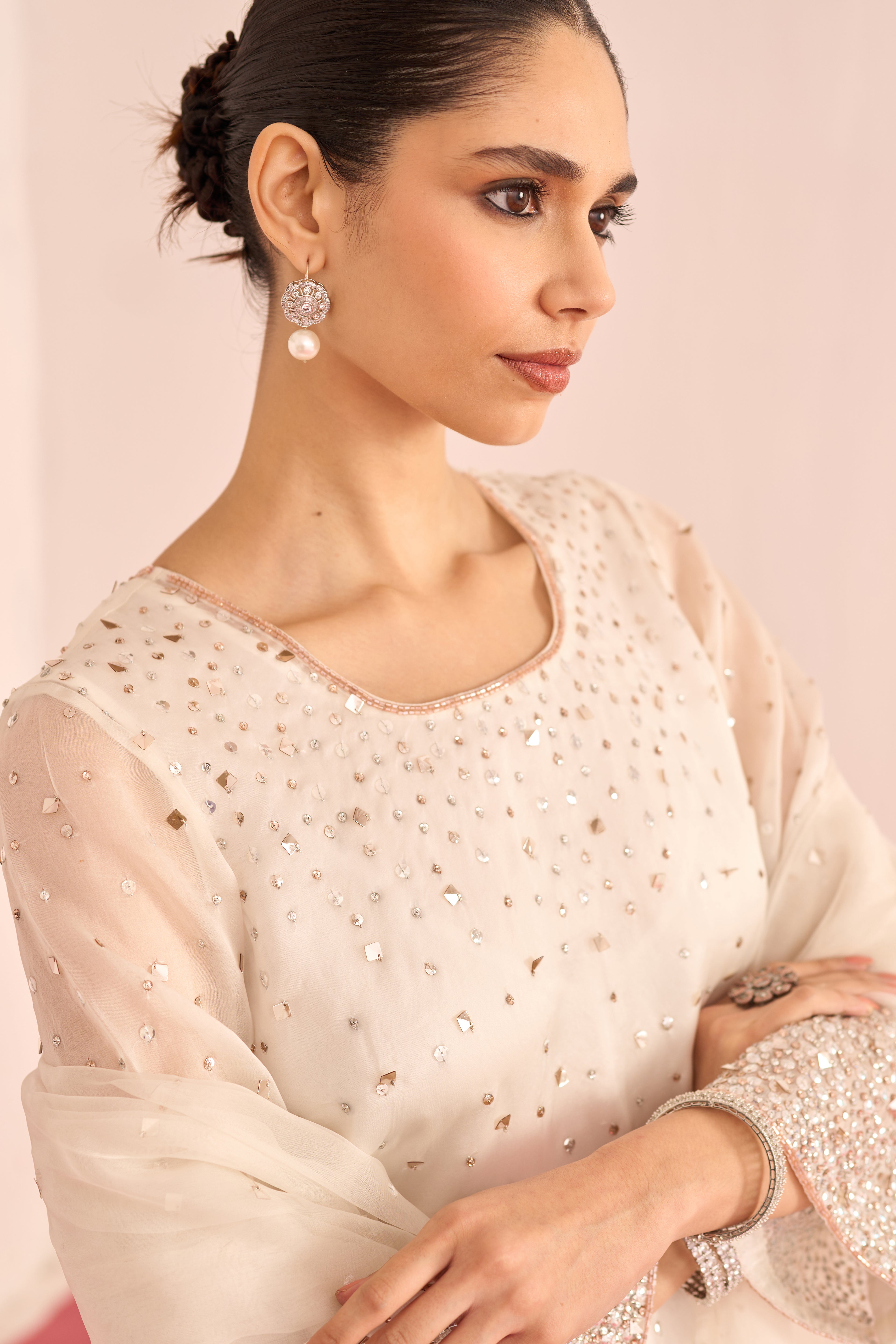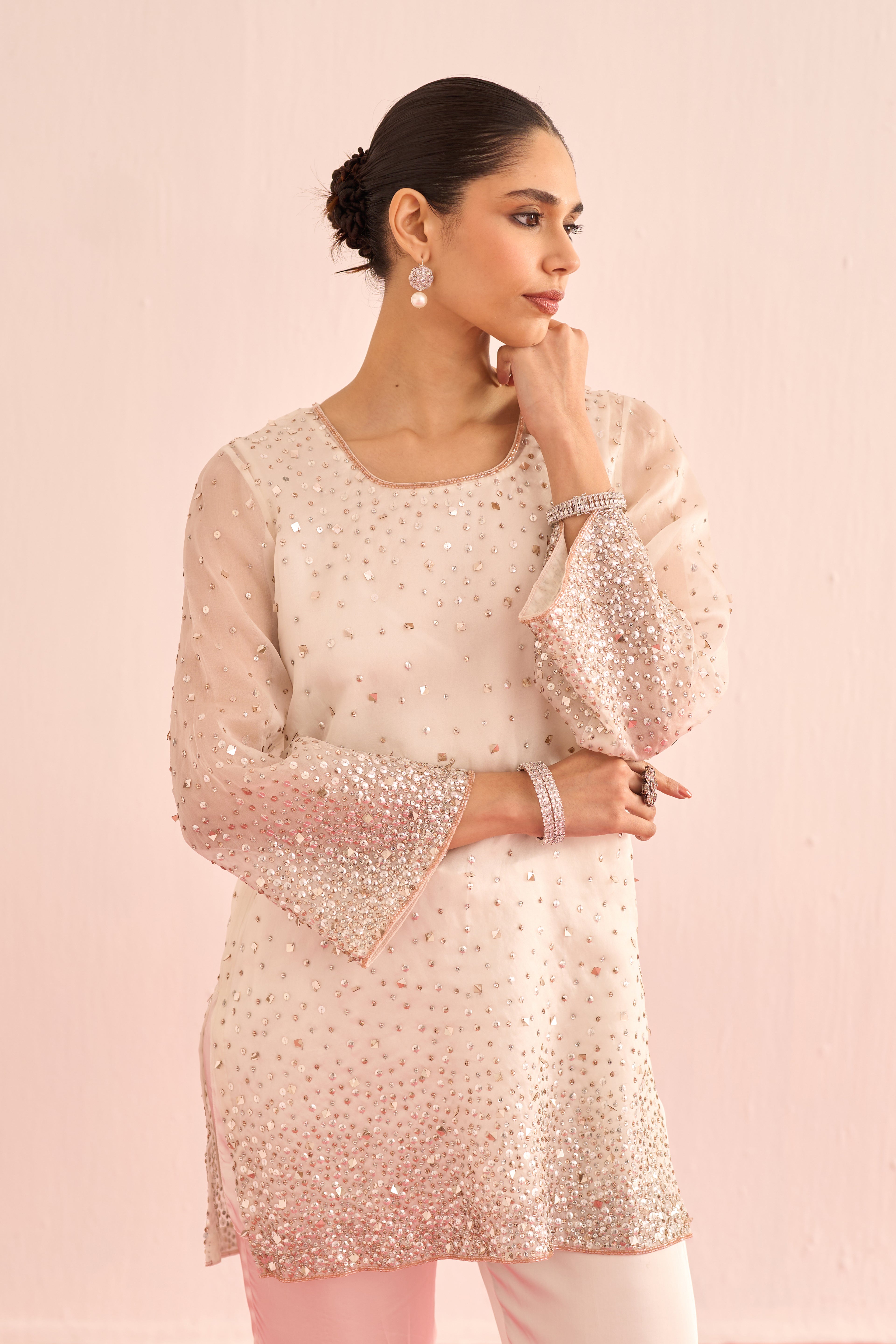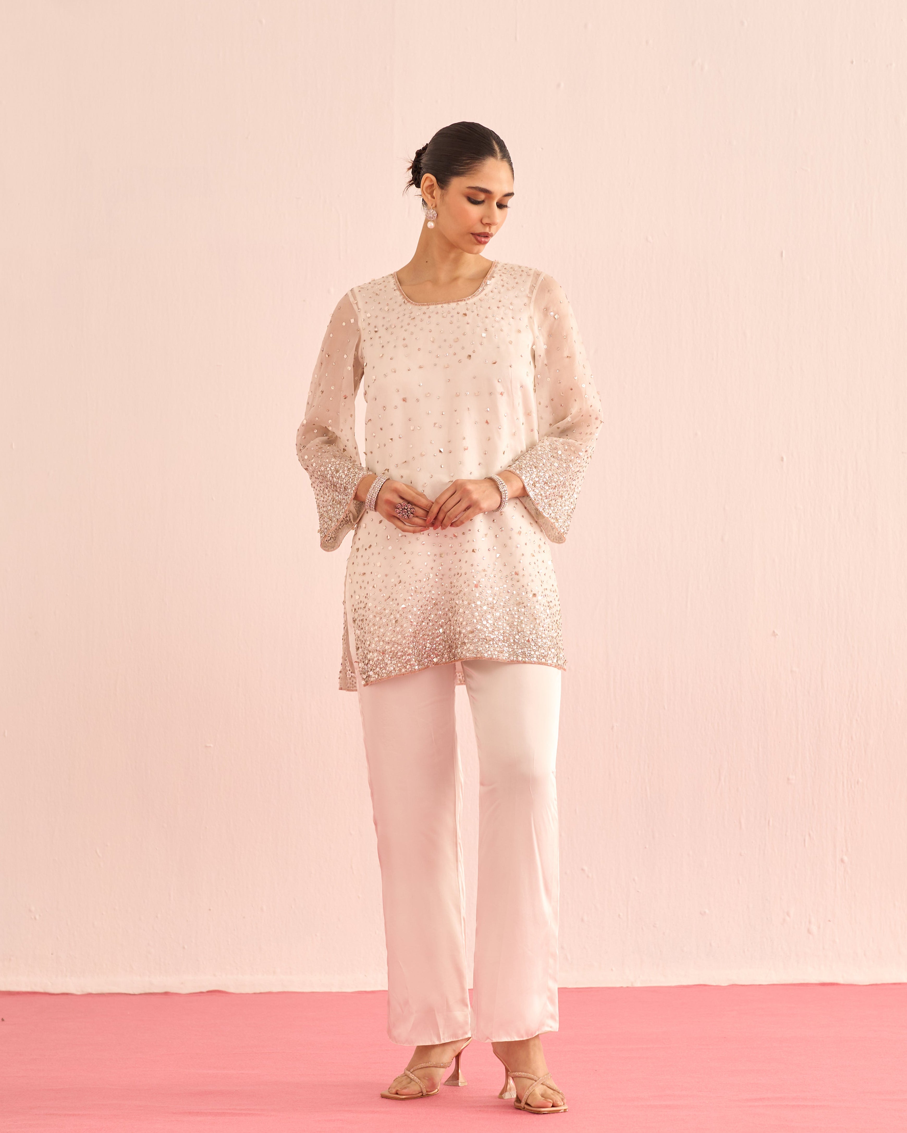 A luminous ensemble hand-embellished with crystals and sequins, designed to catch the light with every movement. The shirt and dupatta shimmer with delicate sparkle, while satin lining and tailored satin pants add a smooth, luxurious finish. Elegant, radiant, and effortlessly refined.