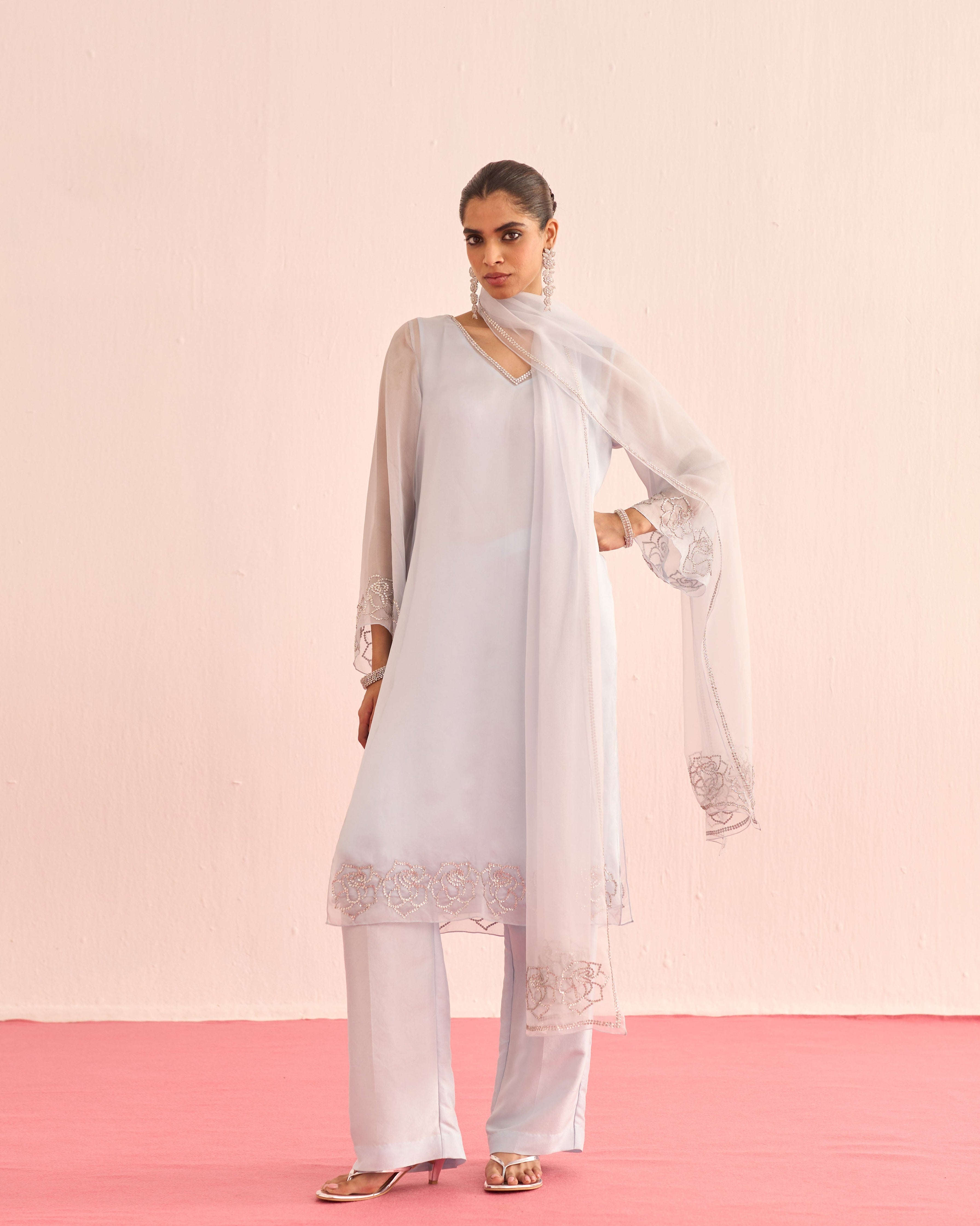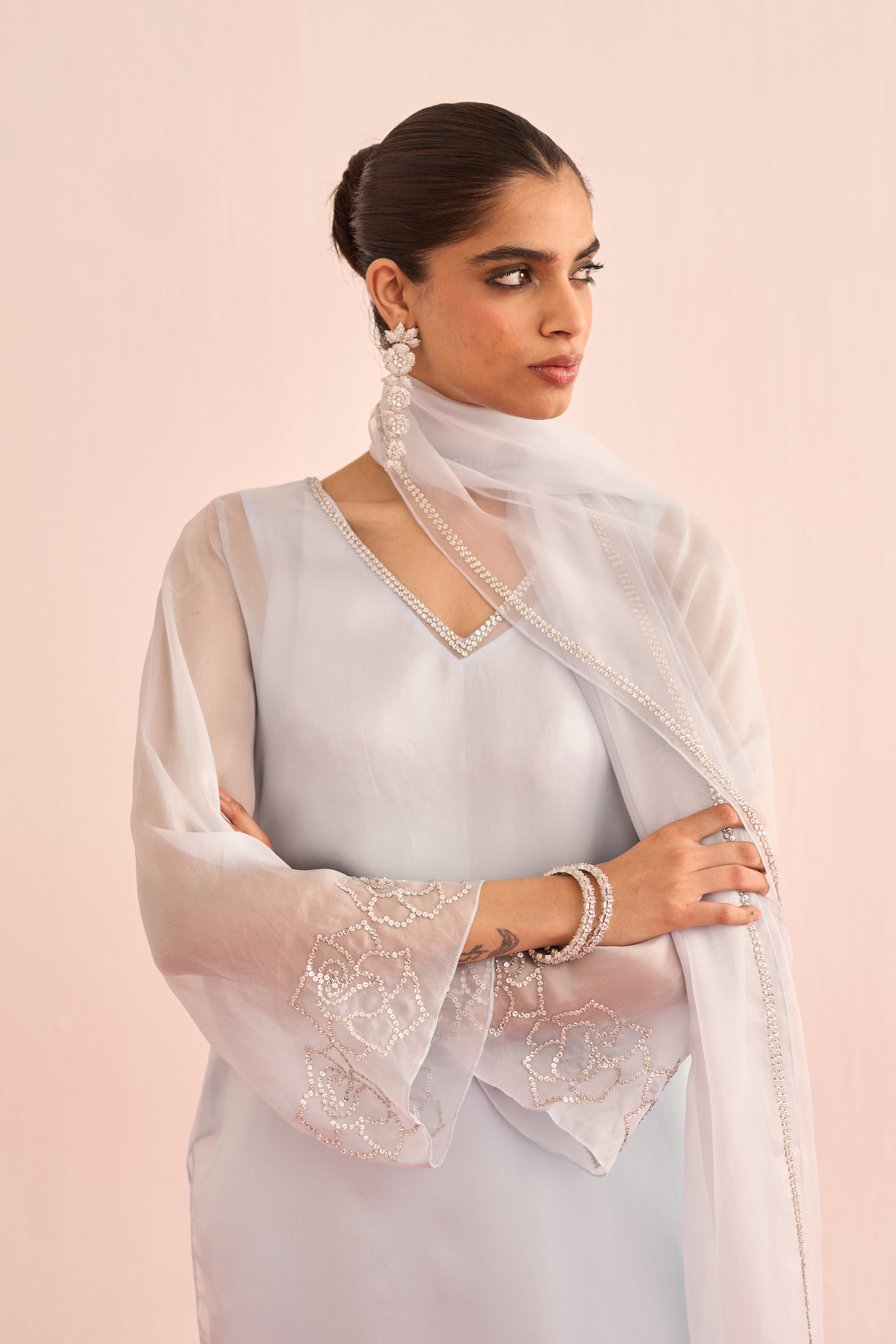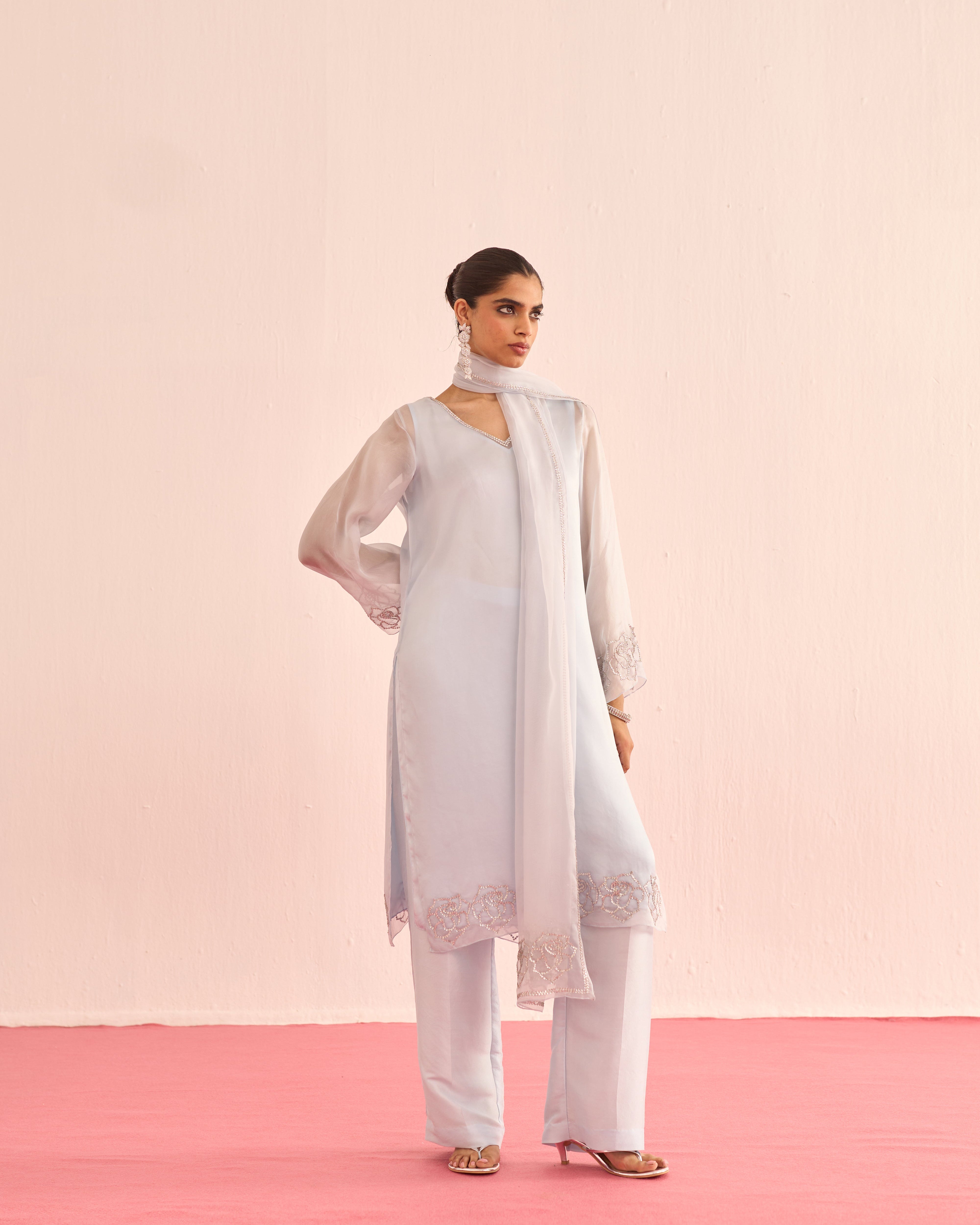 A cool blue organza set, featuring a sheer shirt and dupatta delicately hand-embellished with crystals for a soft, luminous sparkle. Finished with satin lining and tailored satin pants, this ensemble blends ethereal elegance with understated luxury.