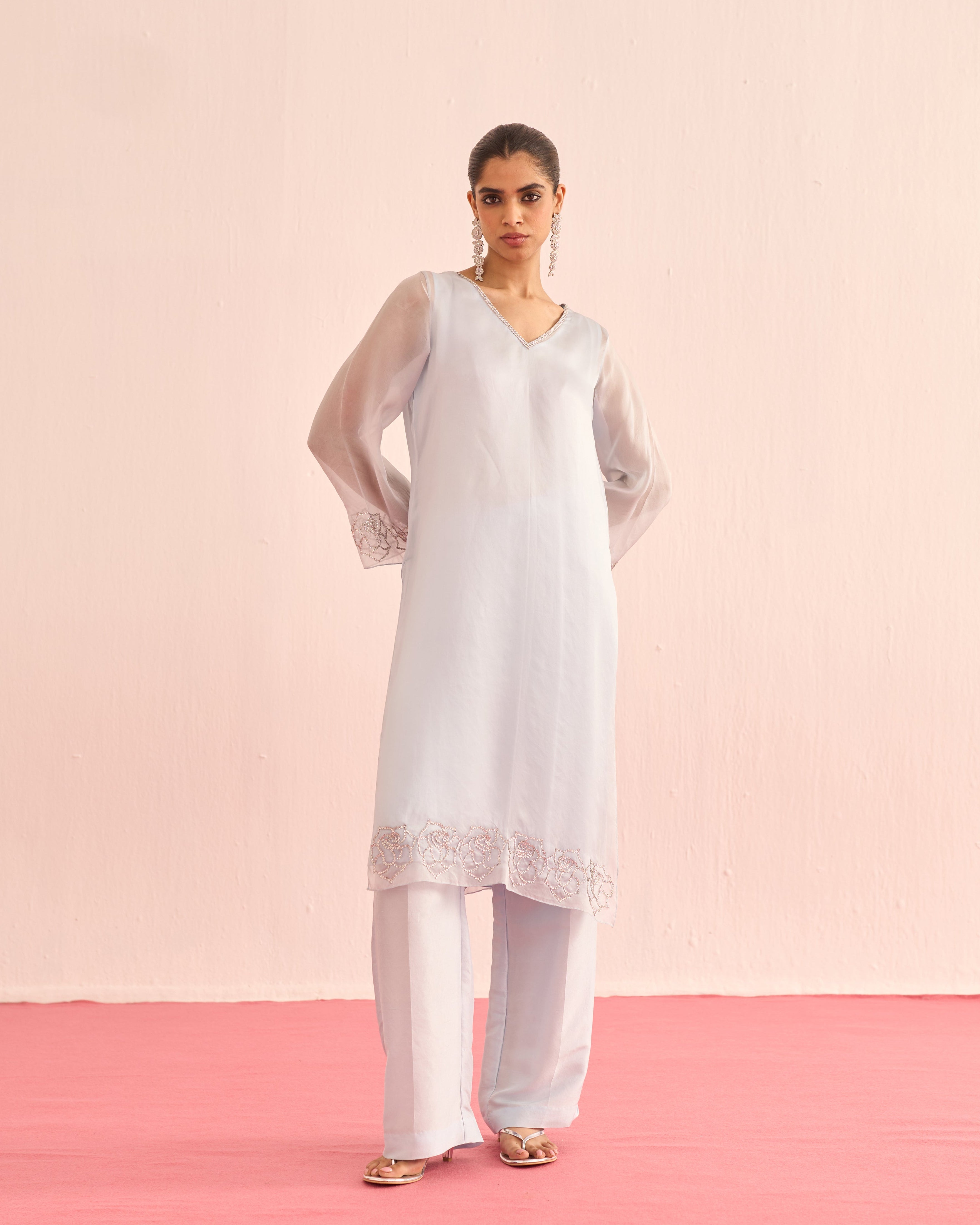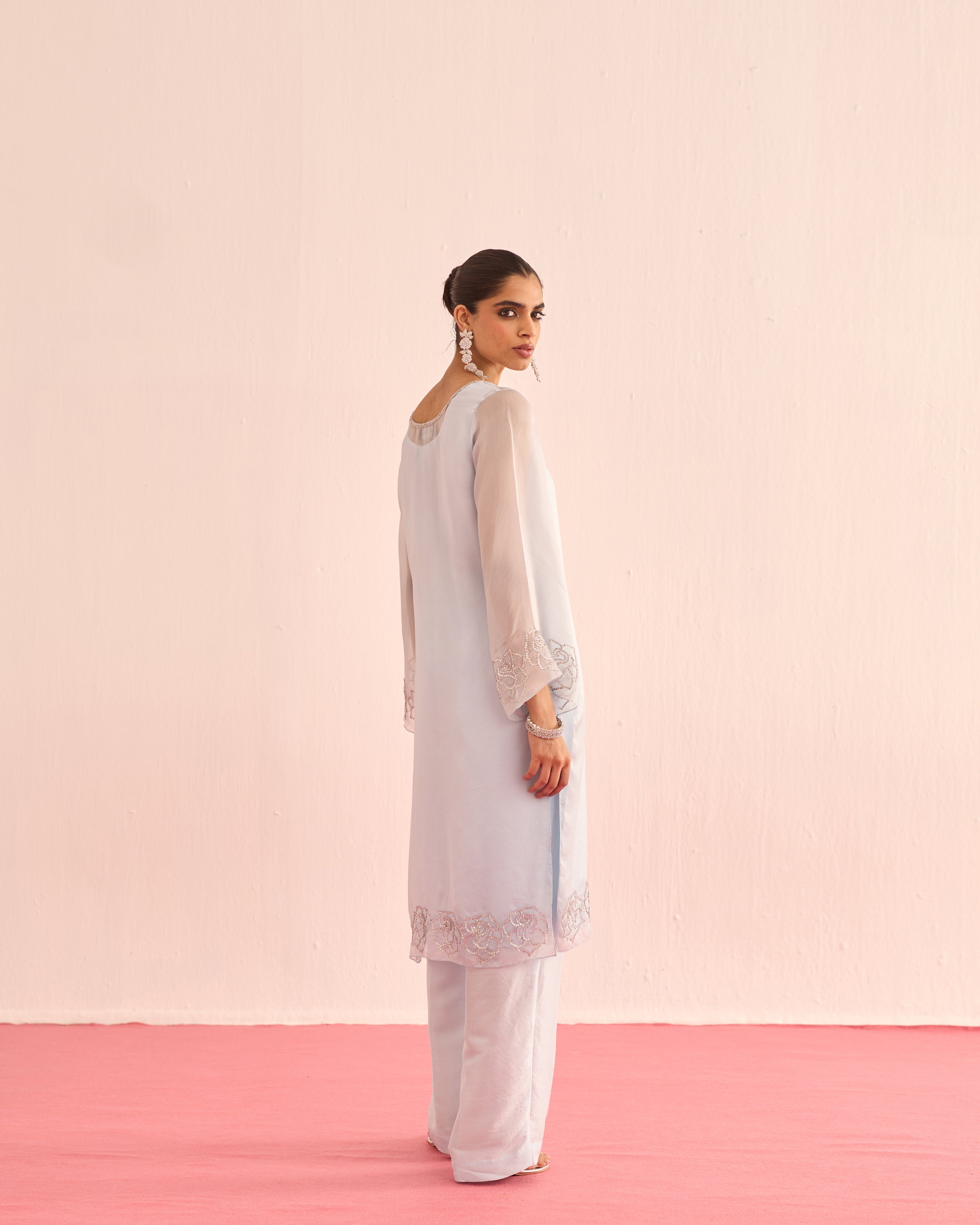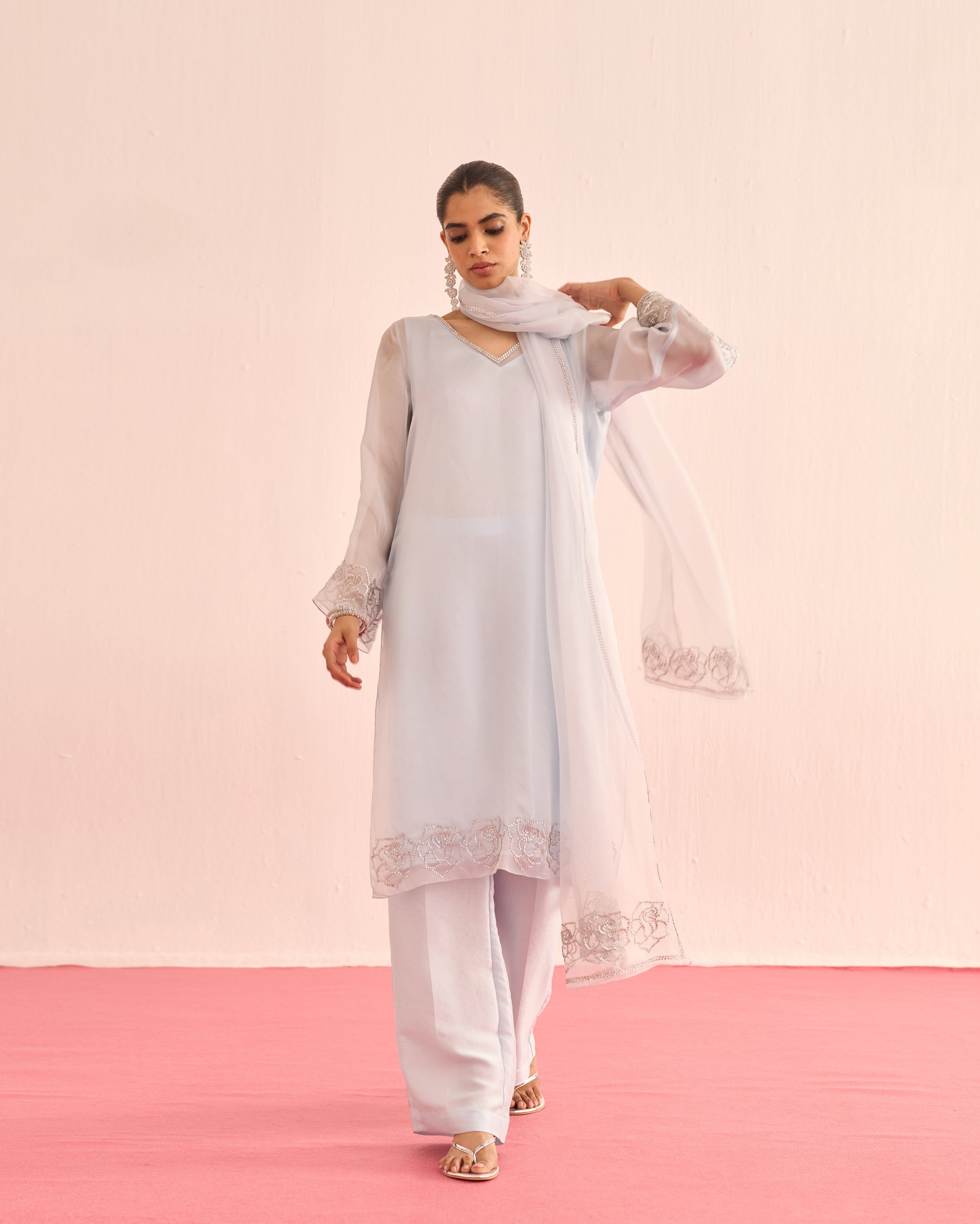 A cool blue organza set, featuring a sheer shirt and dupatta delicately hand-embellished with crystals for a soft, luminous sparkle. Finished with satin lining and tailored satin pants, this ensemble blends ethereal elegance with understated luxury.