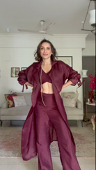 Structured organza trench with crystal definition along the lapel and tie-up detailing along the wrist with belt. Full set includes bustier and boot cut style pants.