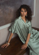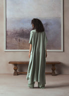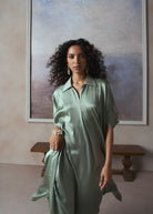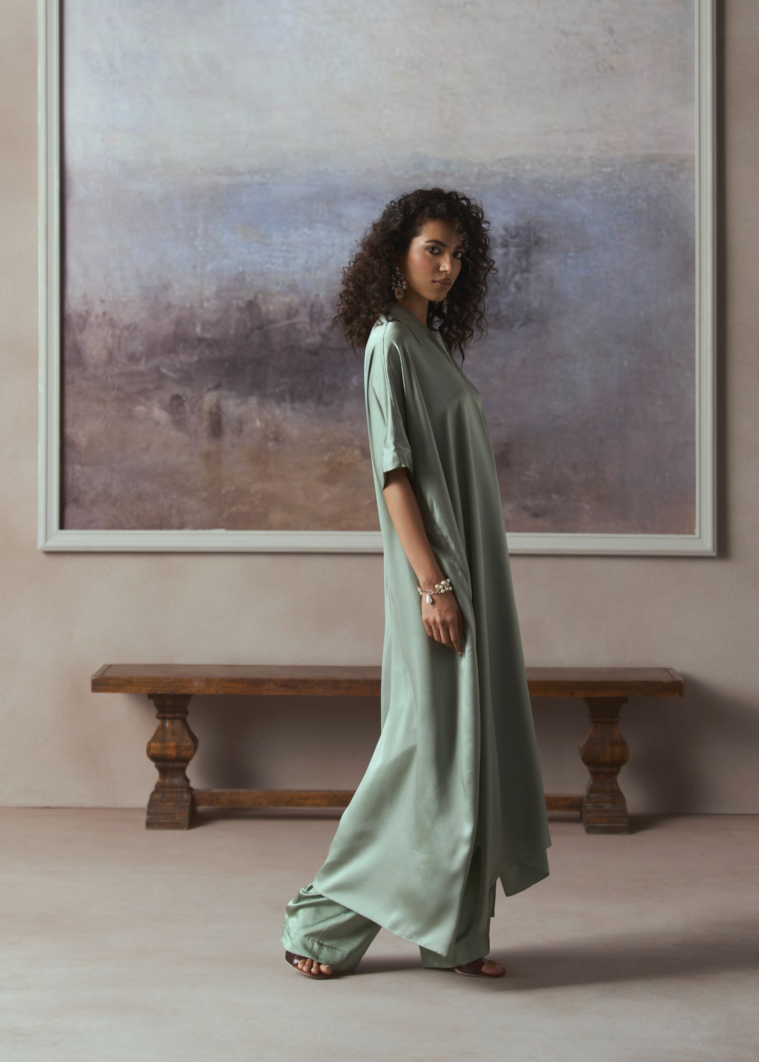 Kaftan style free flowing shirt with side slits paired with pallazo pants.