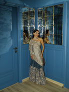 Delicately crafted with dori work and hand encrusted sequins, crystals. The set consists of a one side off-shoulder organza top and velvet sharara.