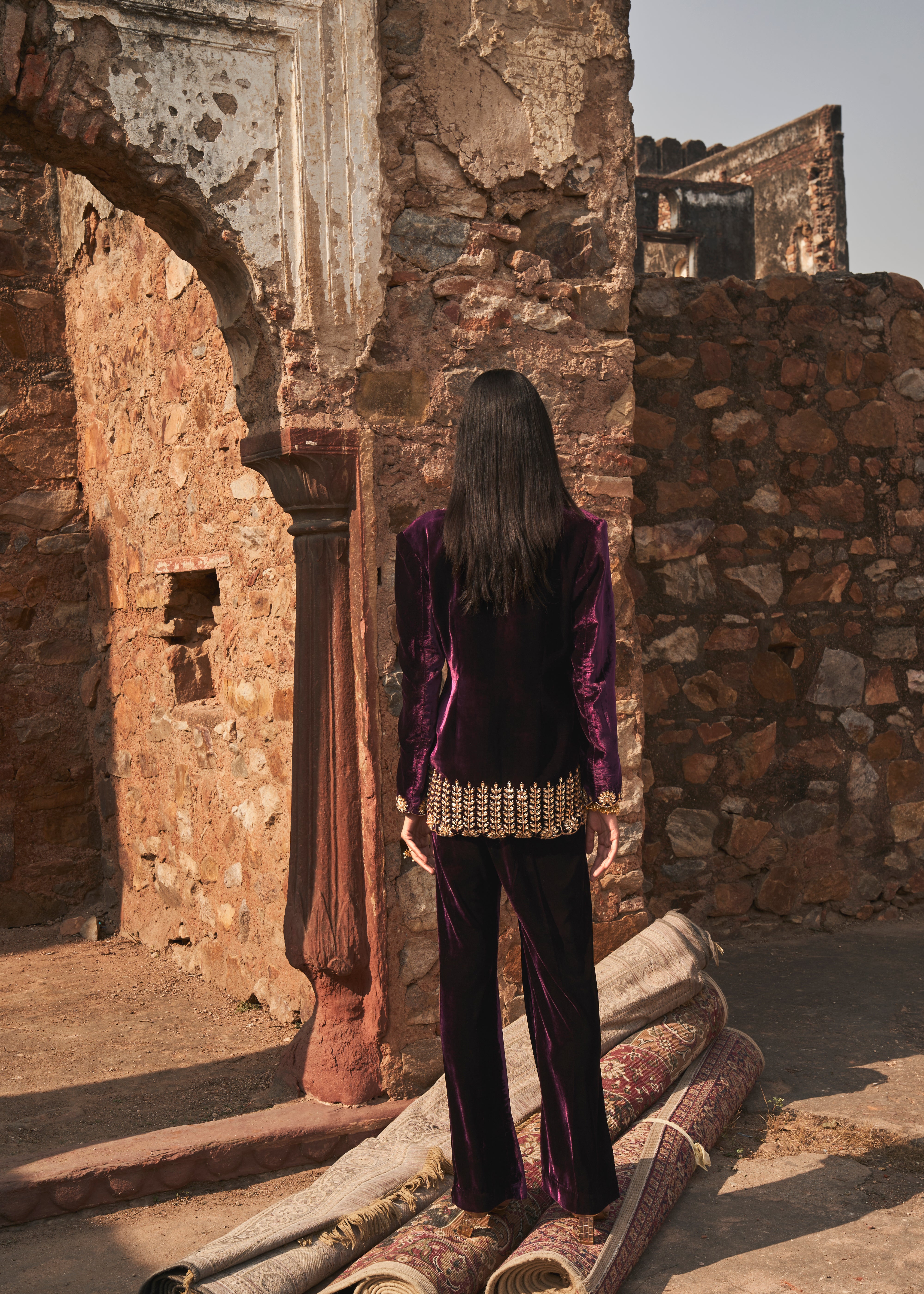 Zari and swarovski stone embellished velvet blazer with boot cut velvet trousers.