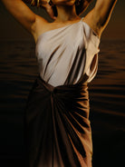 One side off shoulder top with rhinestone strap detailing with skirt for draping.