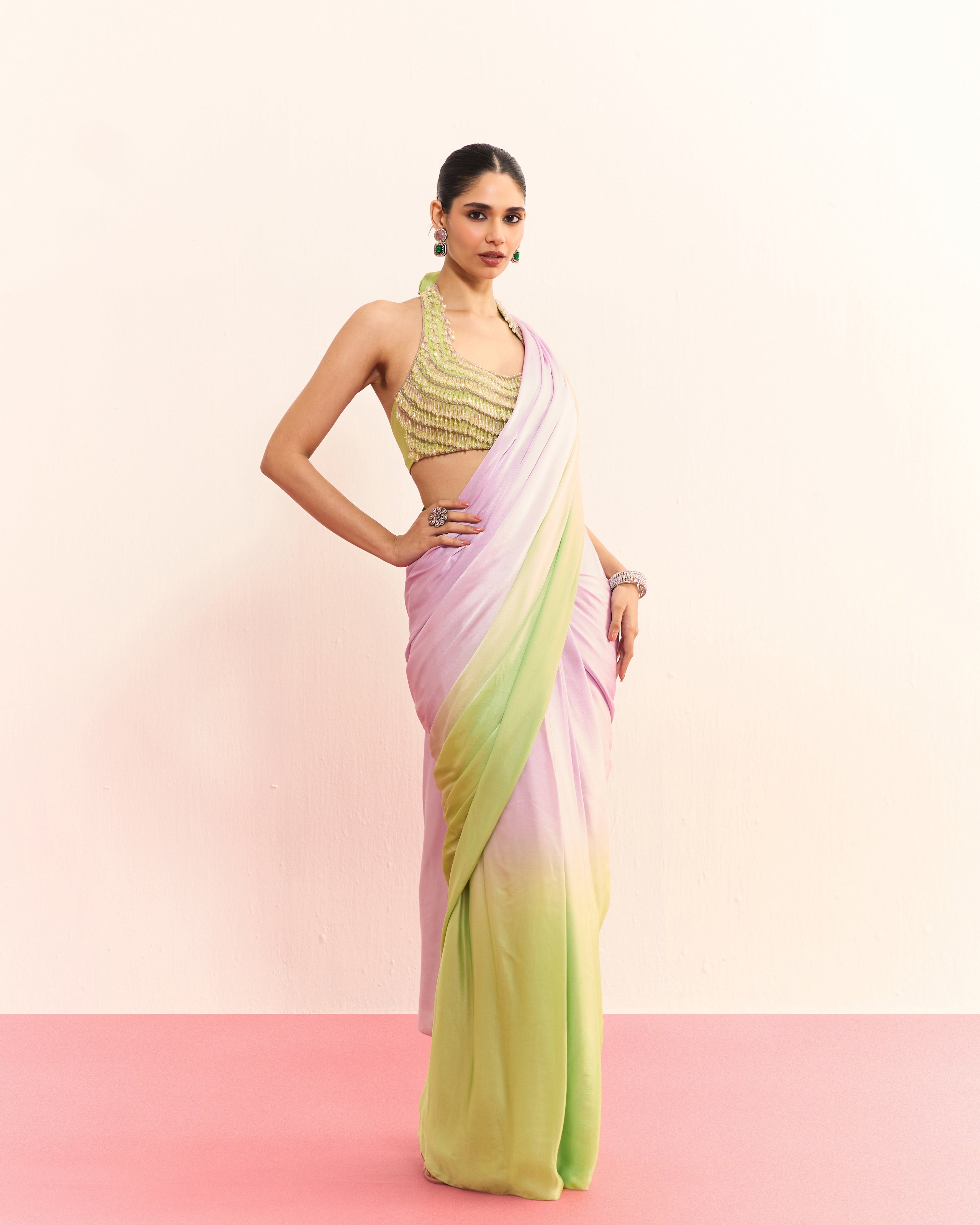 Soft lavender touched with green freshness- shaded lustrous satin pre-draped skirt, teamed with multi coloured crystal embellished halter blouse.
