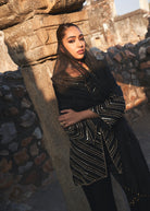 An organza shirt with sequin, swarovski, cut-dana and pearl embroidery paired with satin pants and duppata.