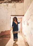 Sequin, cut-dana and swarovski scallop detailing on velvet shirt and pants.