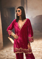 Sequin, cut-dana and swarovski scallop detailing on velvet shirt and pants.