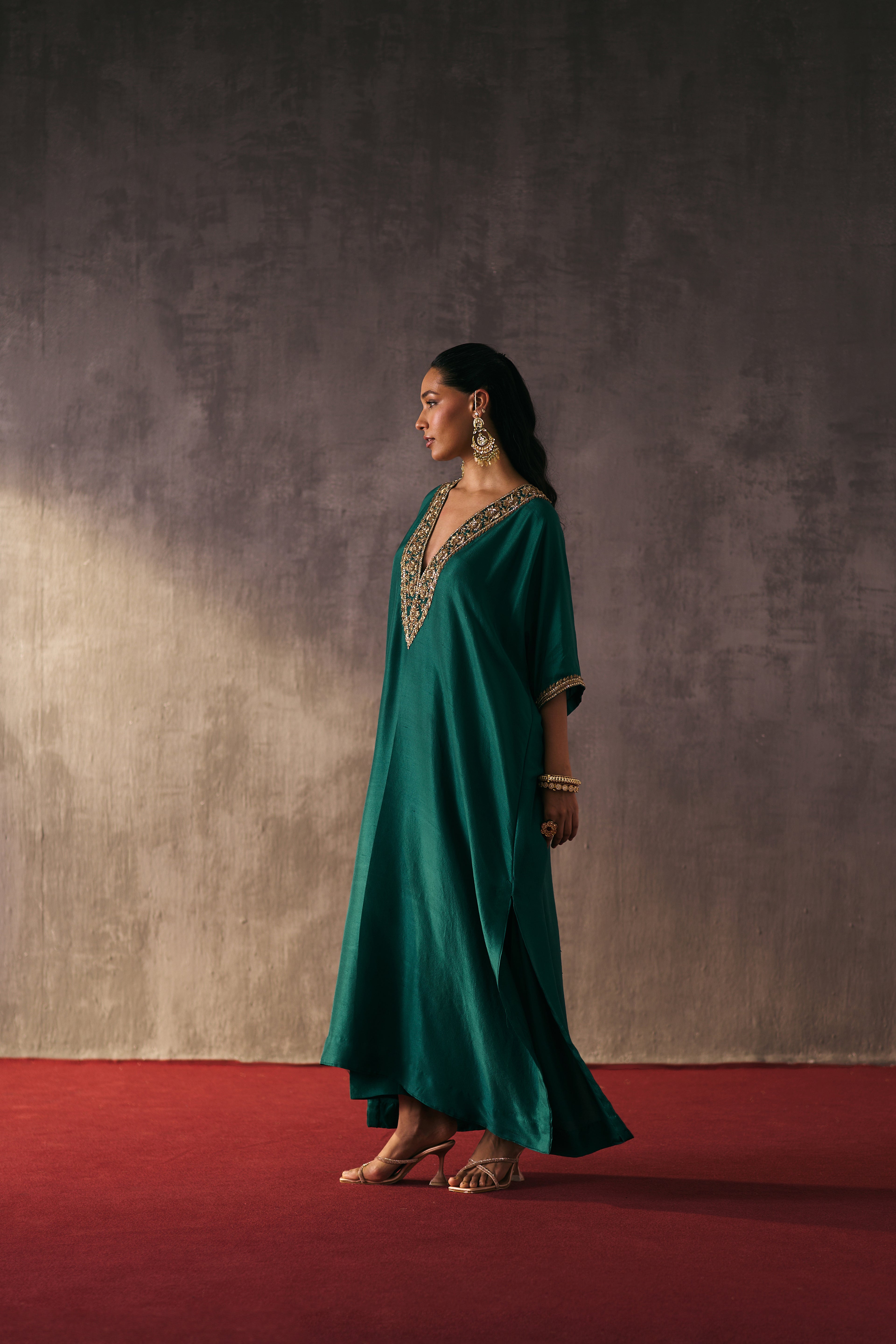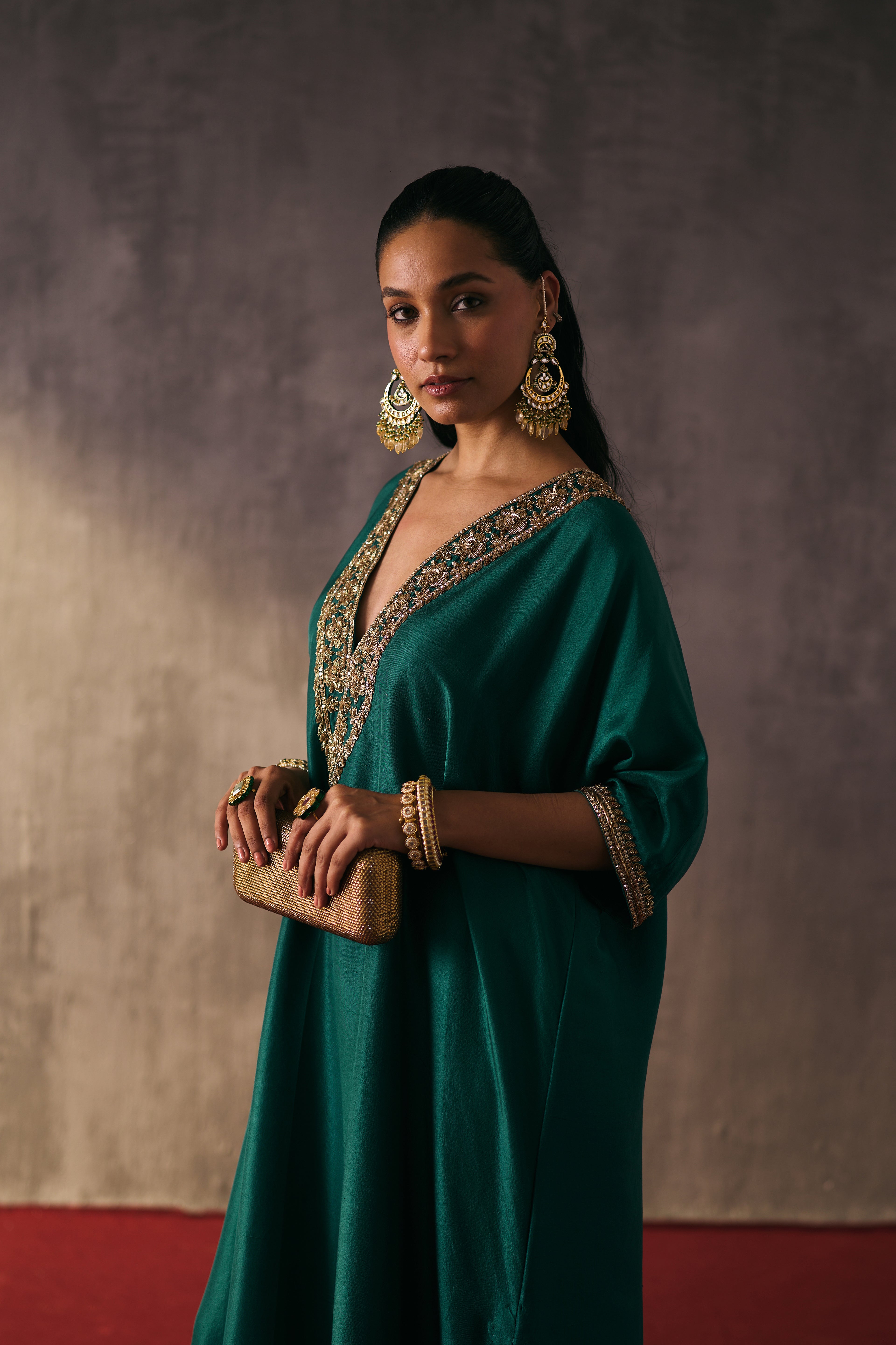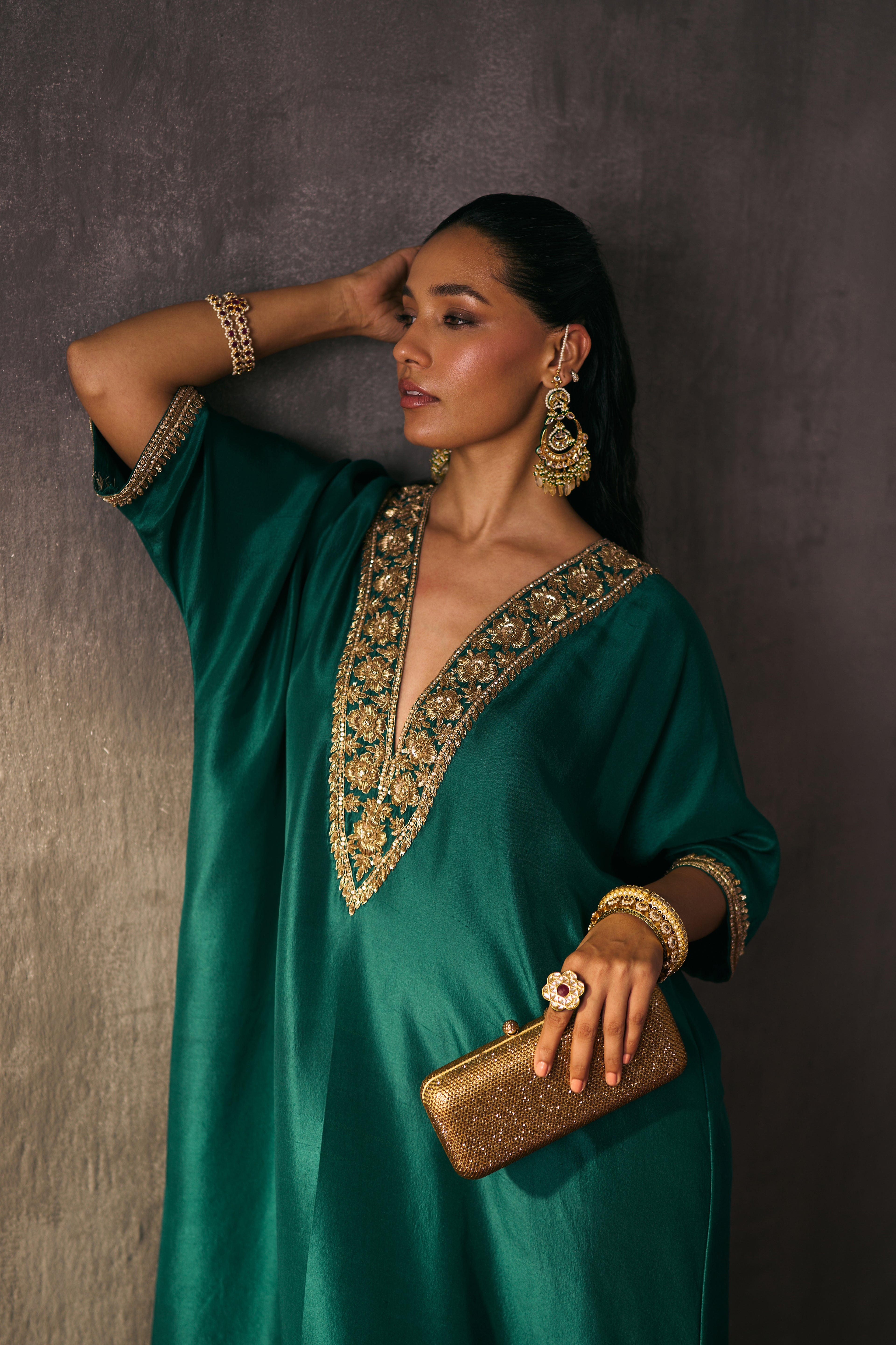 Crafted in pure silk, these flowy, loose-fit kaftans come paired with straight pants — a silhouette of modern ease. Hand-embellished with zari, dapka, and delicate glass accents, each piece is a work of art designed for festive evenings and timeless celebrations.