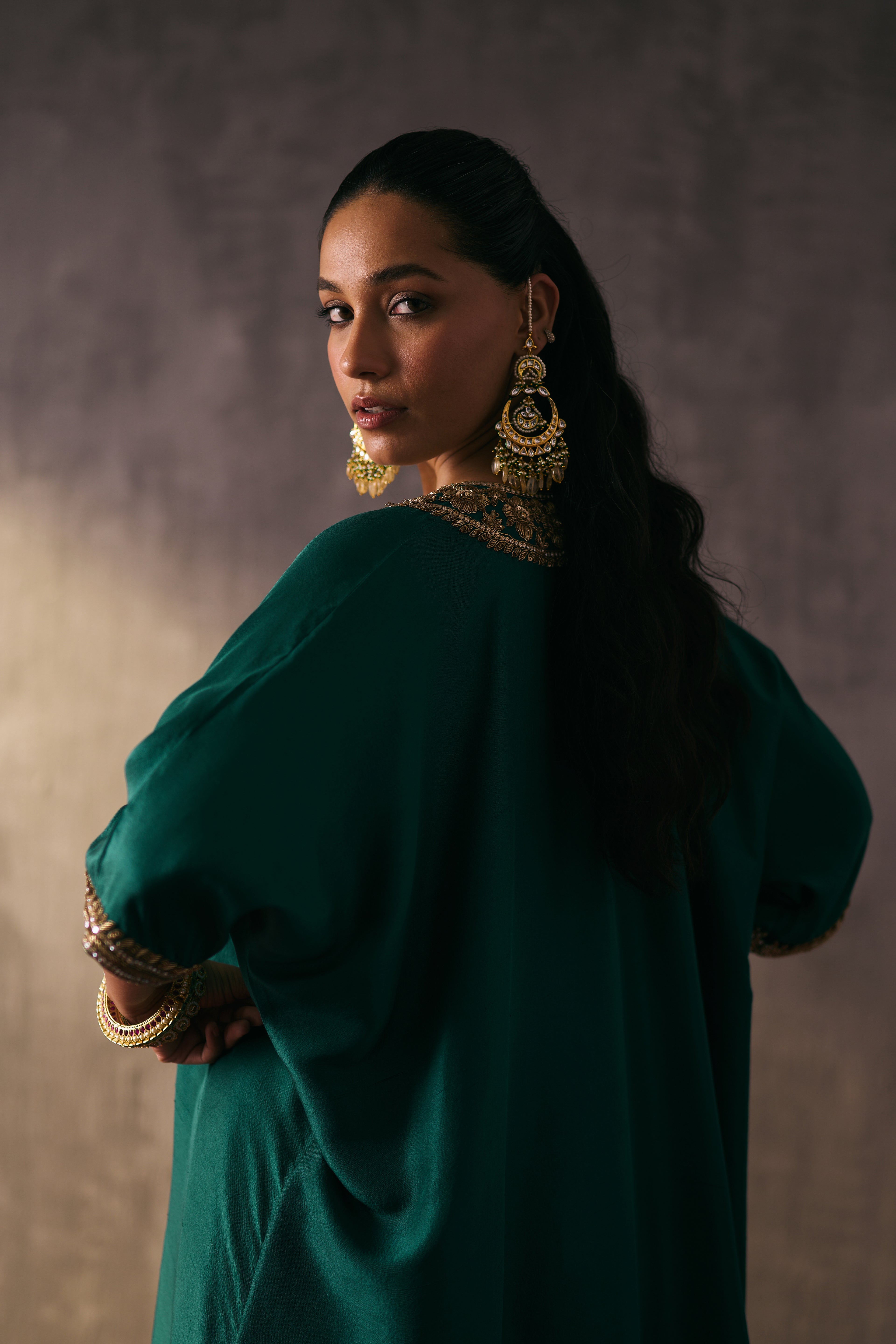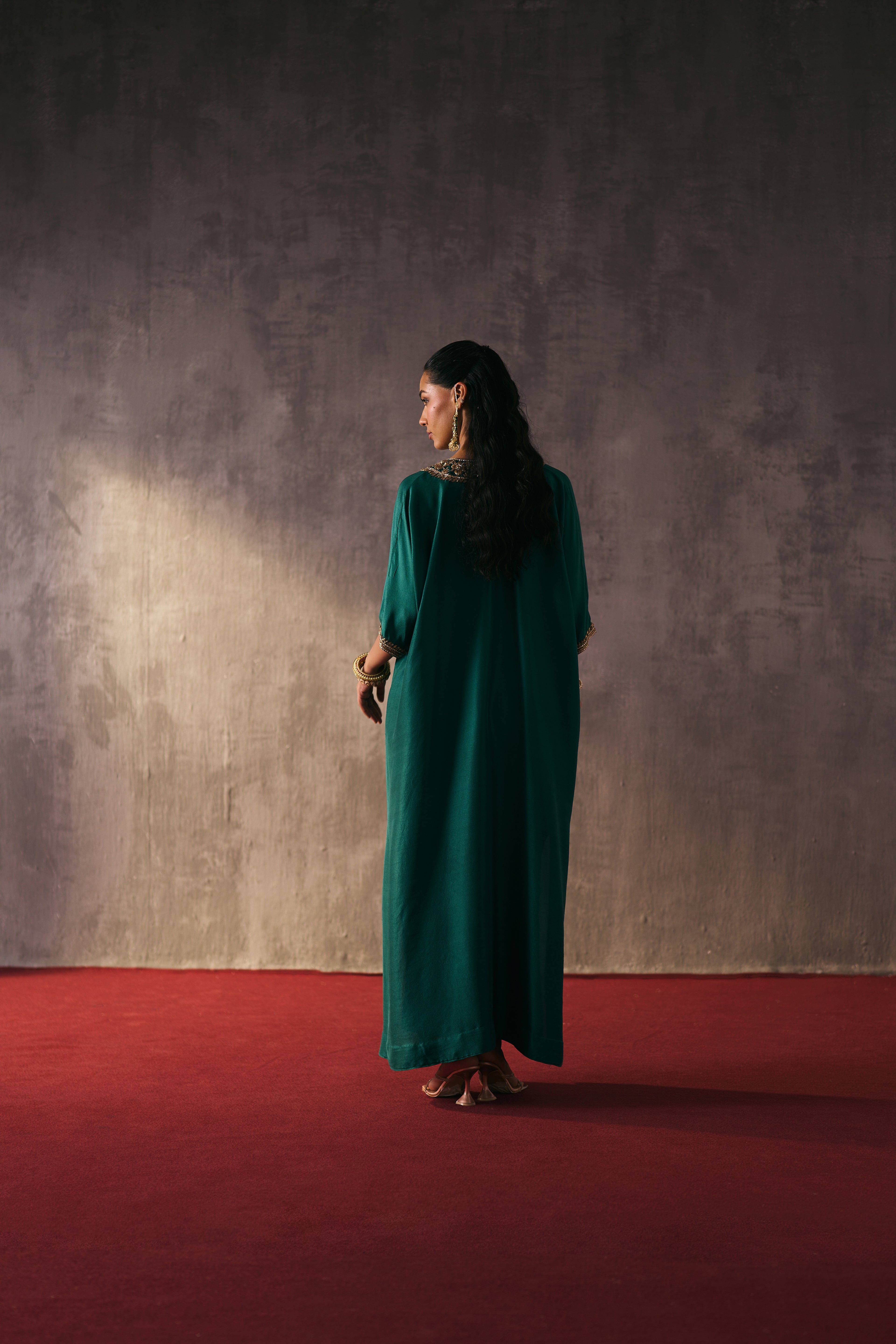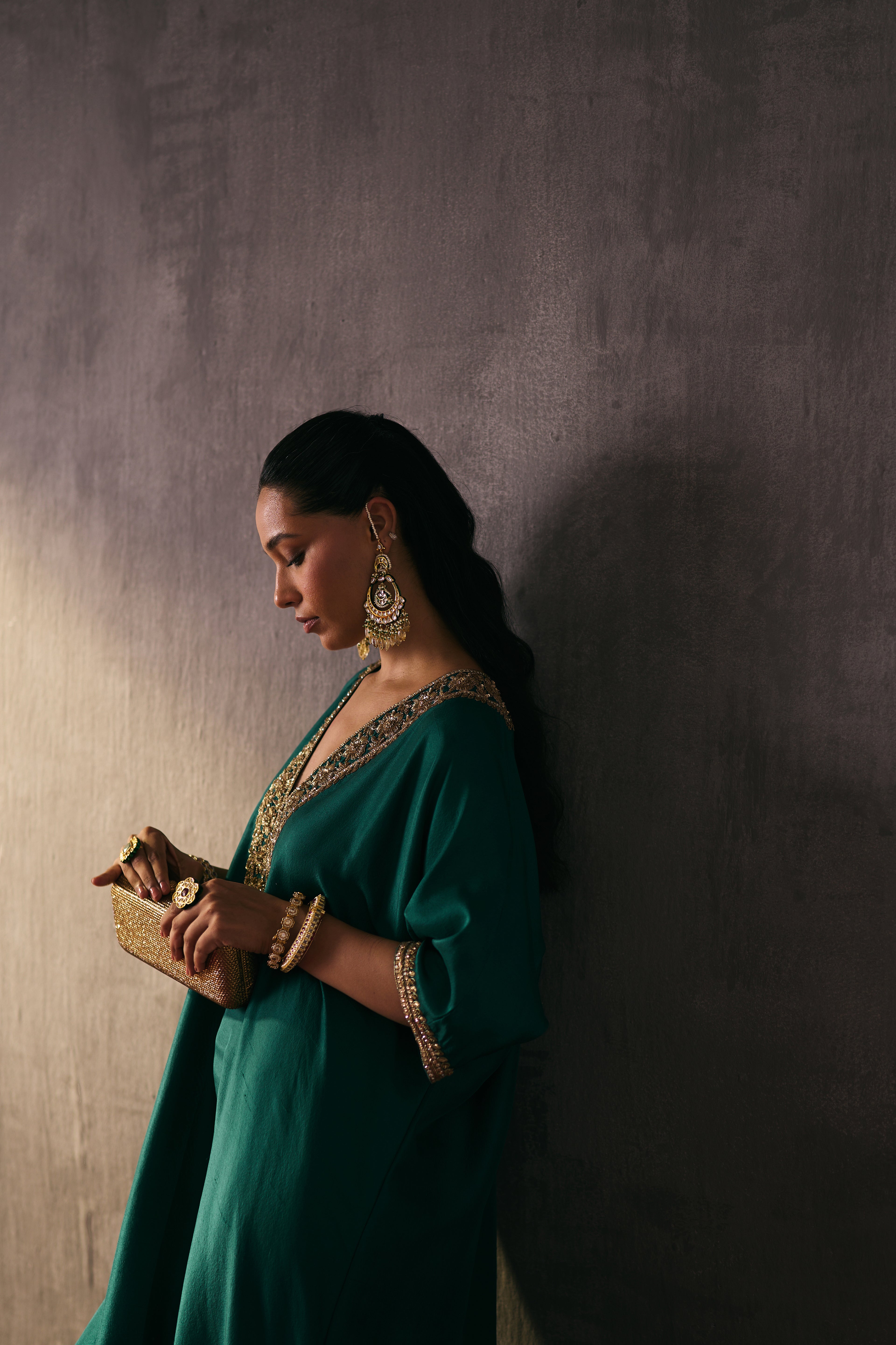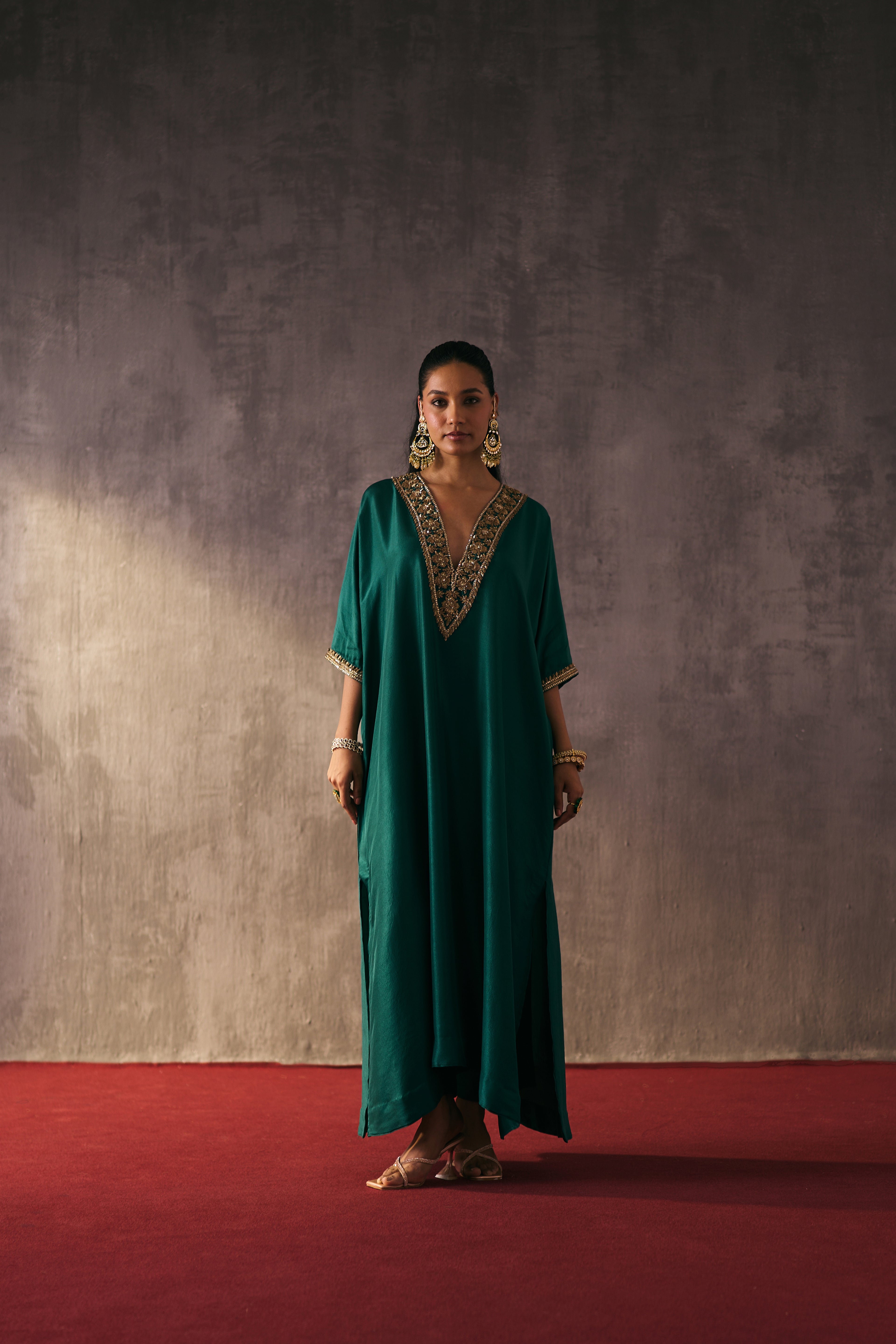 Crafted in pure silk, these flowy, loose-fit kaftans come paired with straight pants — a silhouette of modern ease. Hand-embellished with zari, dapka, and delicate glass accents, each piece is a work of art designed for festive evenings and timeless celebrations.