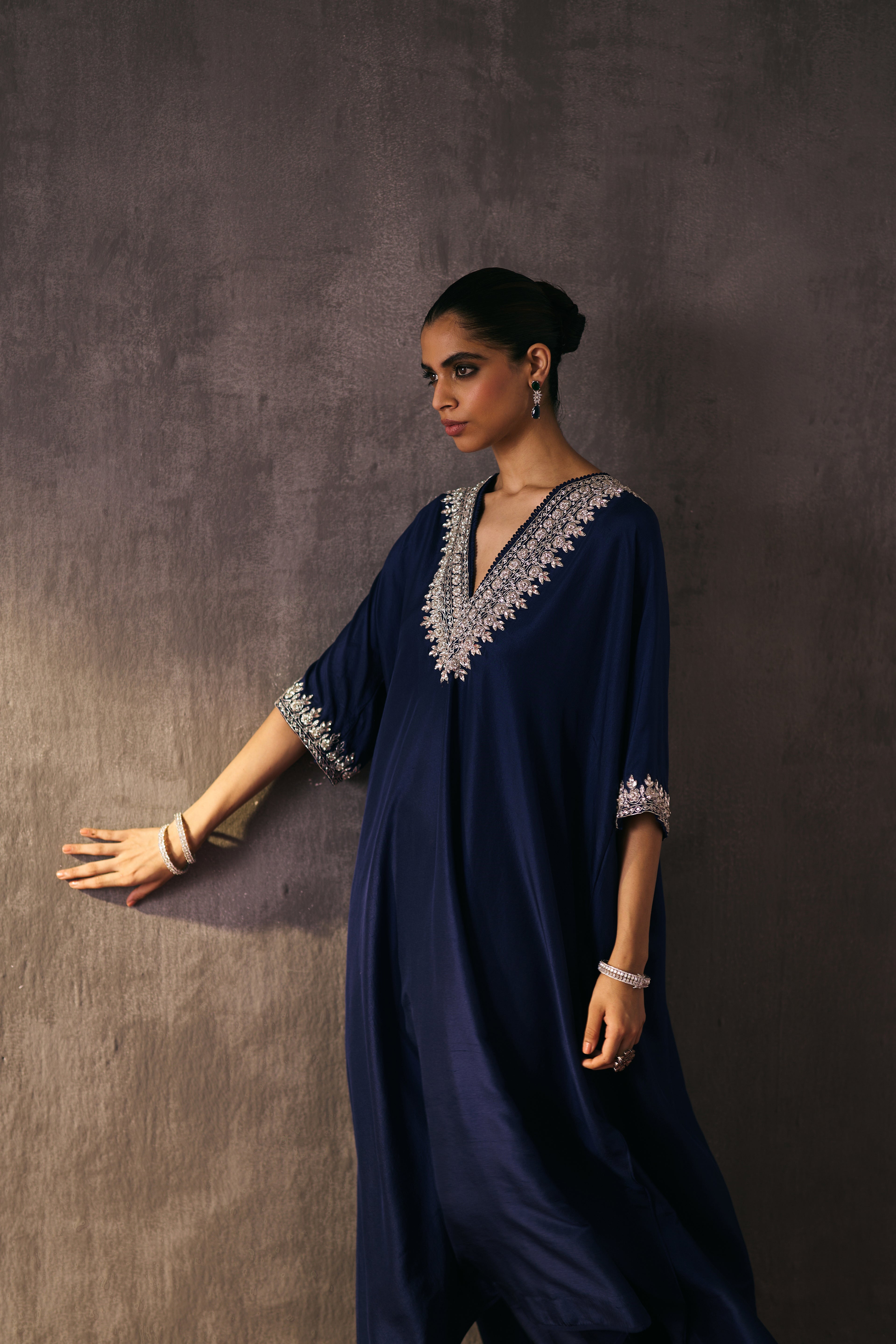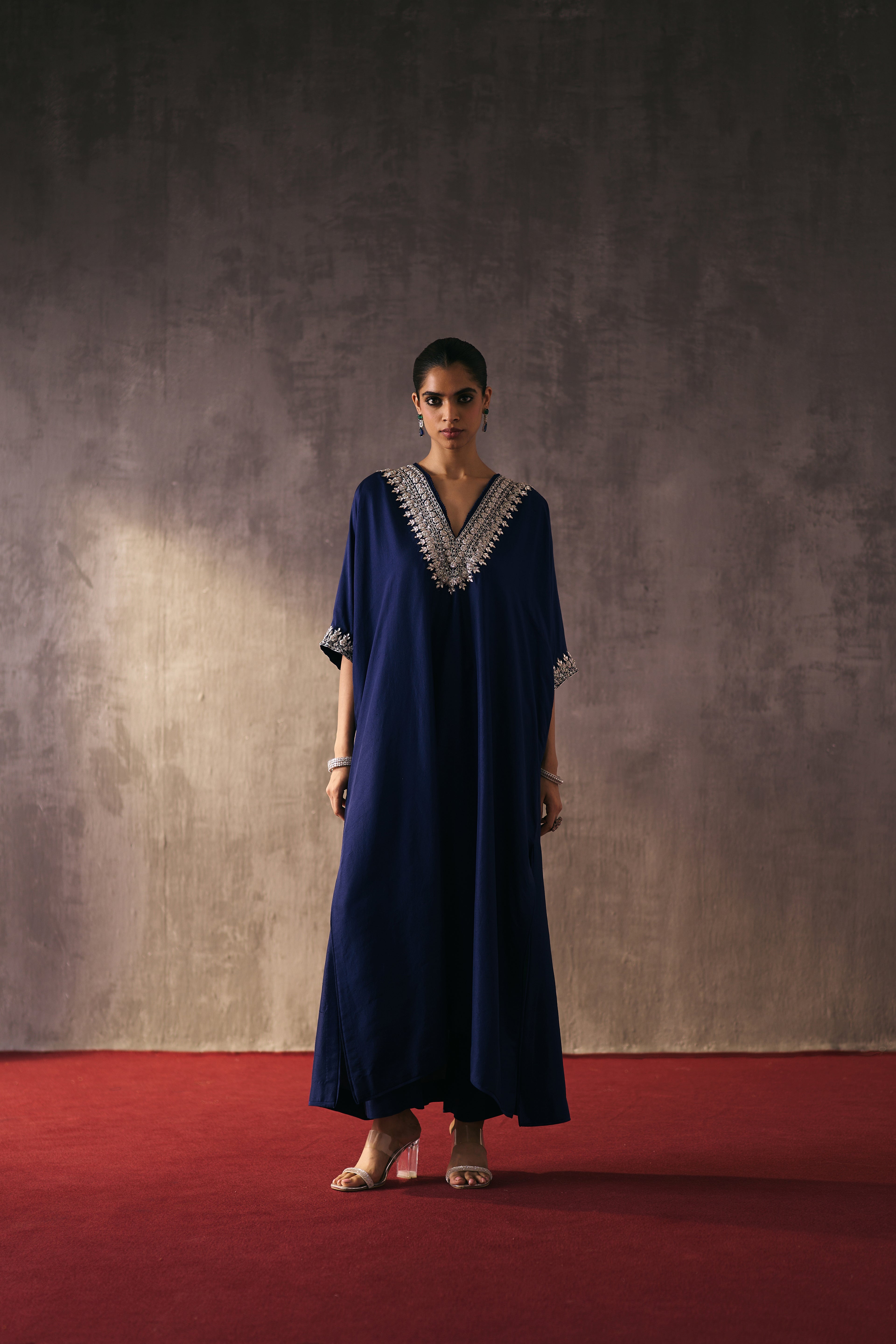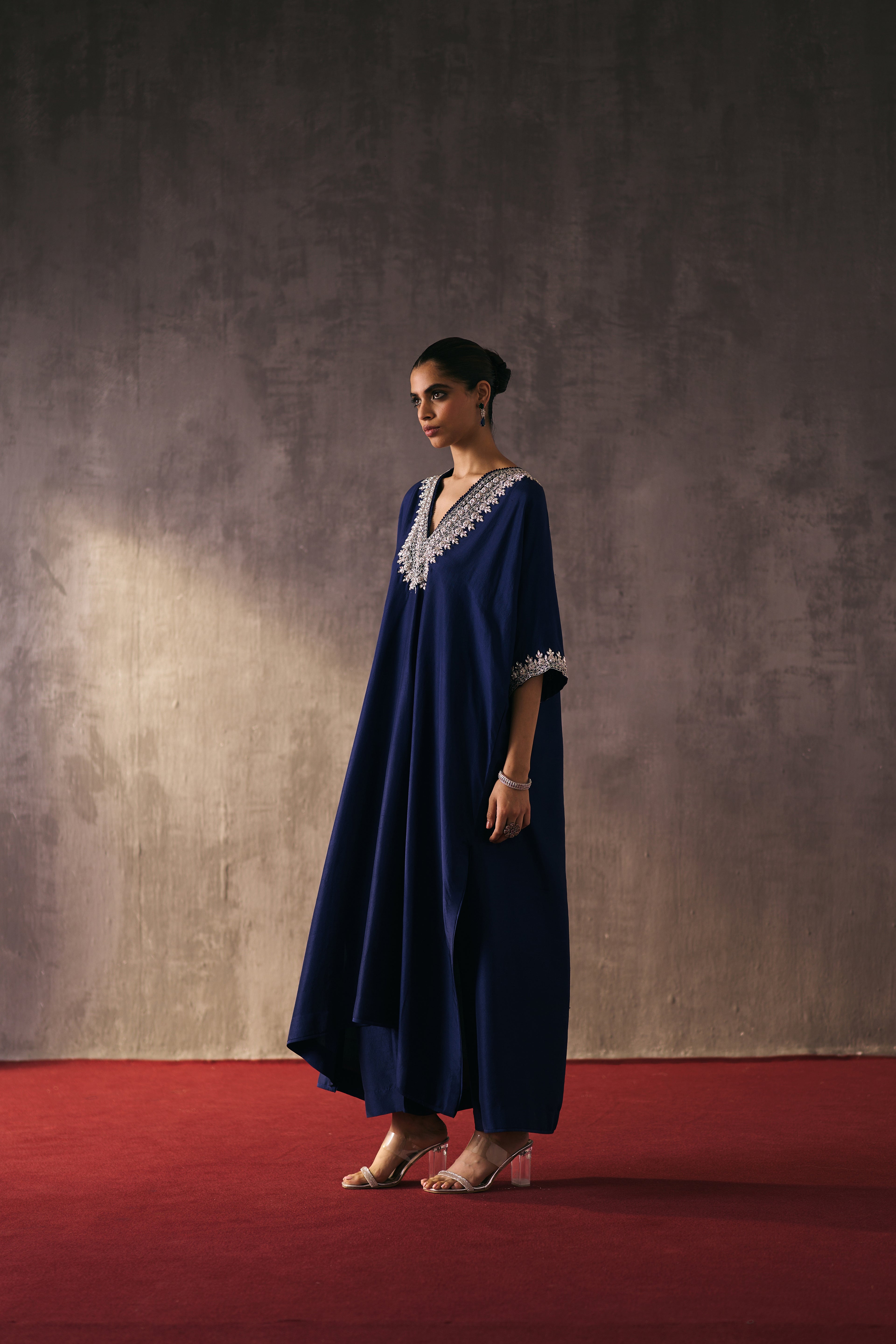 Crafted in pure silk, these flowy, loose-fit kaftans come paired with straight pants — a silhouette of modern ease. Hand-embellished with zari, dapka, and delicate glass accents, each piece is a work of art designed for festive evenings and timeless celebrations.
