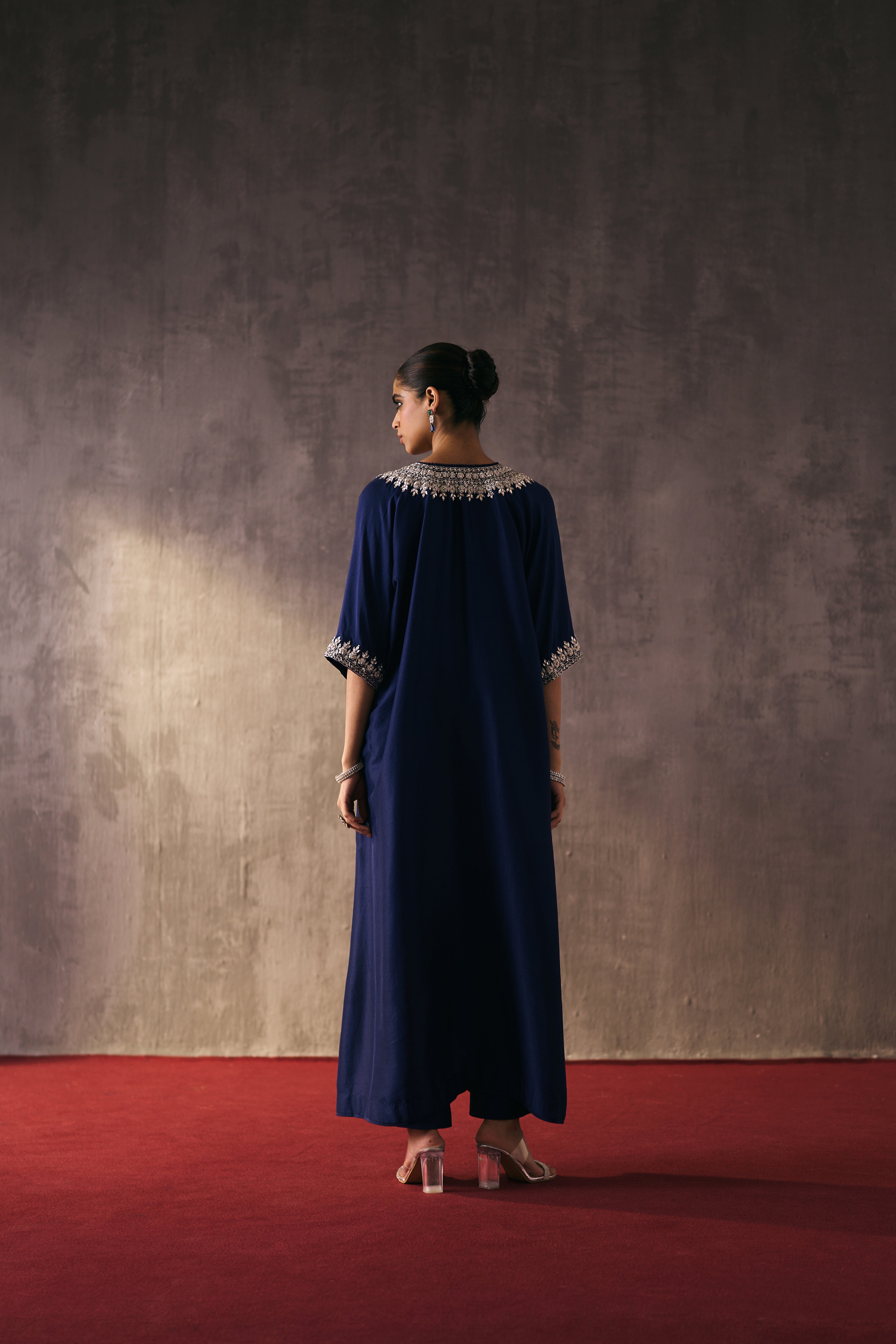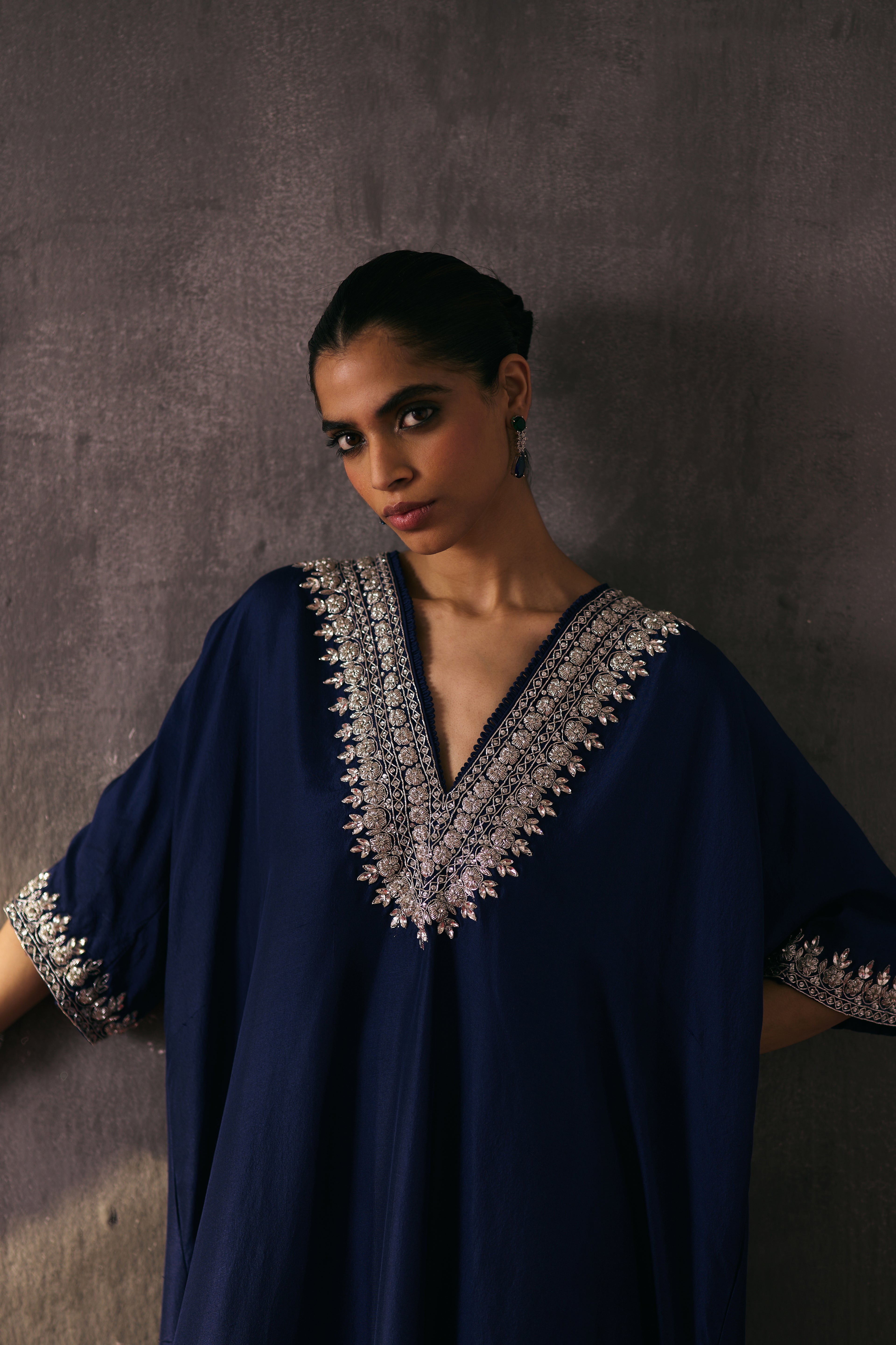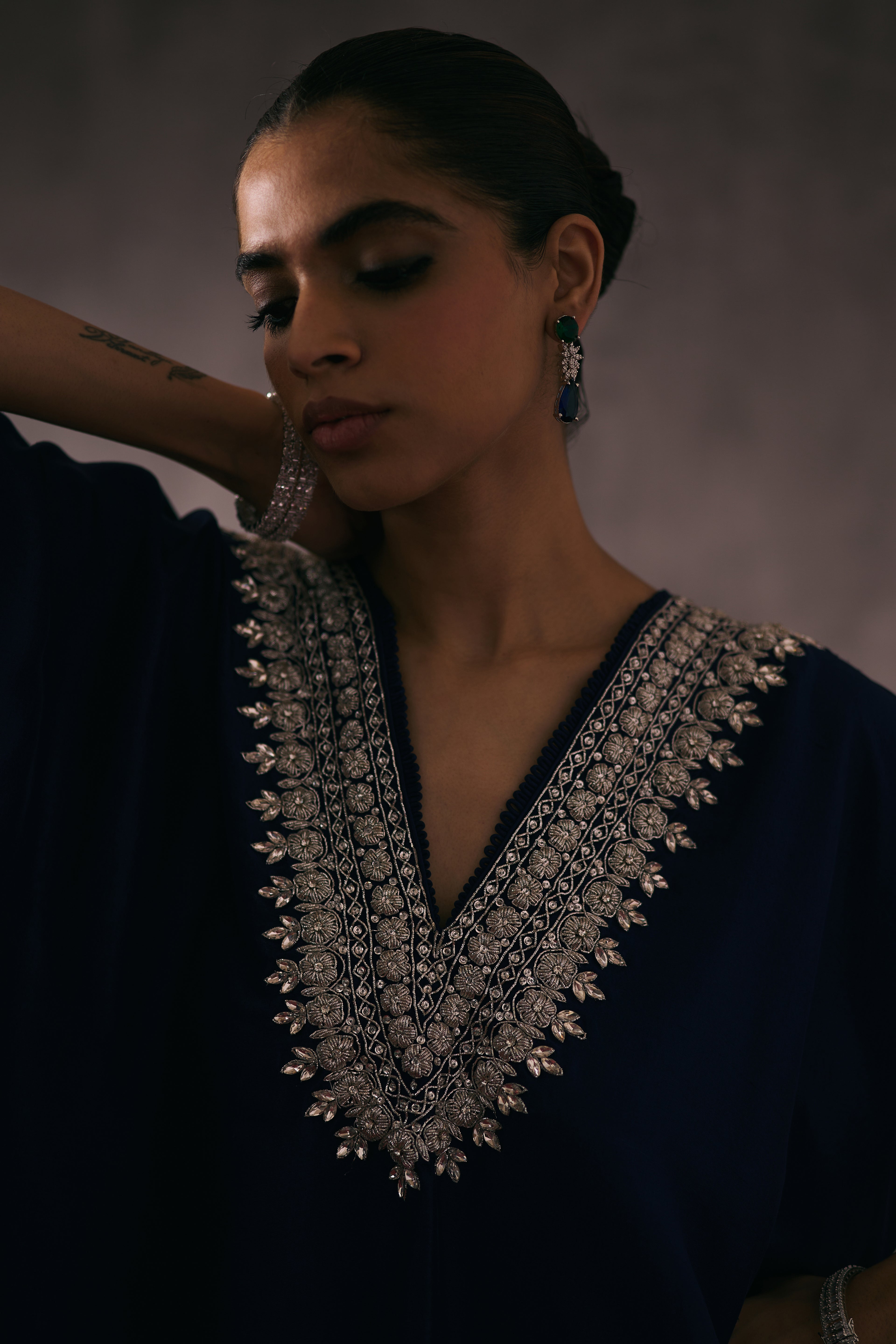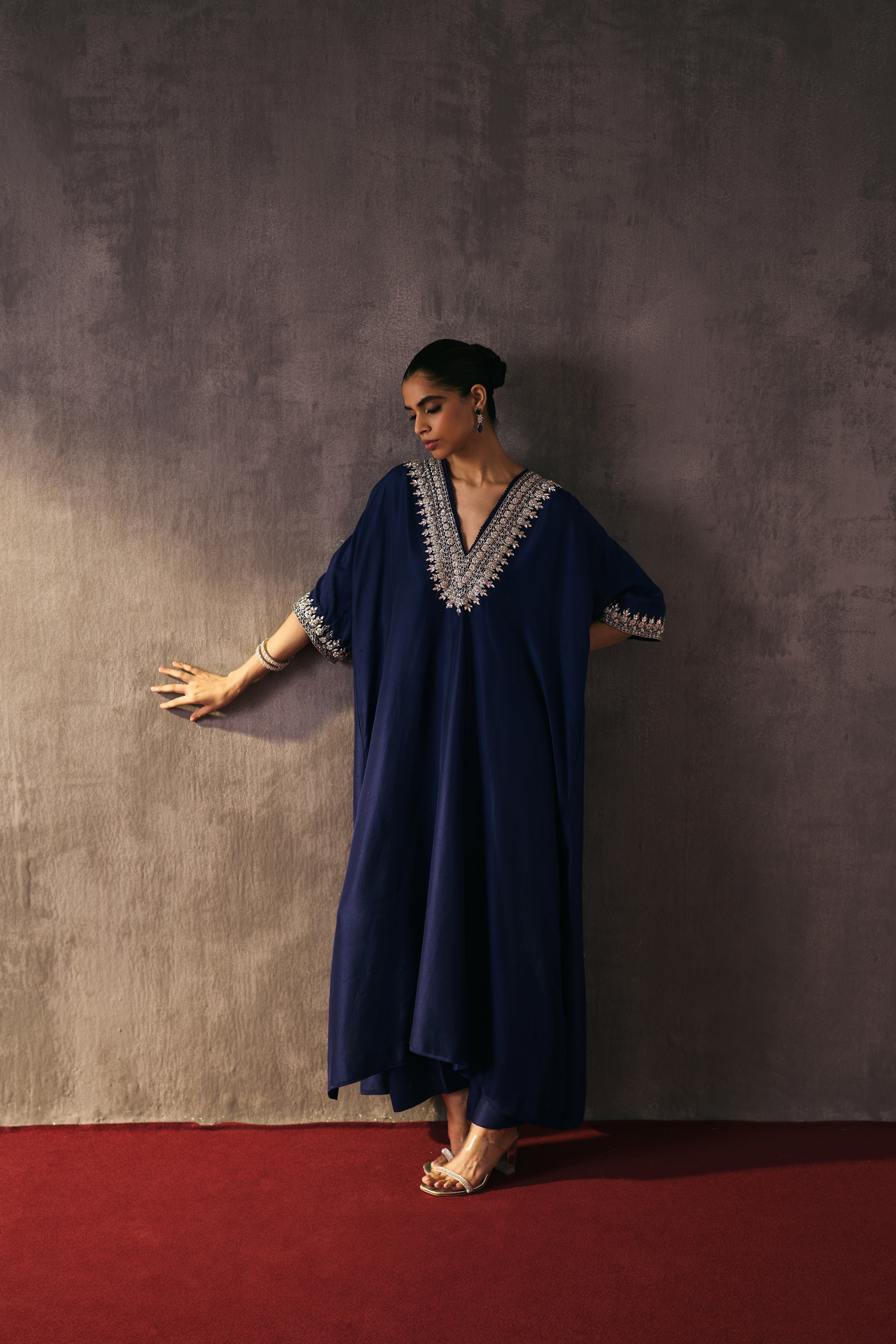 Crafted in pure silk, these flowy, loose-fit kaftans come paired with straight pants — a silhouette of modern ease. Hand-embellished with zari, dapka, and delicate glass accents, each piece is a work of art designed for festive evenings and timeless celebrations.
