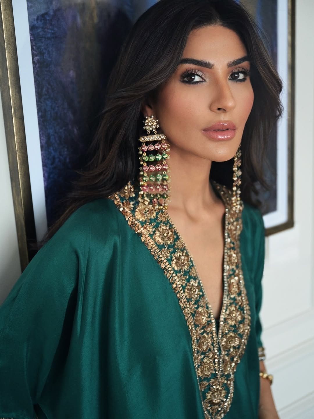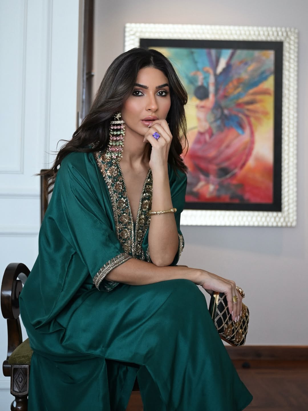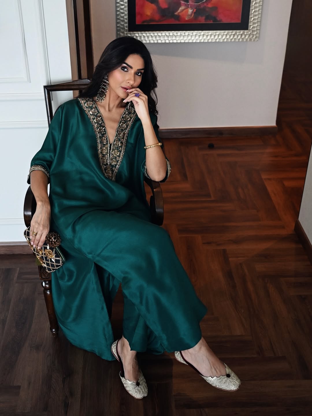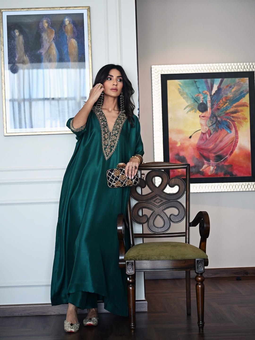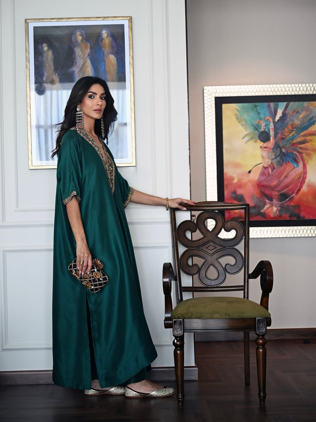 Crafted in pure silk, these flowy, loose-fit kaftans come paired with straight pants — a silhouette of modern ease. Hand-embellished with zari, dapka, and delicate glass accents, each piece is a work of art designed for festive evenings and timeless celebrations.