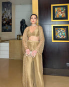 Organza cape jacket with hand embellishments. Silk bustier and boot cut trousers.