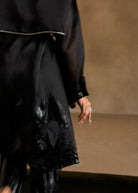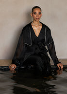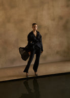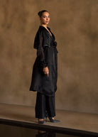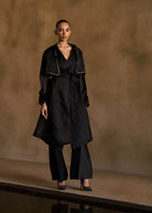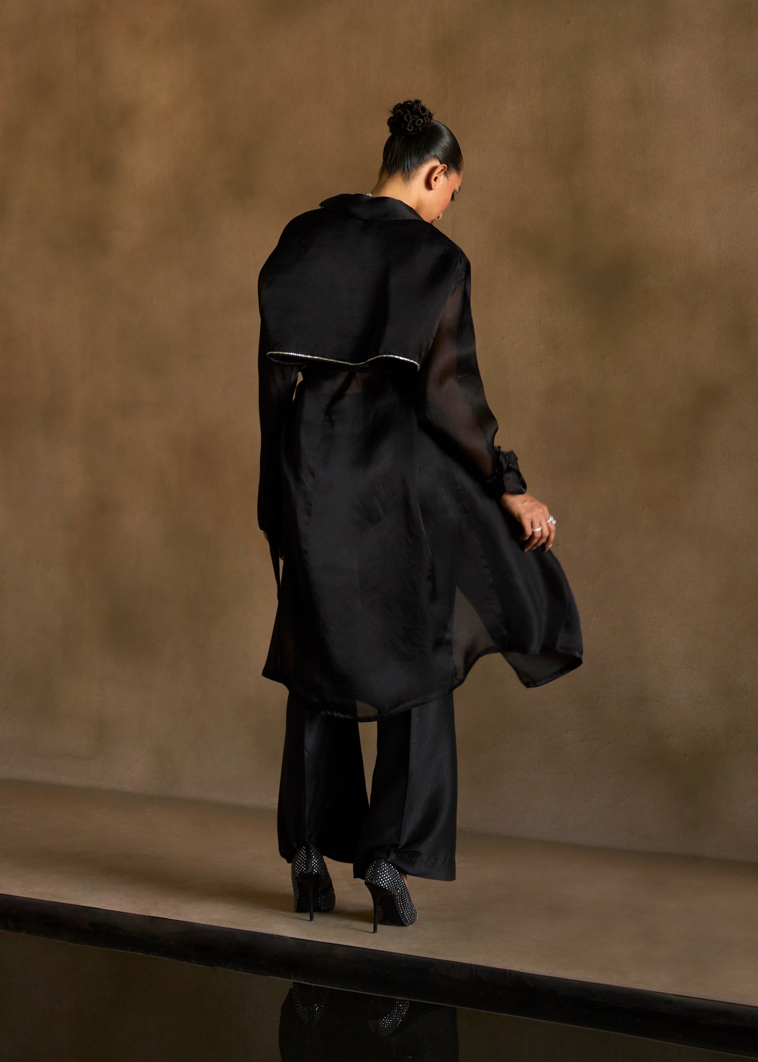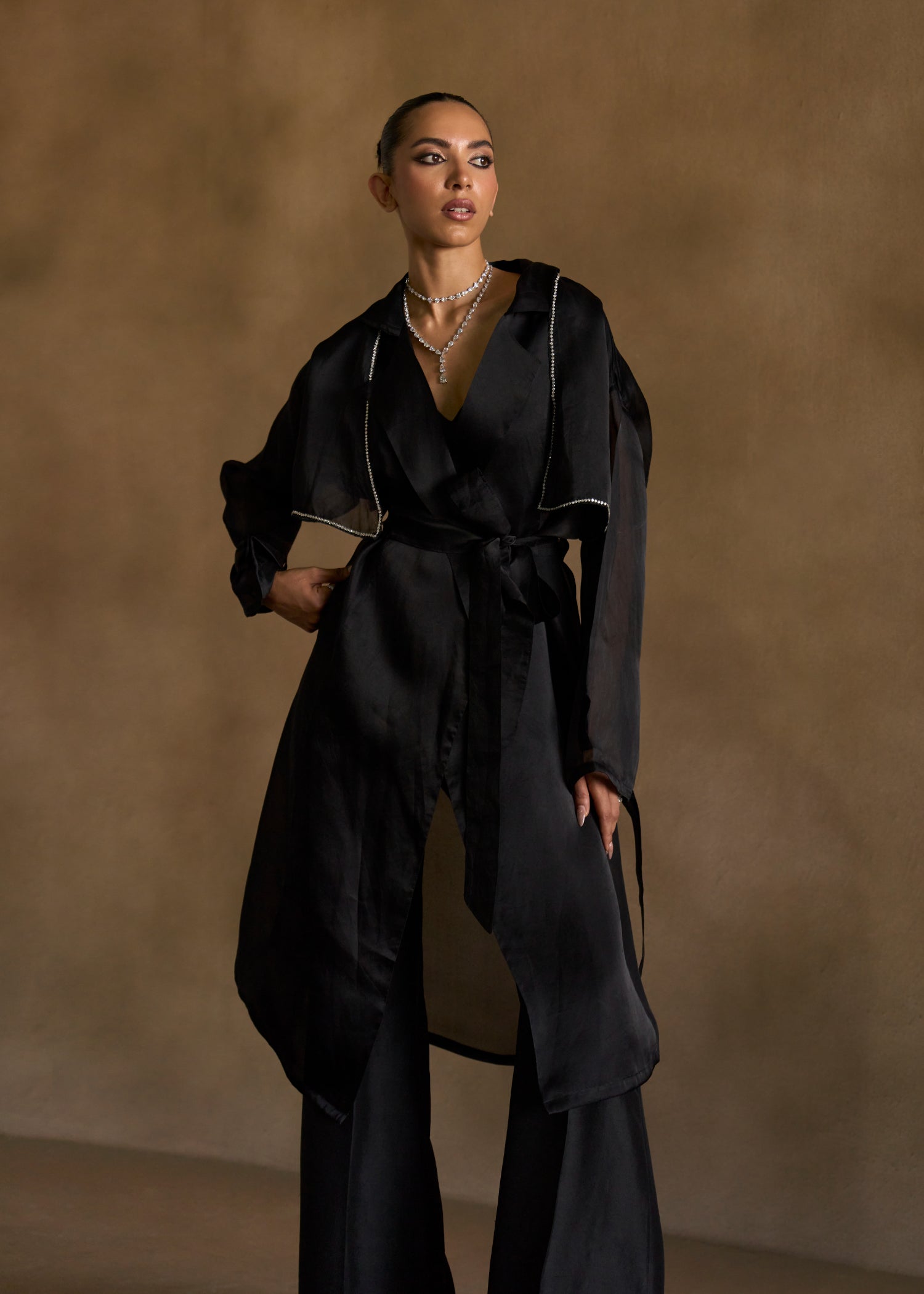 Structured organza trench with crystal definition along the lapel and tie-up detailing along the wrist with belt. Full set includes bustier and boot cut style pants.