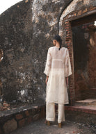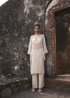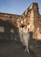 An organza shirt with swarovski and pearl embroidery paired with satin pants and duppata.