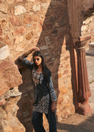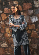 Sequin, cut-dana and swarovski stone detailing on velvet shirt and pants. This is a two piece set.