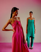 Halter neck with twisted rhinestone detailing draped dress.