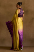 Rich mustard and puple ombre shaded lustrous satin pre-draped skirt, teamed with halter neck blouse, encrusted with rectangle sequin and crystals.