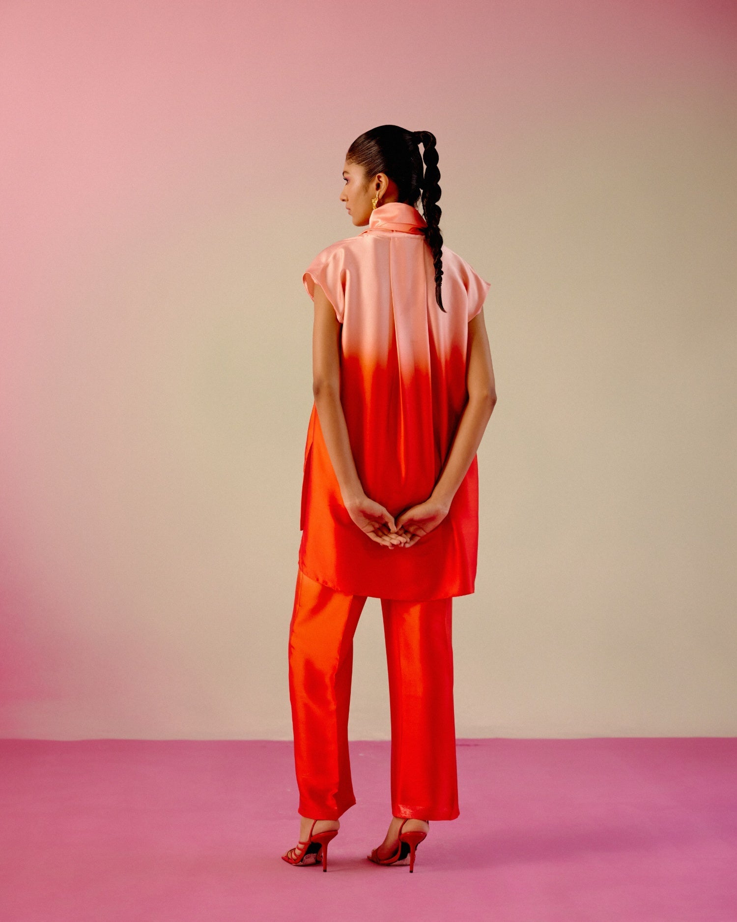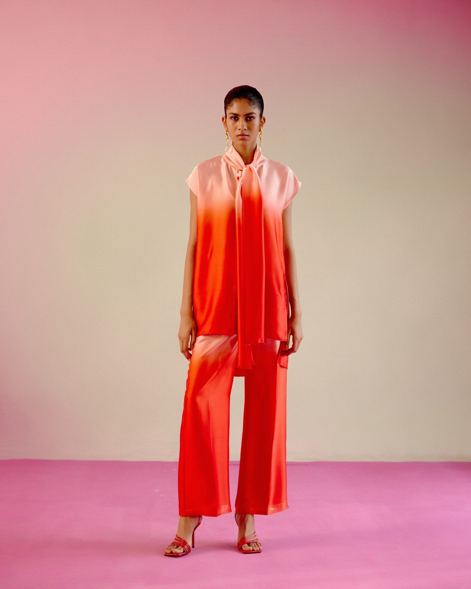 Ombré button-down scarf-collar shirt with crystal hand detailing paired with matching pants with front seam.
